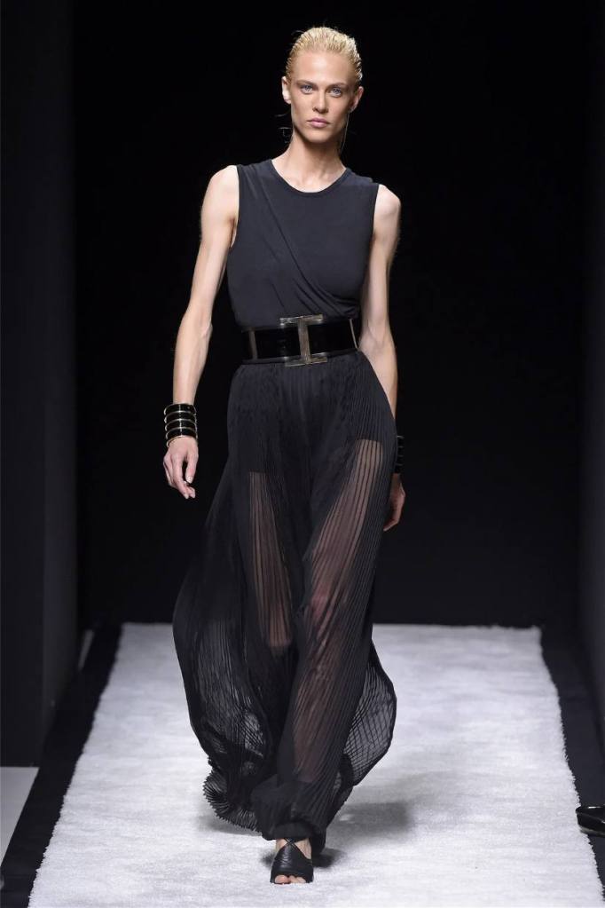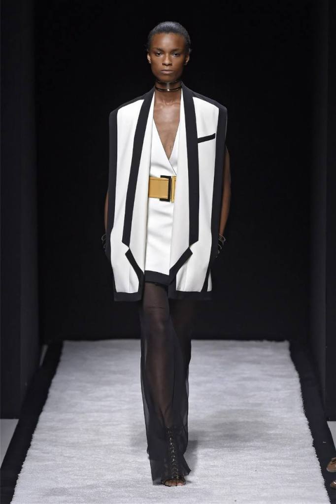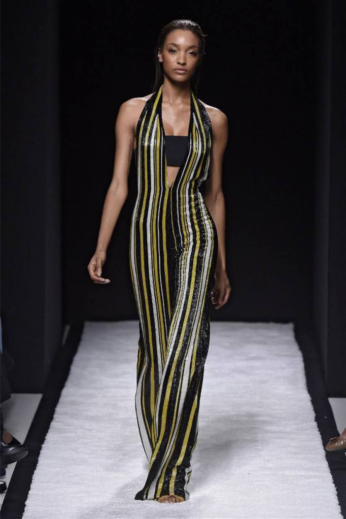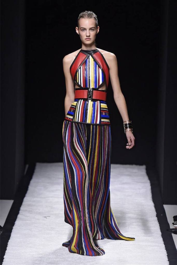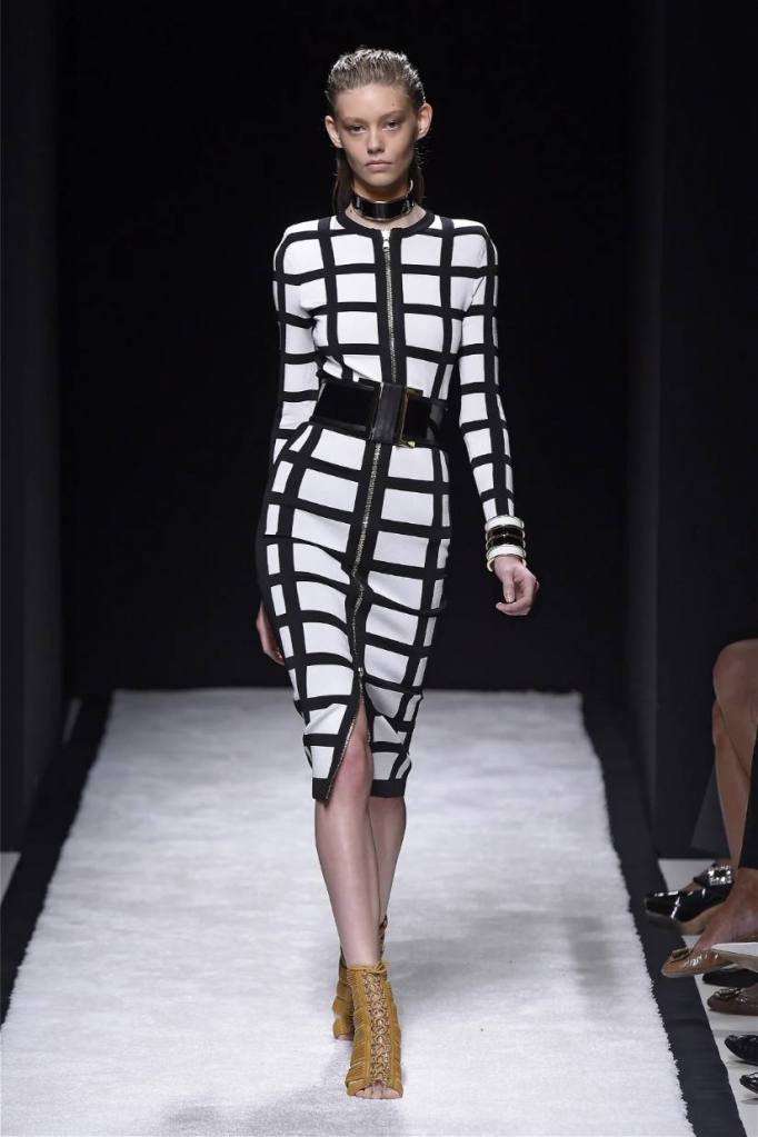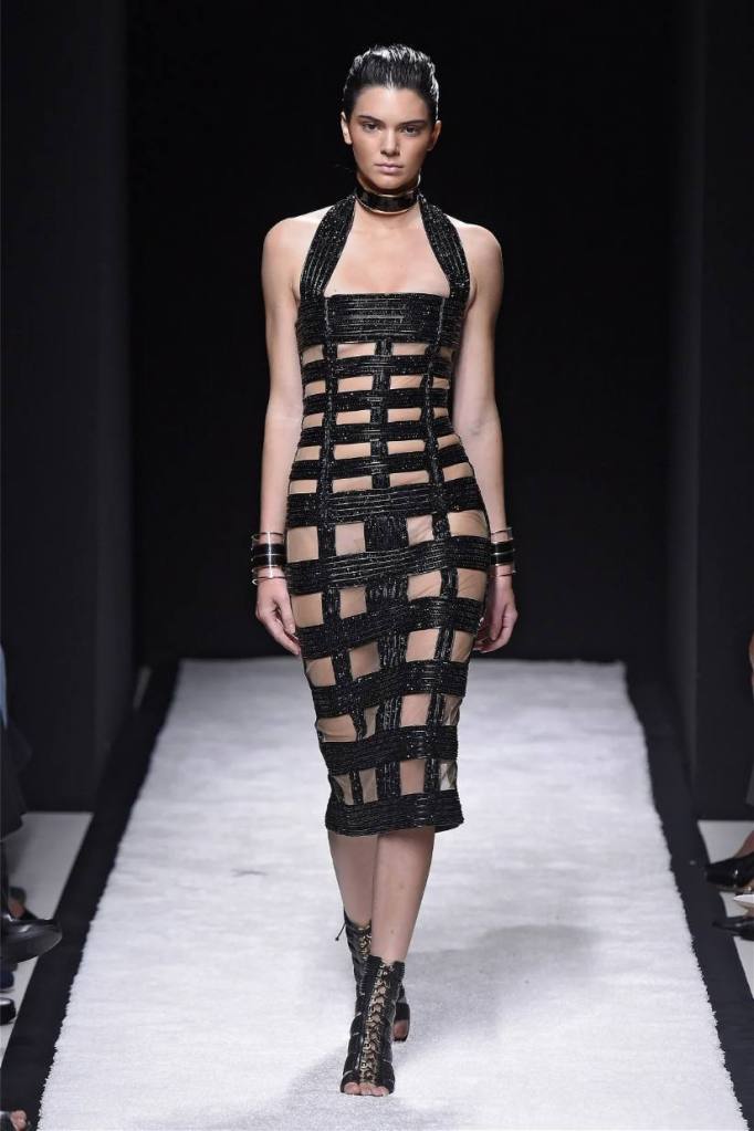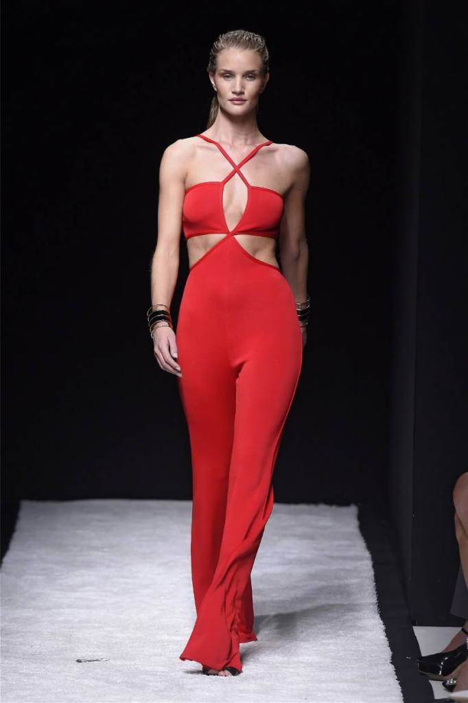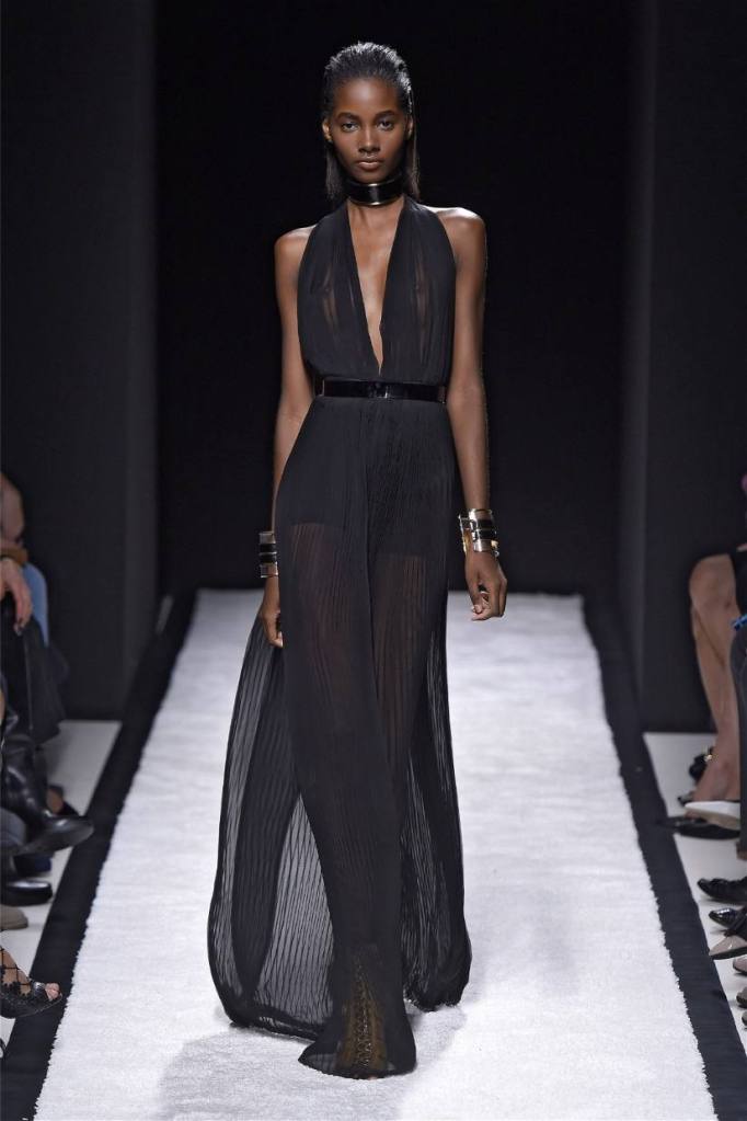 Drawing inspiration from 2015’s after-party vibe, the collection featured lots of skin and transparency, with sheer nylon knits, plastic inserts, and delicate plissé fabrics. While the designs were eye-catching, some of the fabrics, like allover crystals and heavy leather, were difficult to wear, offering less comfort than expected. The collection worked best when Rousteing kept things simple, like the elegant draped white tee paired with a crystal grid pencil skirt. Sexy, streamlined pieces like cutout dresses and strappy gowns, especially in fiery red, showcased Rousteing’s strength in balancing sensuality with structure. Models strutted in strong, confident silhouettes, from wide-legged trousers to body-con dresses, With a star-studded front row and bold designs, Balmain delivered a powerful collection.