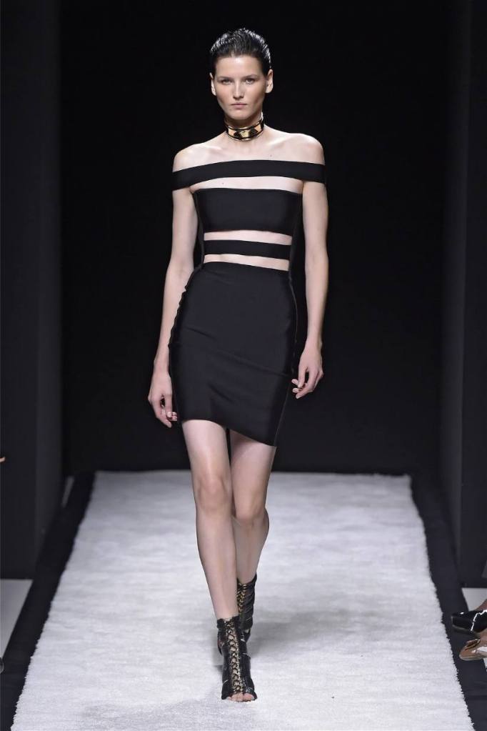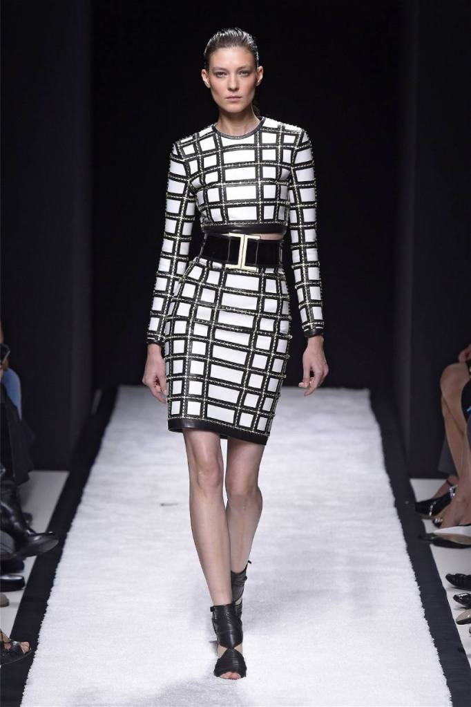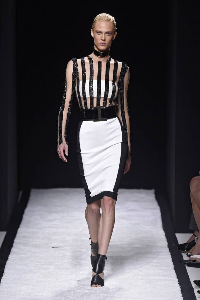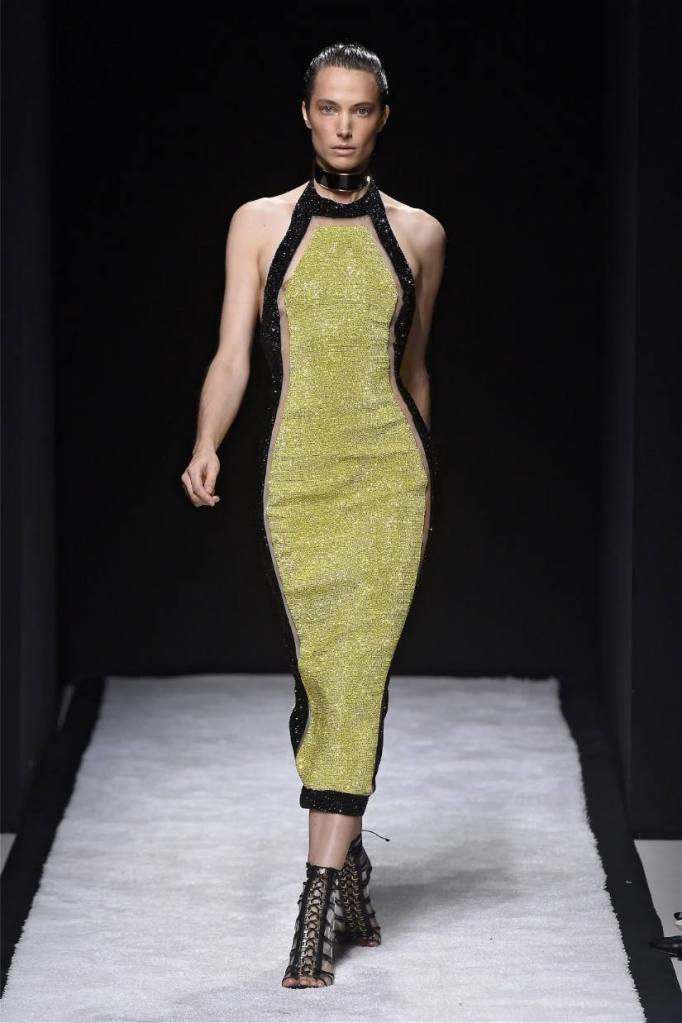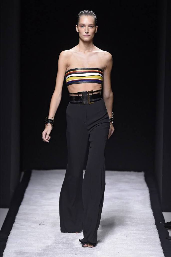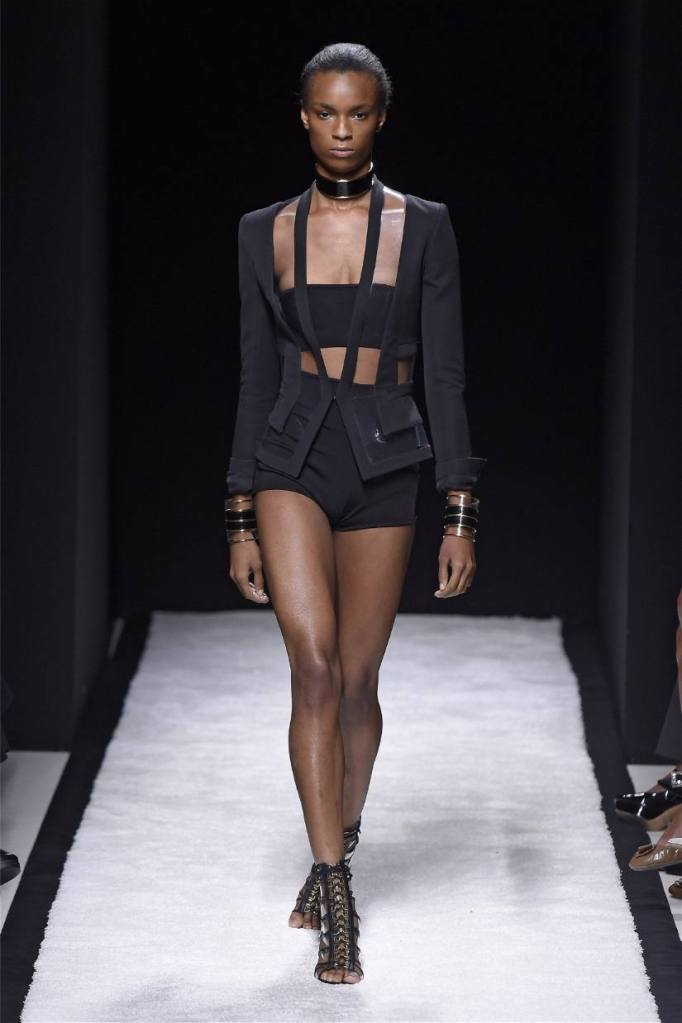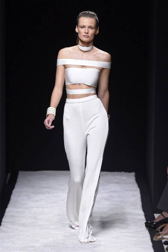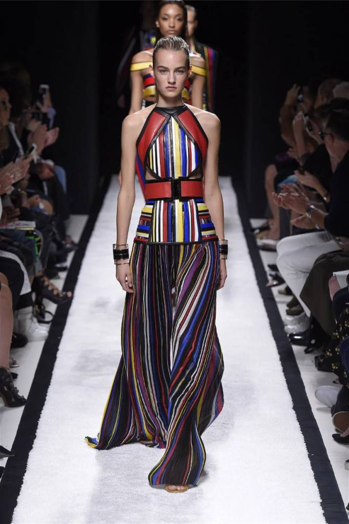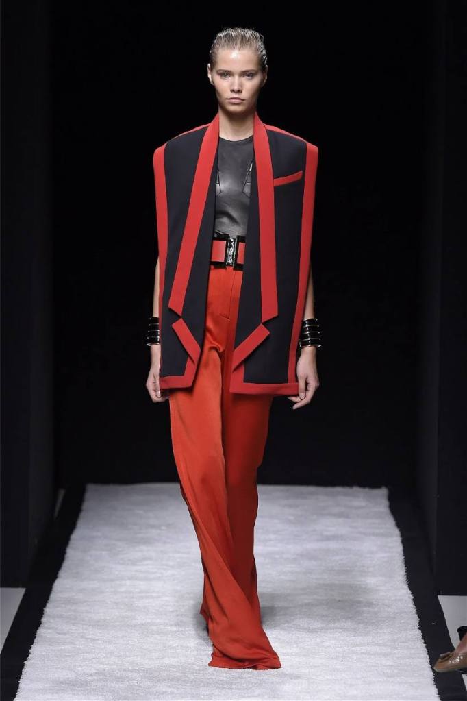 Drawing inspiration from 2015’s after-party vibe, the collection featured lots of skin and transparency, with sheer nylon knits, plastic inserts, and delicate plissé fabrics. While the designs were eye-catching, some of the fabrics, like allover crystals and heavy leather, were difficult to wear, offering less comfort than expected. The collection worked best when Rousteing kept things simple, like the elegant draped white tee paired with a crystal grid pencil skirt. Sexy, streamlined pieces like cutout dresses and strappy gowns, especially in fiery red, showcased Rousteing’s strength in balancing sensuality with structure. Models strutted in strong, confident silhouettes, from wide-legged trousers to body-con dresses, With a star-studded front row and bold designs, Balmain delivered a powerful collection.