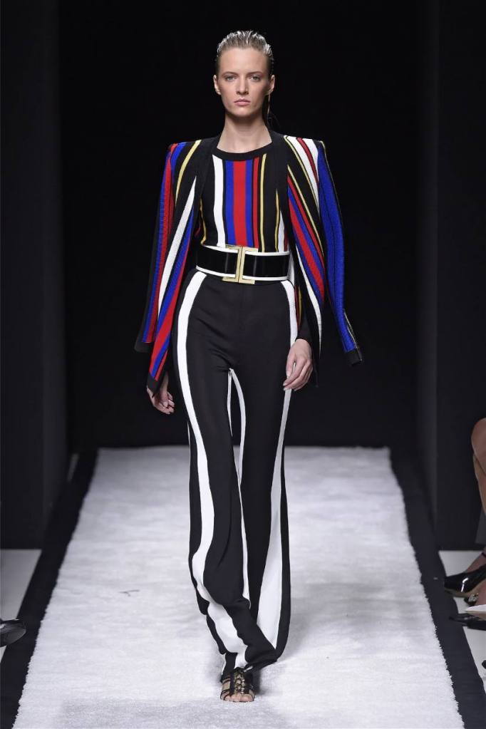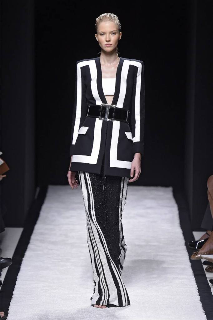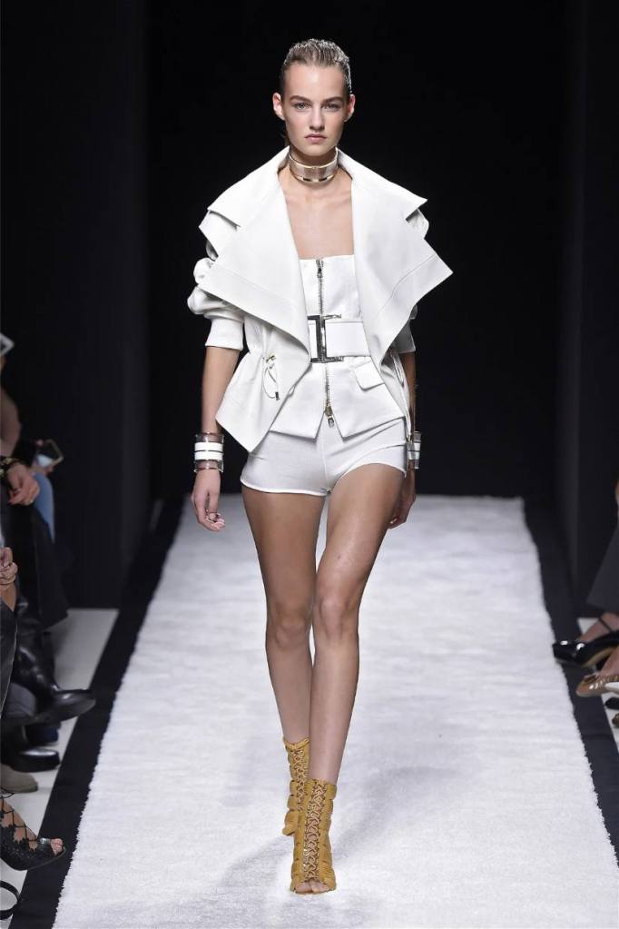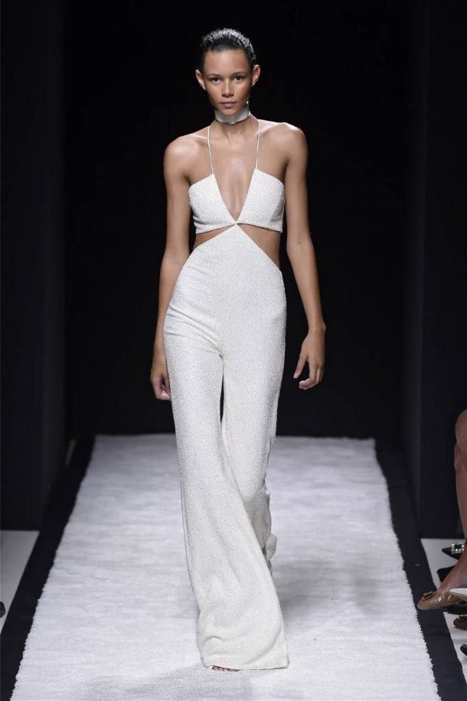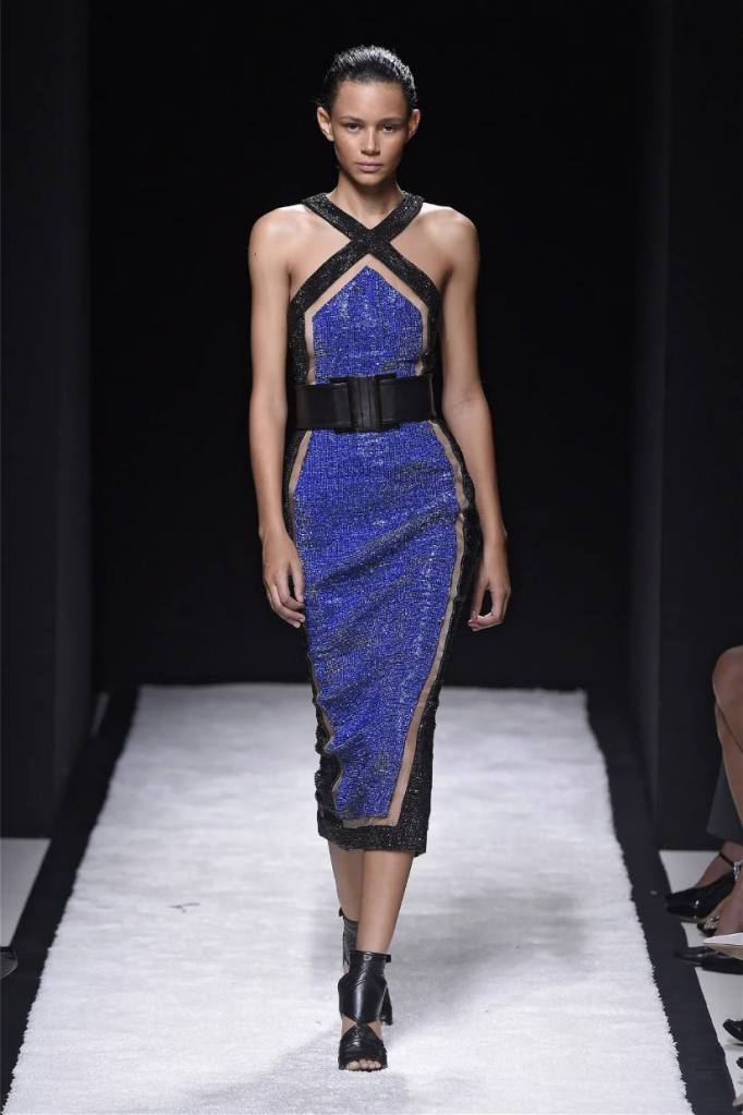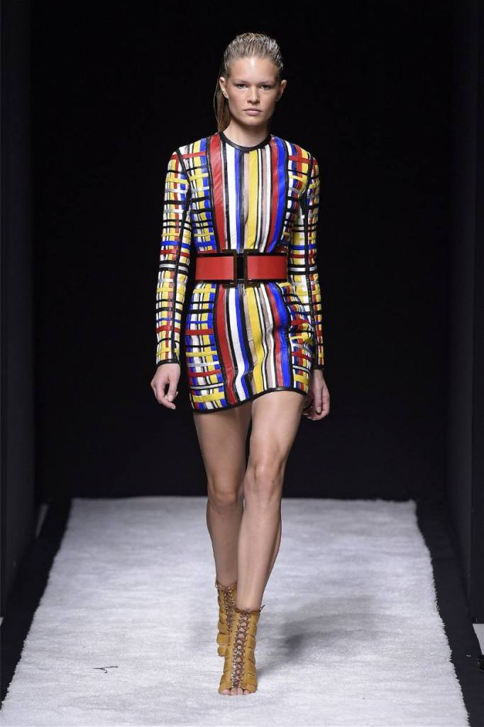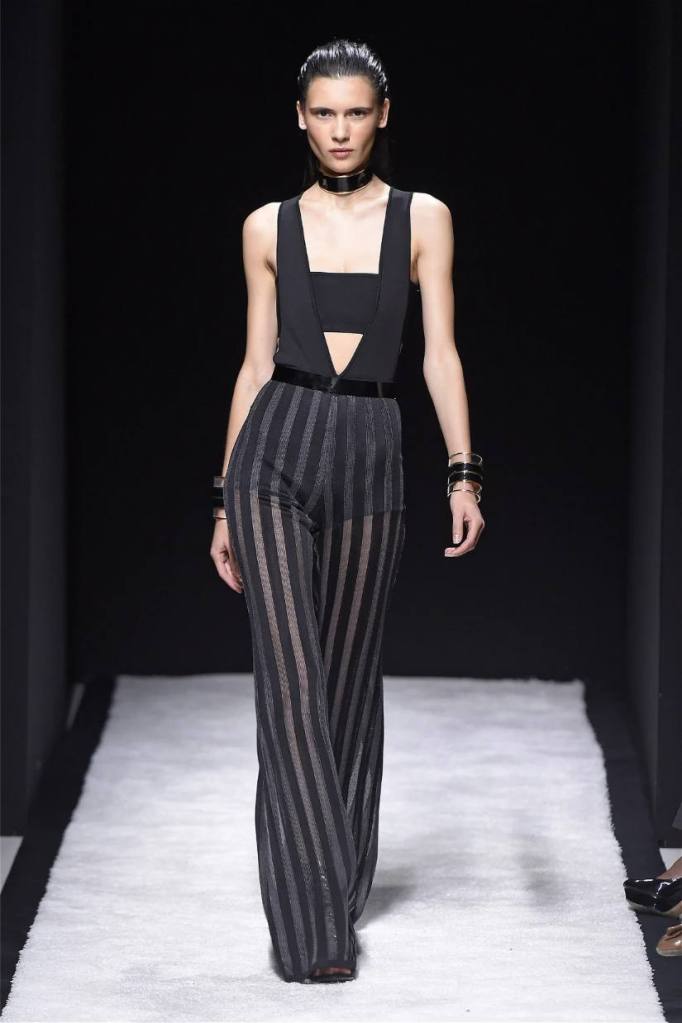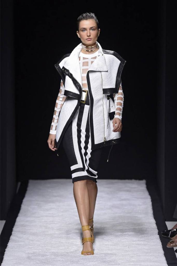 Drawing inspiration from 2015’s after-party vibe, the collection featured lots of skin and transparency, with sheer nylon knits, plastic inserts, and delicate plissé fabrics. While the designs were eye-catching, some of the fabrics, like allover crystals and heavy leather, were difficult to wear, offering less comfort than expected. The collection worked best when Rousteing kept things simple, like the elegant draped white tee paired with a crystal grid pencil skirt. Sexy, streamlined pieces like cutout dresses and strappy gowns, especially in fiery red, showcased Rousteing’s strength in balancing sensuality with structure. Models strutted in strong, confident silhouettes, from wide-legged trousers to body-con dresses, With a star-studded front row and bold designs, Balmain delivered a powerful collection.