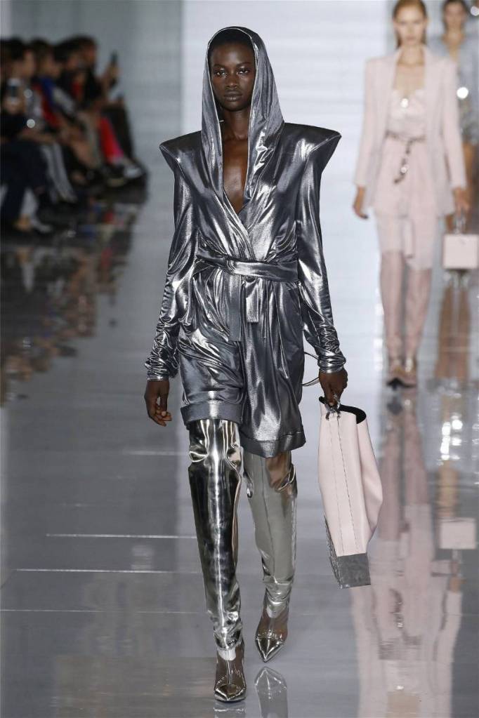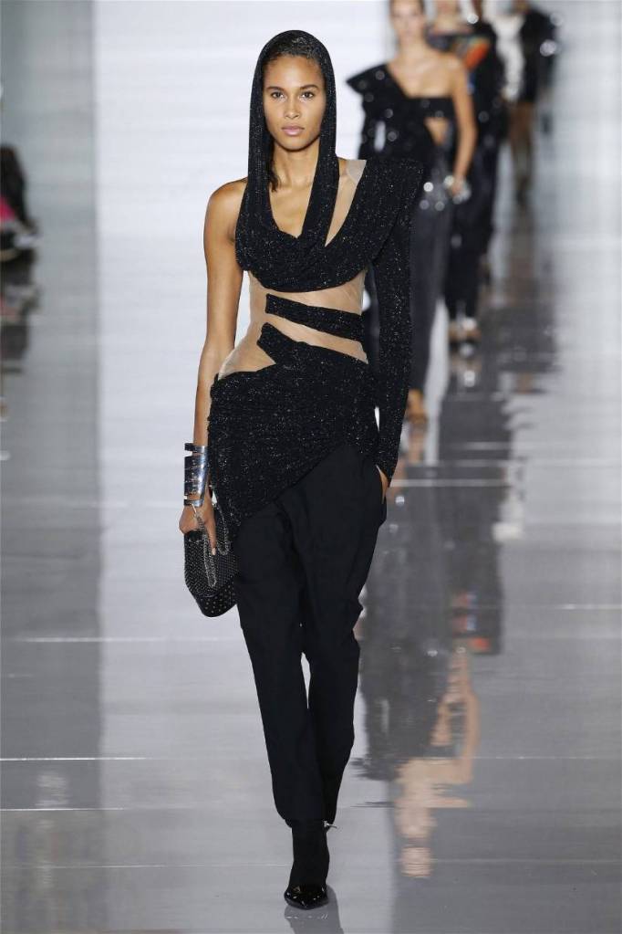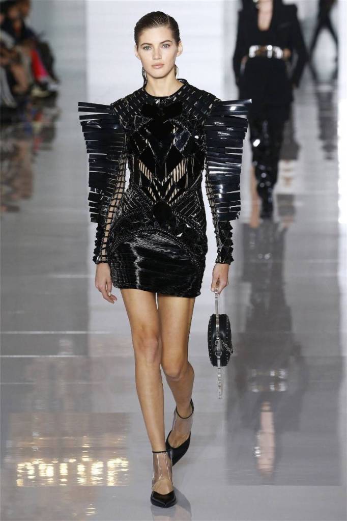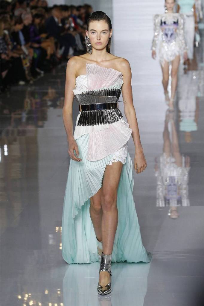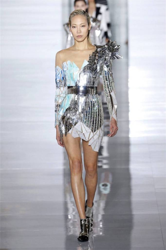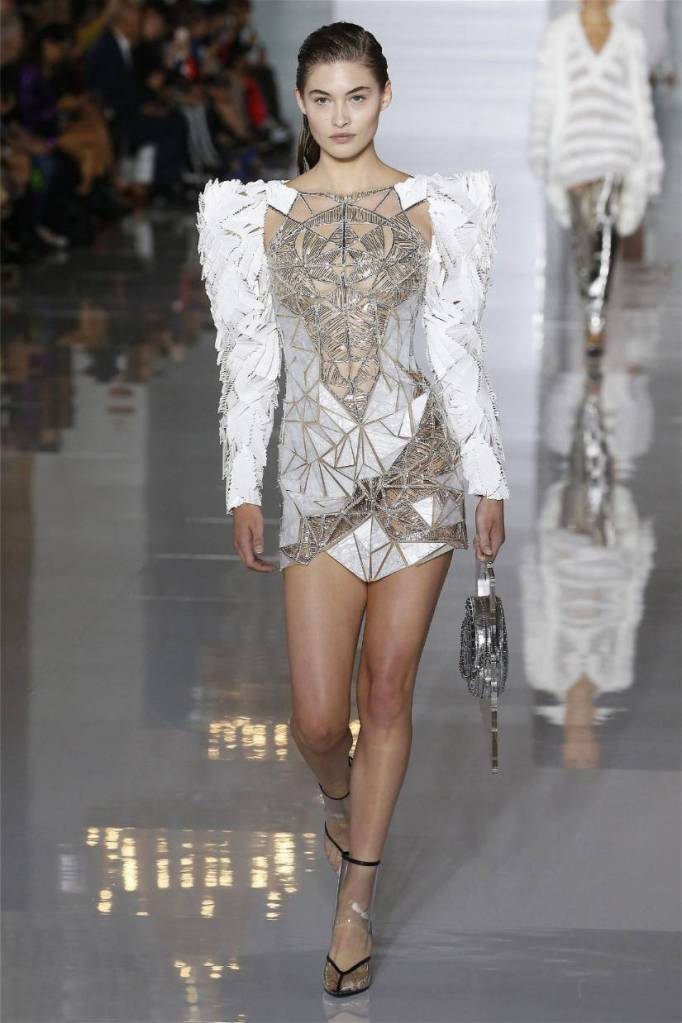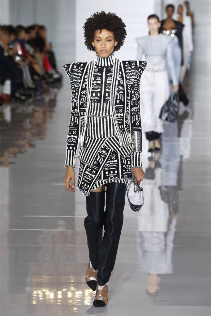 The collection was an audacious tribute to ancient Egypt, with references to hieroglyphs, sculptures, and monuments. Gold, metallics, and geometric patterns dominated the designs. Rousteing blended his signature ’80s-inspired silhouettes—exaggerated shoulders, sharp tailoring, and bold embellishments—with inventive, sculptural pieces. Highlights included mummy-inspired bandage dresses, pyramid-shaped plexiglass panels, and metallic bustiers.
