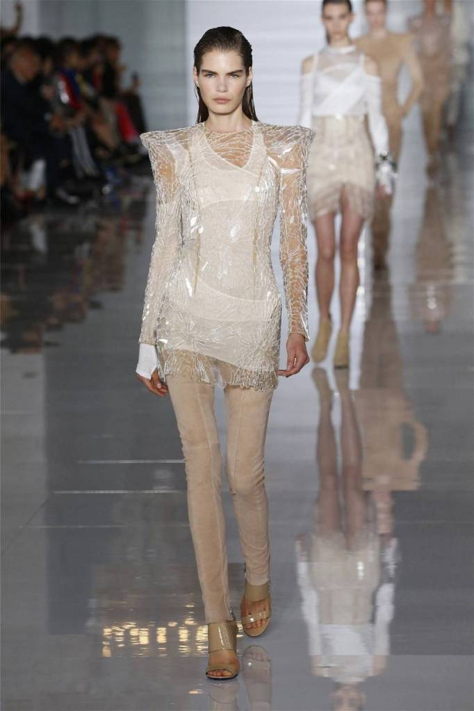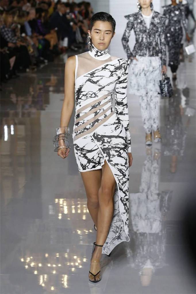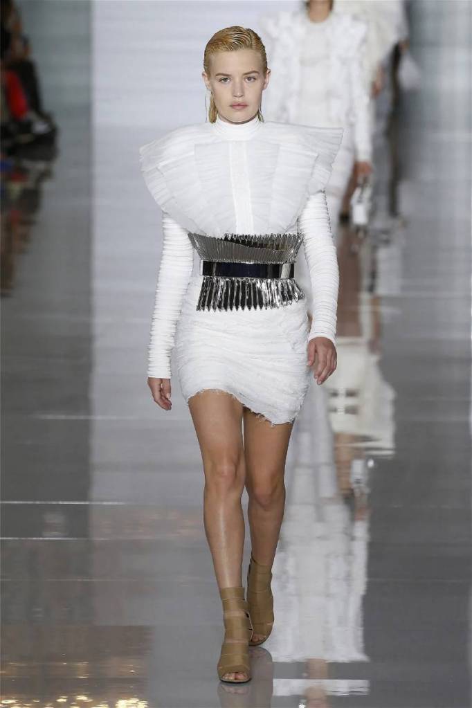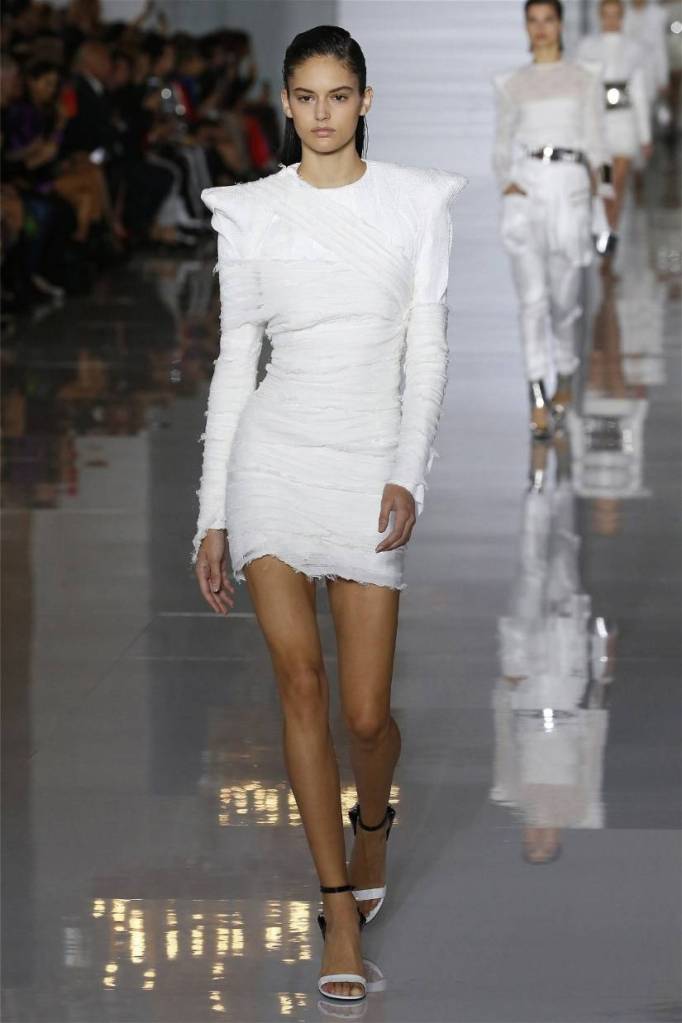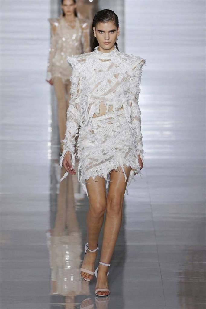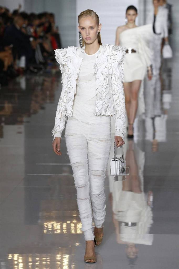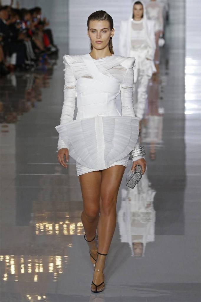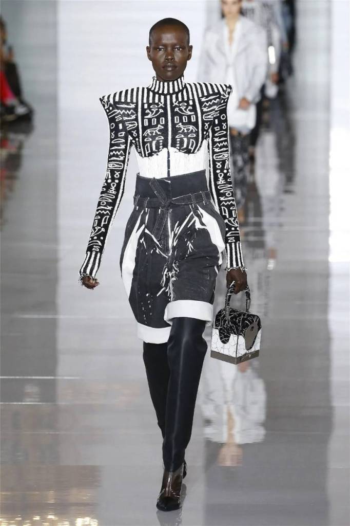 The collection was an audacious tribute to ancient Egypt, with references to hieroglyphs, sculptures, and monuments. Gold, metallics, and geometric patterns dominated the designs. Rousteing blended his signature ’80s-inspired silhouettes—exaggerated shoulders, sharp tailoring, and bold embellishments—with inventive, sculptural pieces. Highlights included mummy-inspired bandage dresses, pyramid-shaped plexiglass panels, and metallic bustiers.