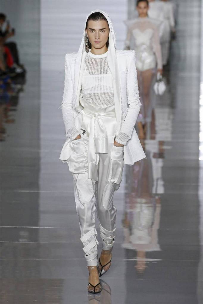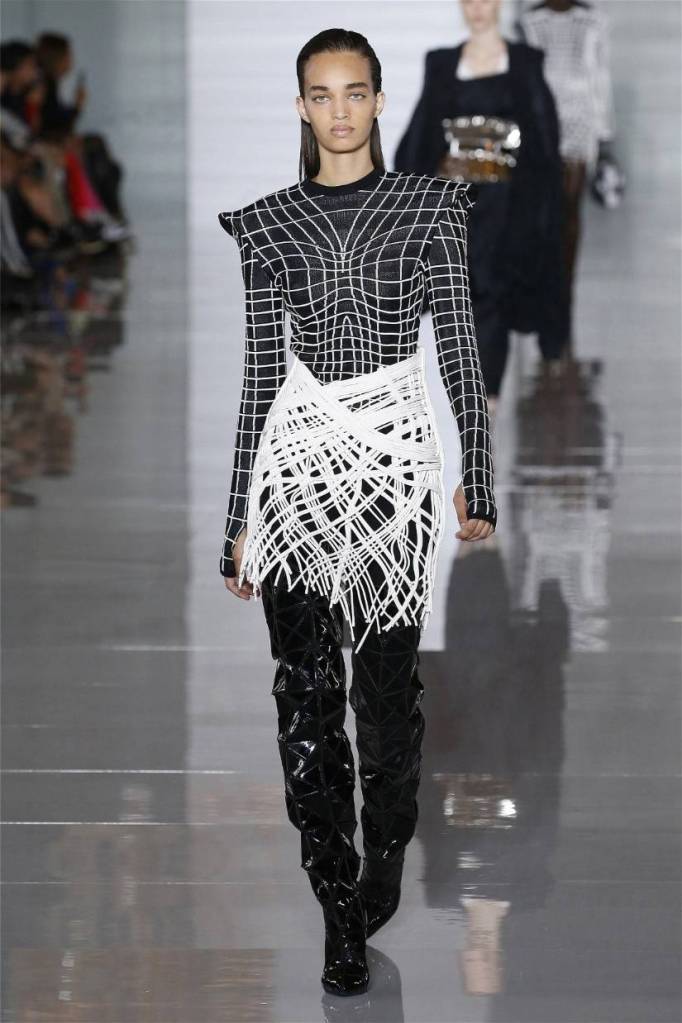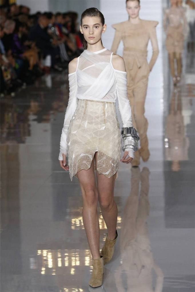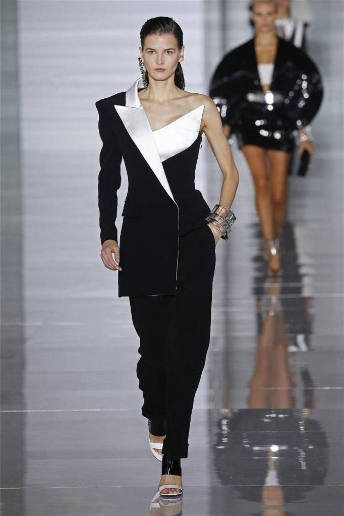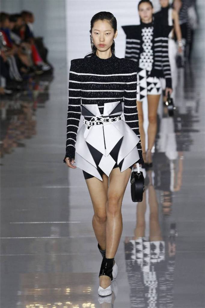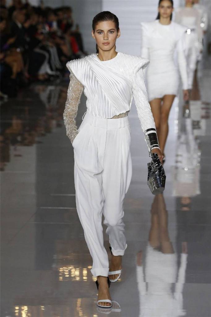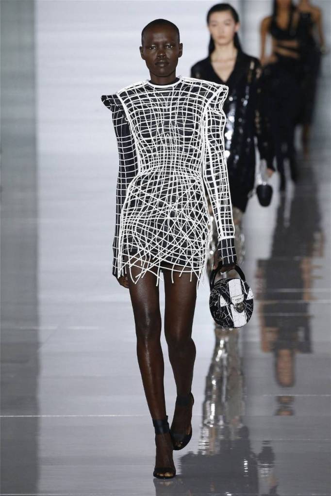 The collection was an audacious tribute to ancient Egypt, with references to hieroglyphs, sculptures, and monuments. Gold, metallics, and geometric patterns dominated the designs. Rousteing blended his signature ’80s-inspired silhouettes—exaggerated shoulders, sharp tailoring, and bold embellishments—with inventive, sculptural pieces. Highlights included mummy-inspired bandage dresses, pyramid-shaped plexiglass panels, and metallic bustiers.