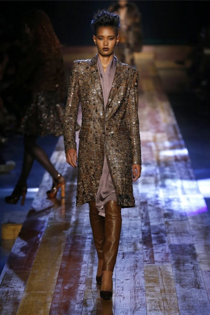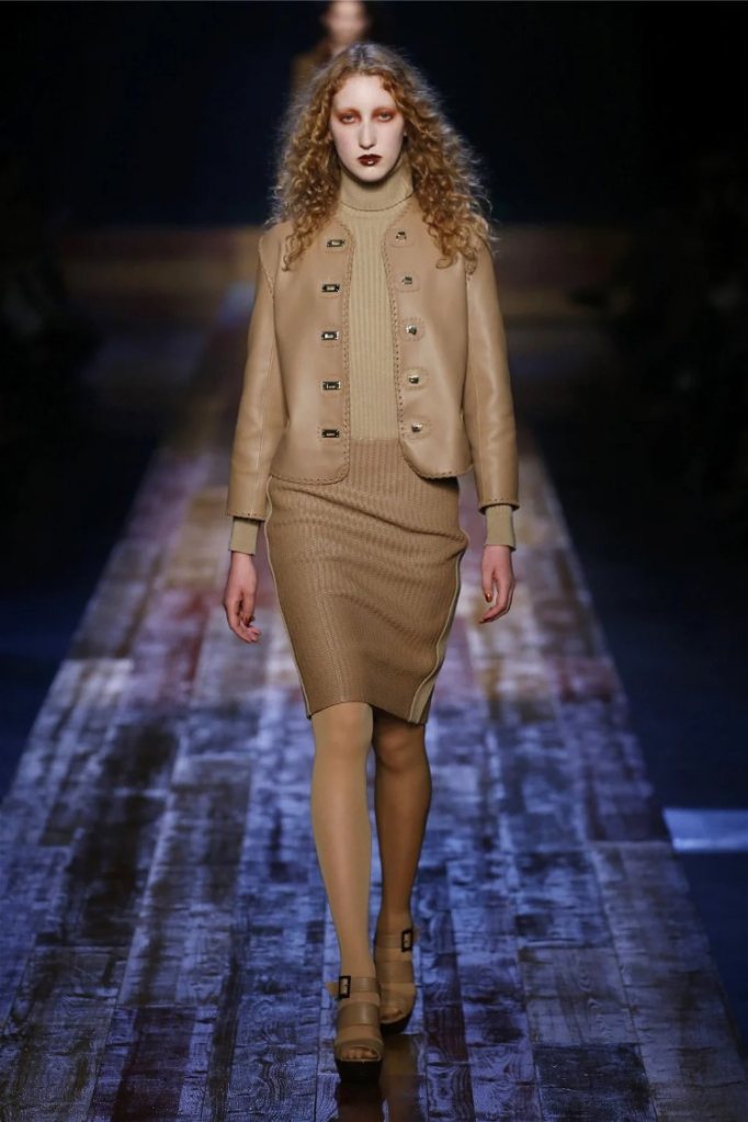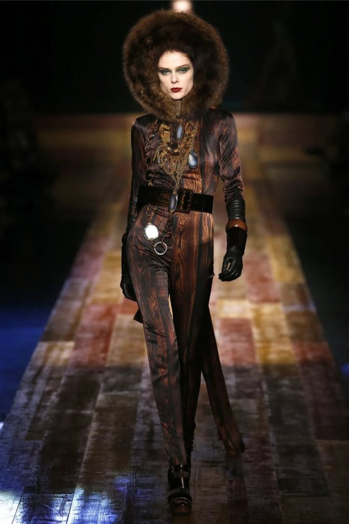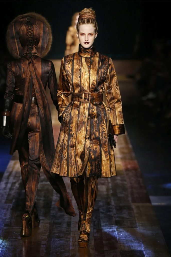 The show opened with wood-grain prints that appeared on everything from slinky catsuits to tailored coats, creating a rustic yet luxurious vibe. As the models strutted down a wooden plank runway, the sounds of nature played softly in the background, setting a tranquil tone. The palette was earthy—rich browns, deep greens, and pops of hunter orange—evoking the colors of an autumn forest.