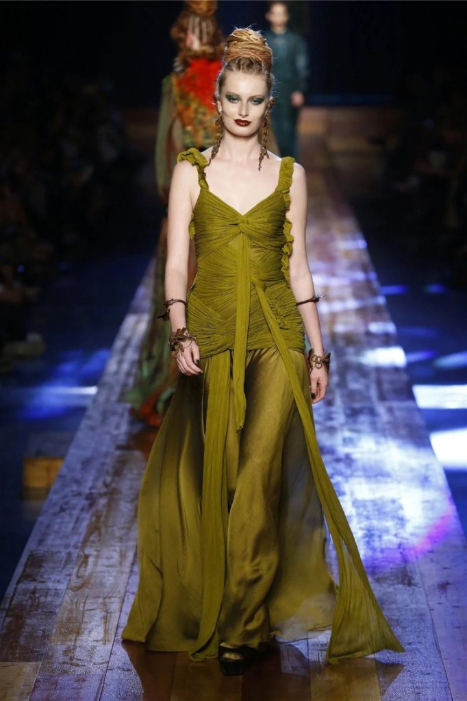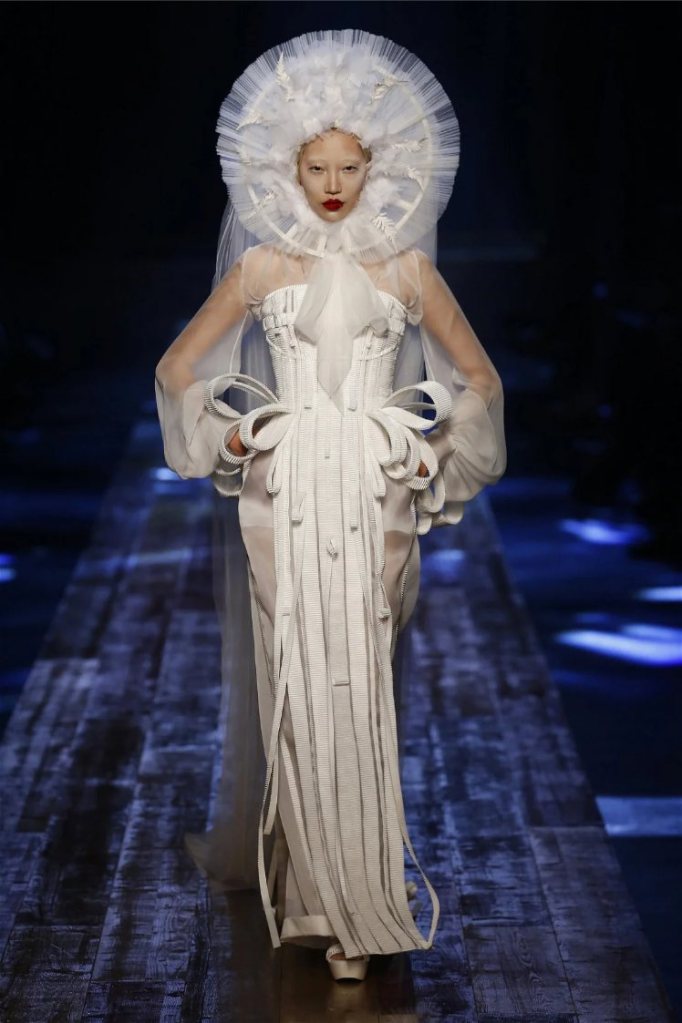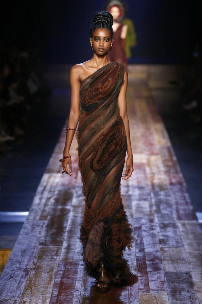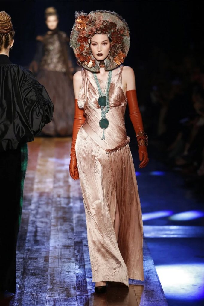 True to form, Gaultier infused the show with his signature humor and drama. Delicate petals adorned the models’ lips, and hairpieces shaped like tree roots added a touch of fantasy. While the collection captured the serene beauty of nature, it also celebrated the bold extravagance that defines haute couture.