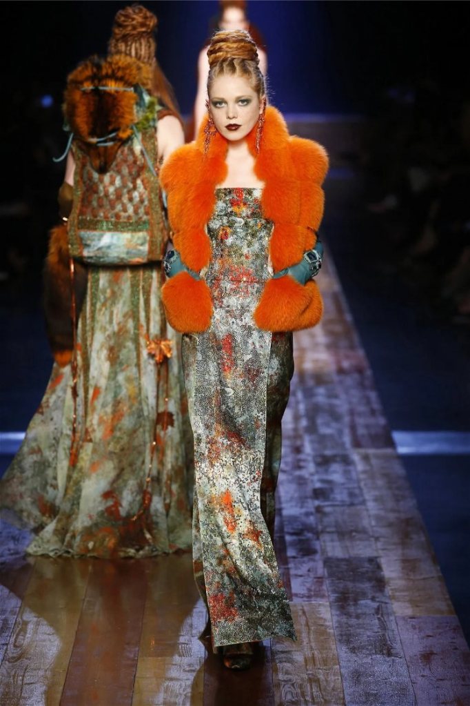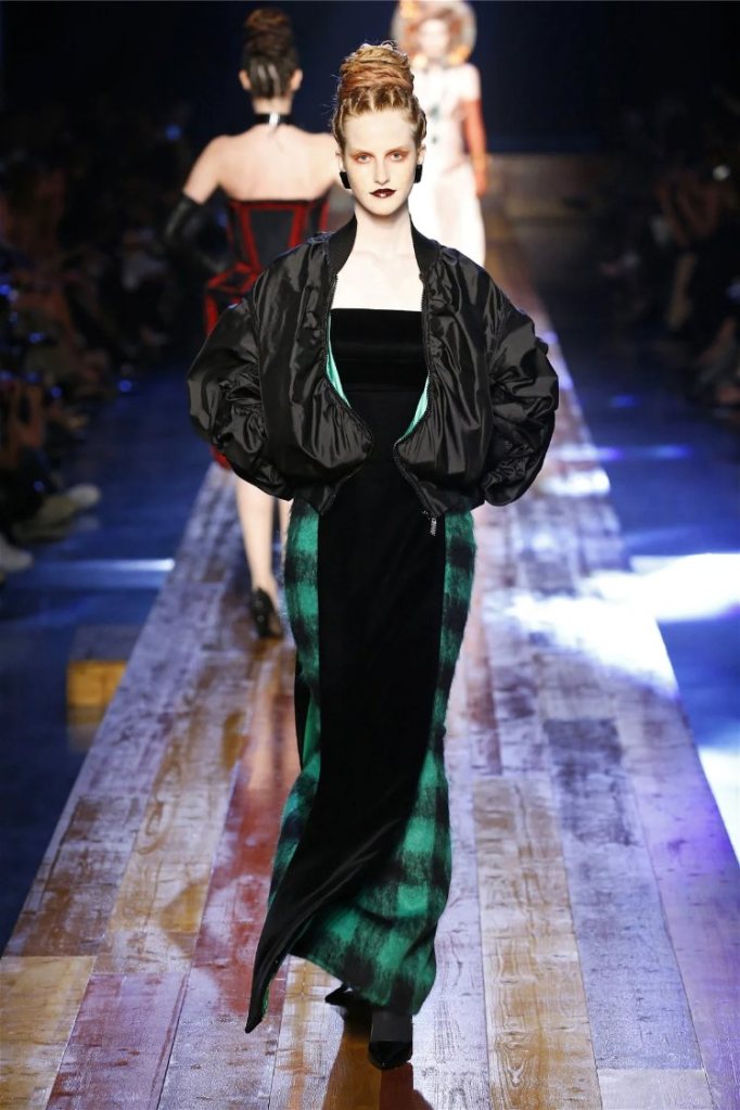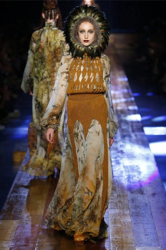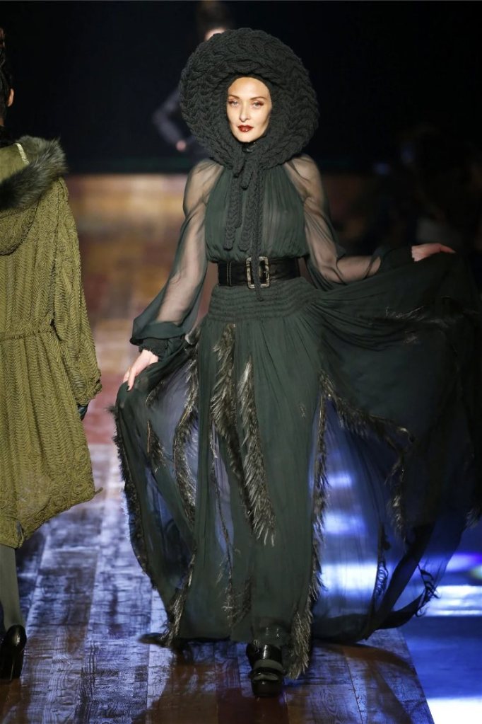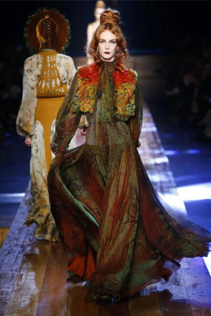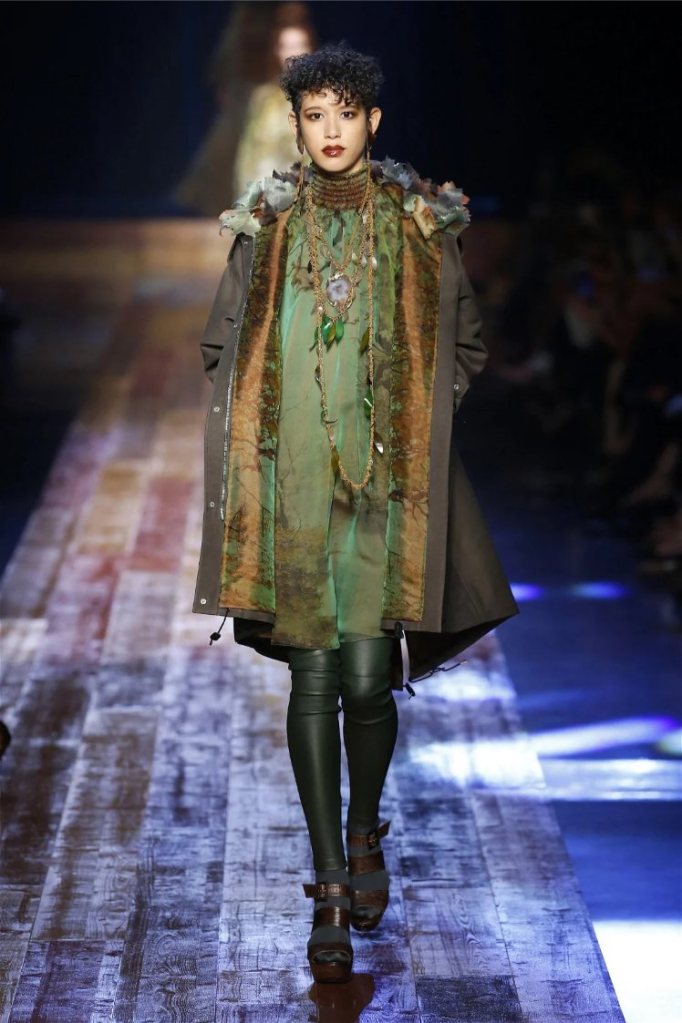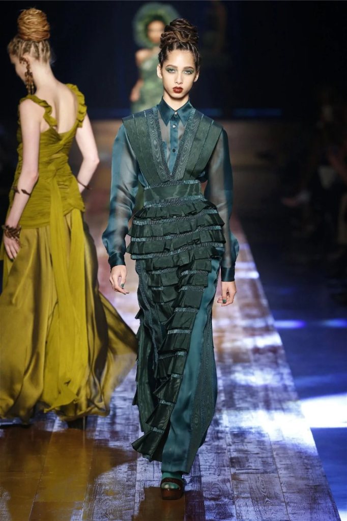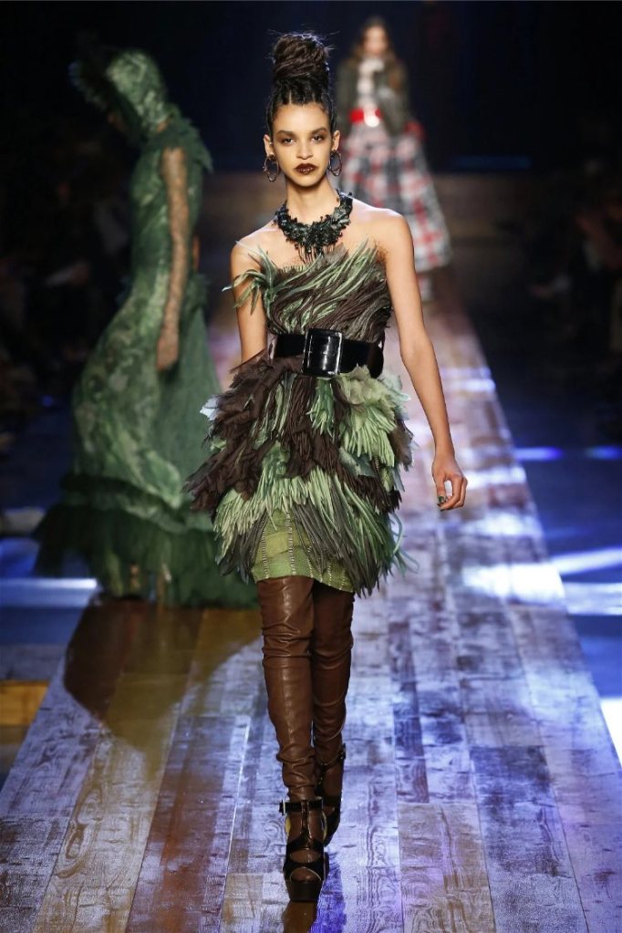 Gaultier didn’t stop at subtlety; his designs embraced nature with theatrical flair. Lumberjack plaids were reimagined as flowing evening gowns and tailored skirts, while giant backpacks trimmed with lace and fox fur added a playful edge. Moss green gowns and tiered lime-green dresses brought a vibrant, almost tropical twist to the collection. The pièce de résistance? A bride in a dramatic, veiled headpiece resembling a moonlit forest scene.