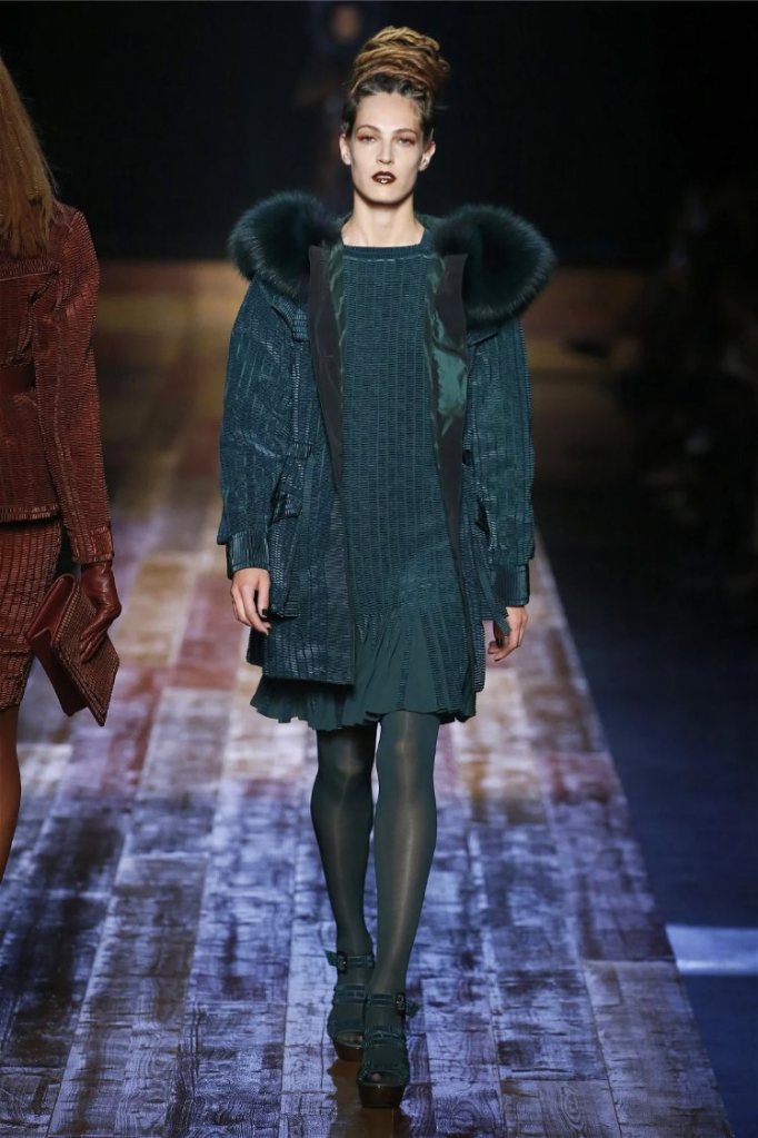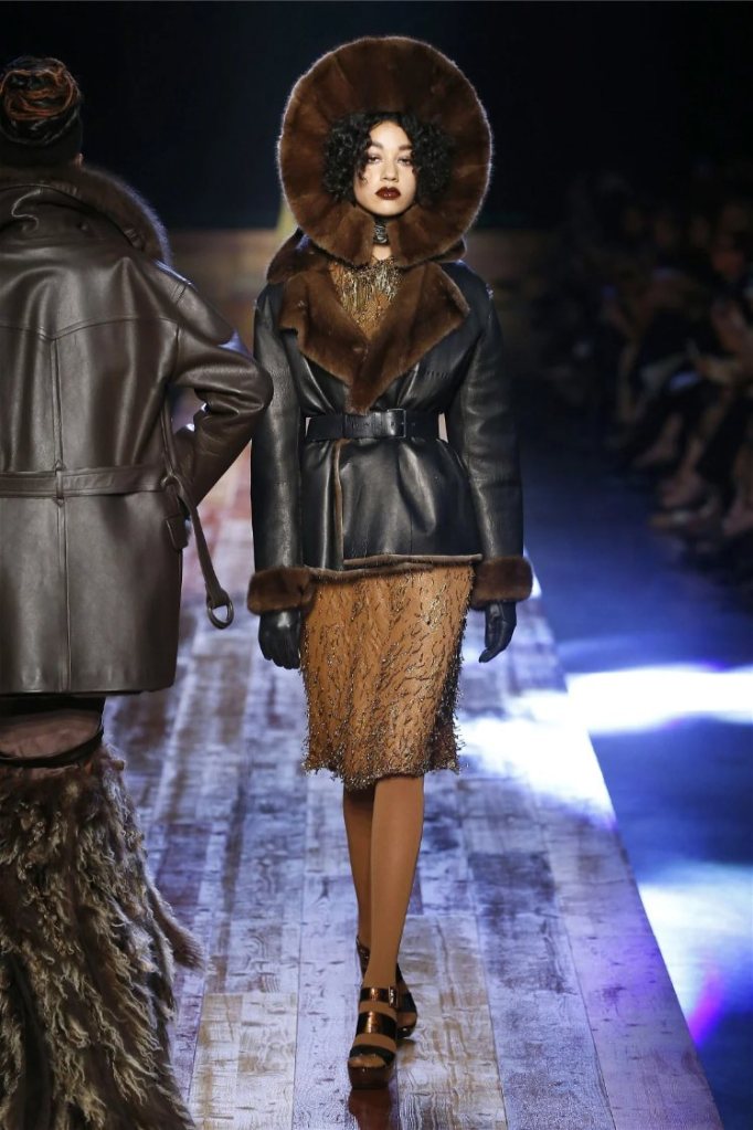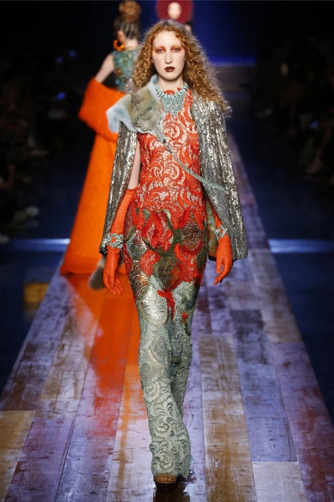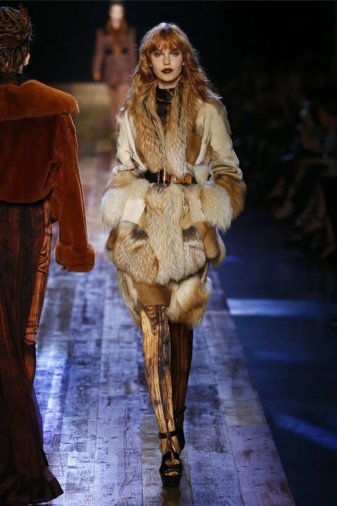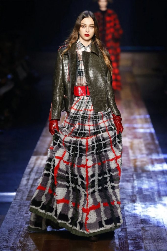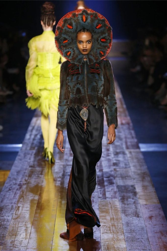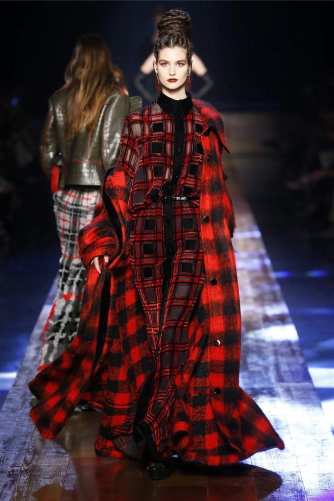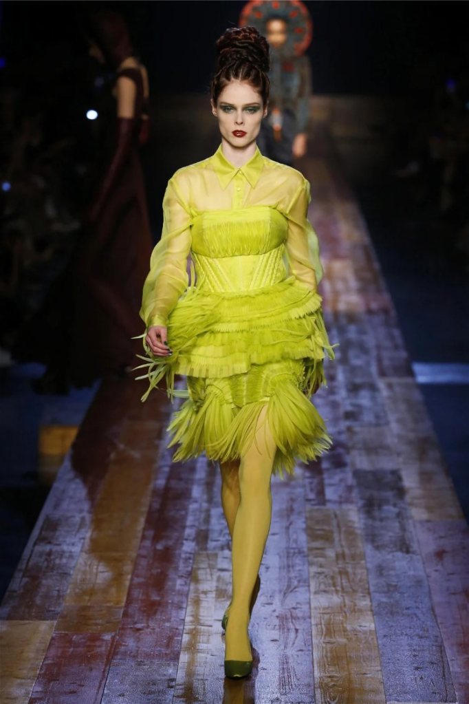 Gaultier didn’t stop at subtlety; his designs embraced nature with theatrical flair. Lumberjack plaids were reimagined as flowing evening gowns and tailored skirts, while giant backpacks trimmed with lace and fox fur added a playful edge. Moss green gowns and tiered lime-green dresses brought a vibrant, almost tropical twist to the collection. The pièce de résistance? A bride in a dramatic, veiled headpiece resembling a moonlit forest scene.