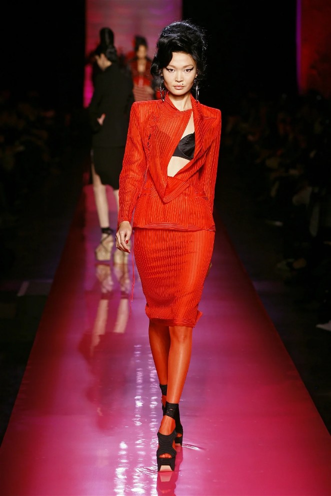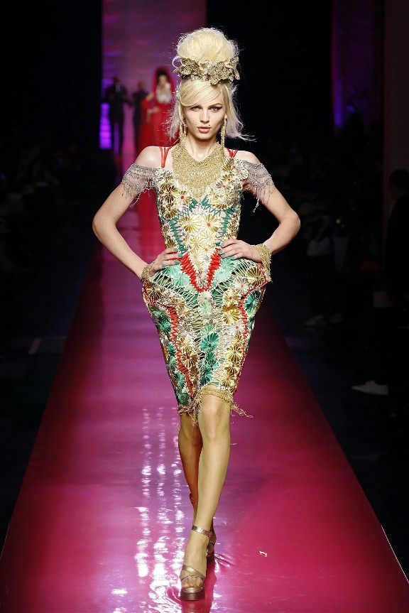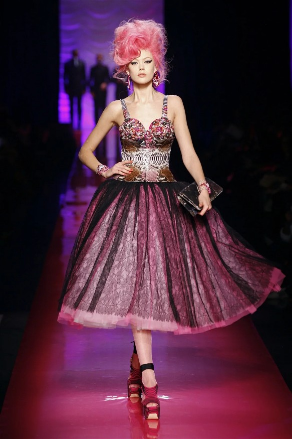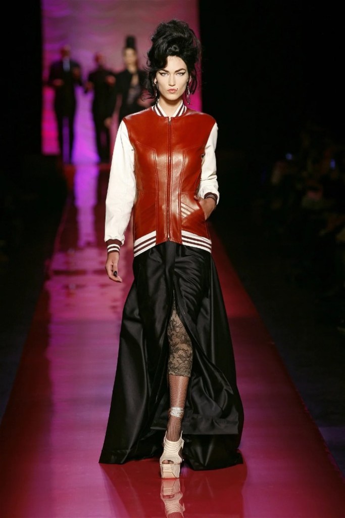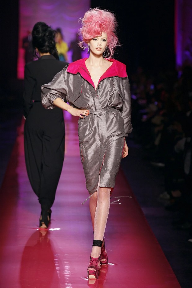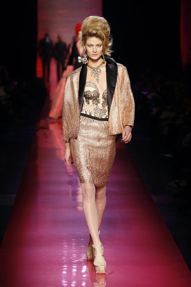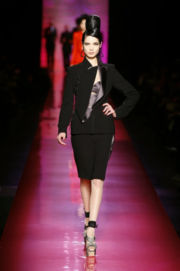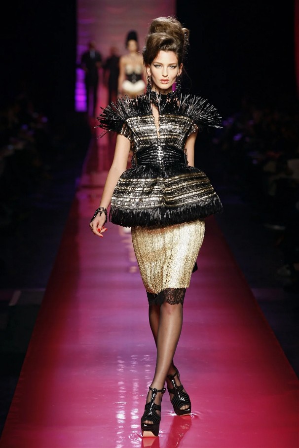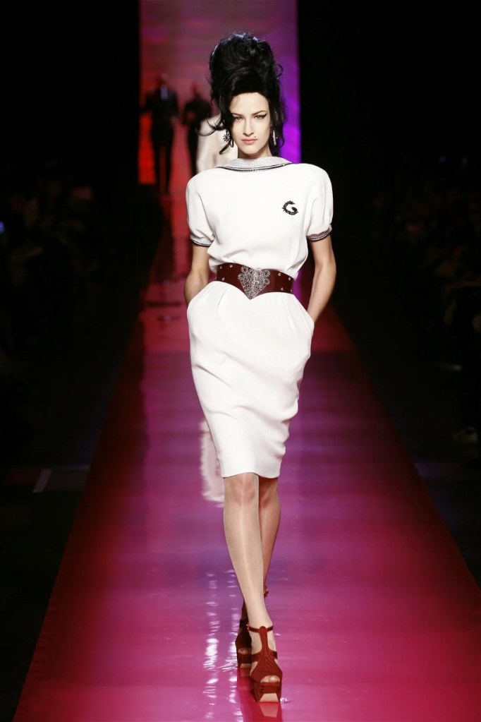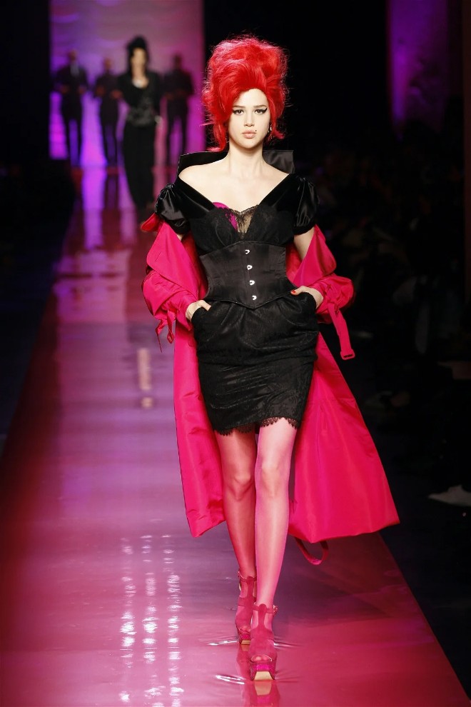 The collection was full of 1950s-inspired silhouettes, tiny waists, and pencil skirts—a nod to Amy’s love for retro glamour. Gaultier’s genius turned even casual pieces into couture, like a Fred Perry-inspired polo shirt transformed into a sleek, button-back dress. He added his signature touch with luxurious fabrics, bold colors, and intricate details. Standout pieces included a corset-backed silk parka lined with pink sequins and a baseball jacket reimagined as a red-and-white leather hourglass design.