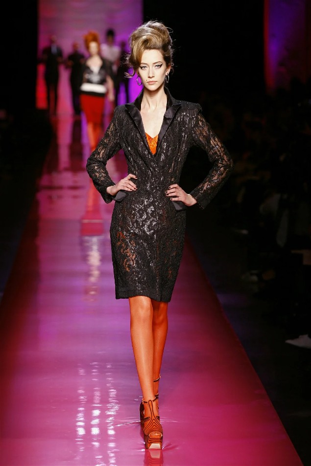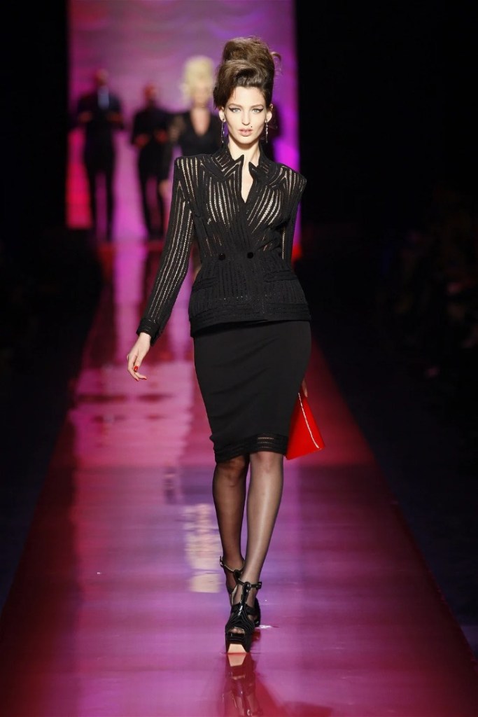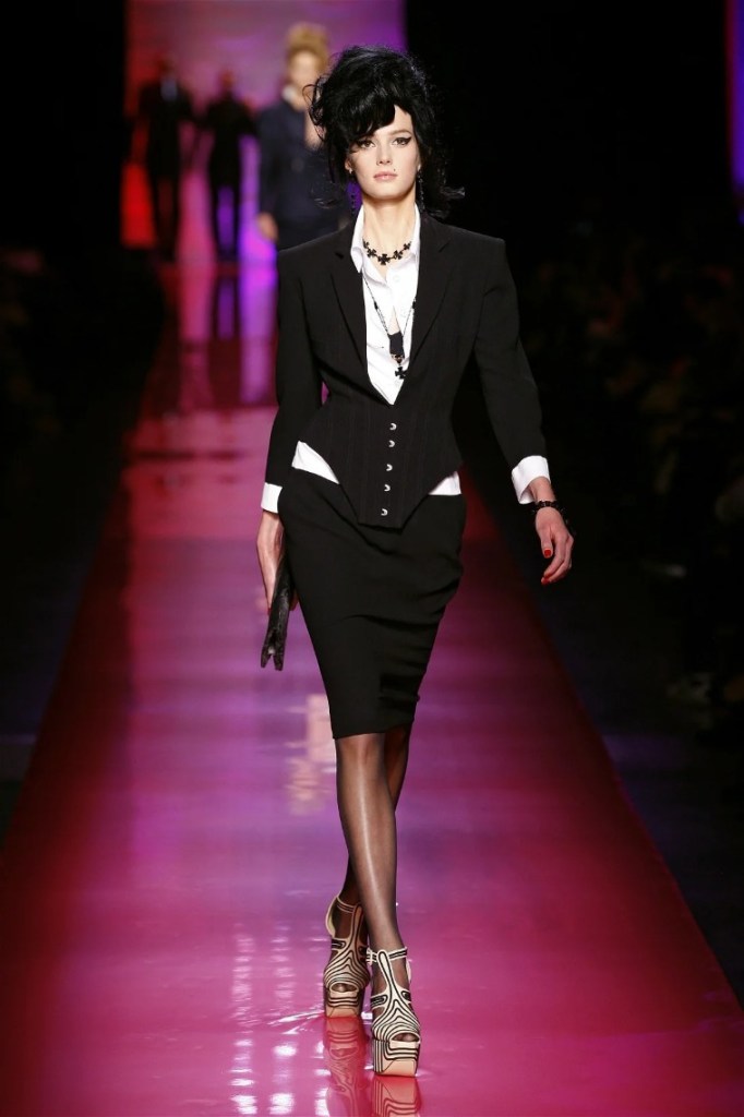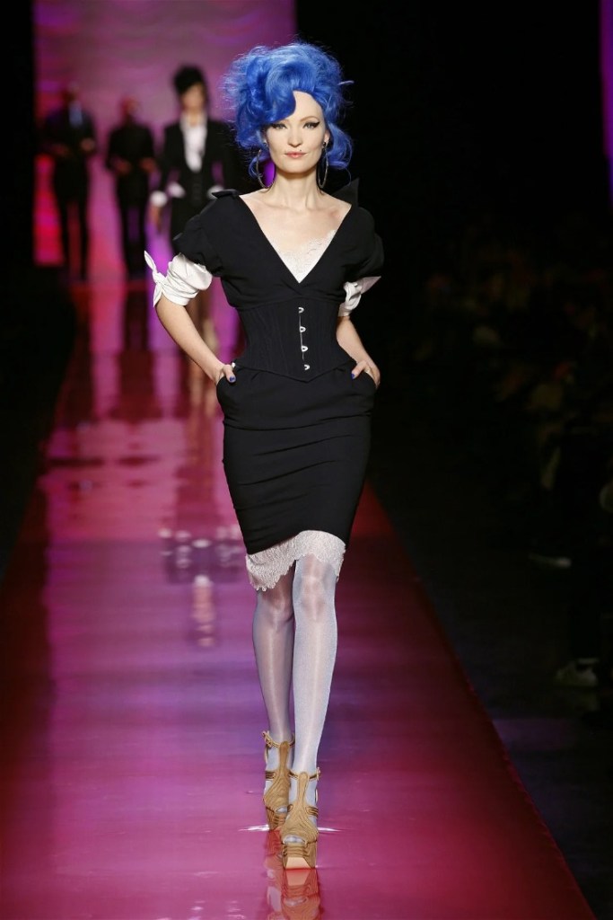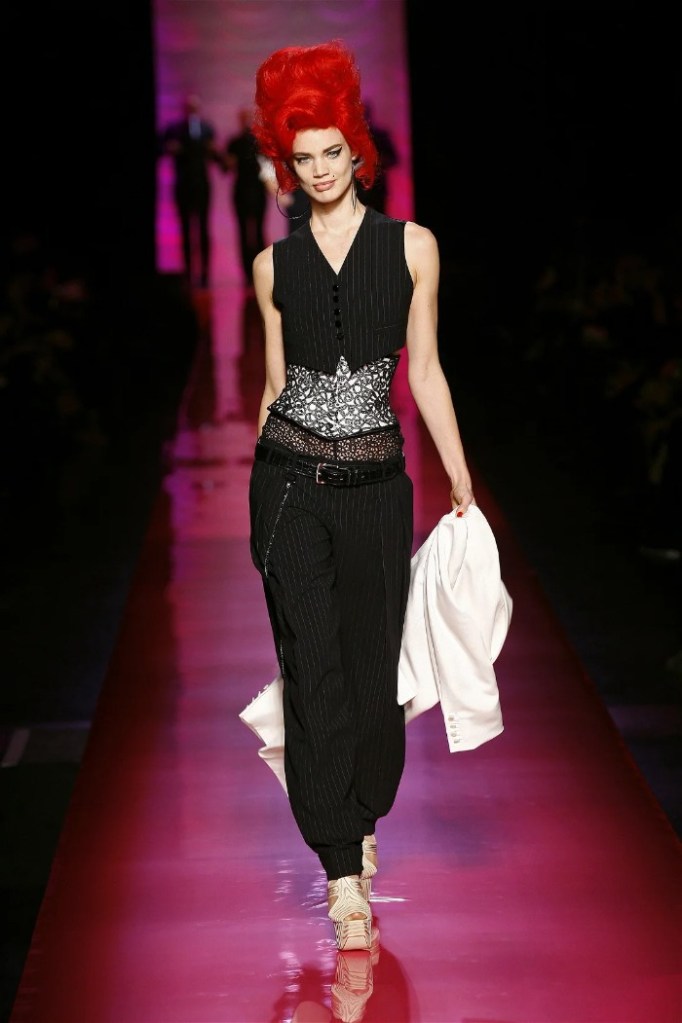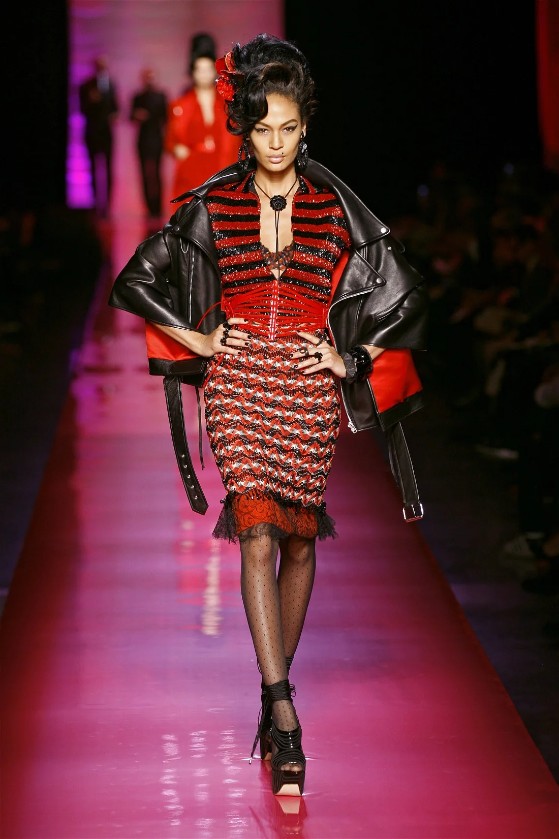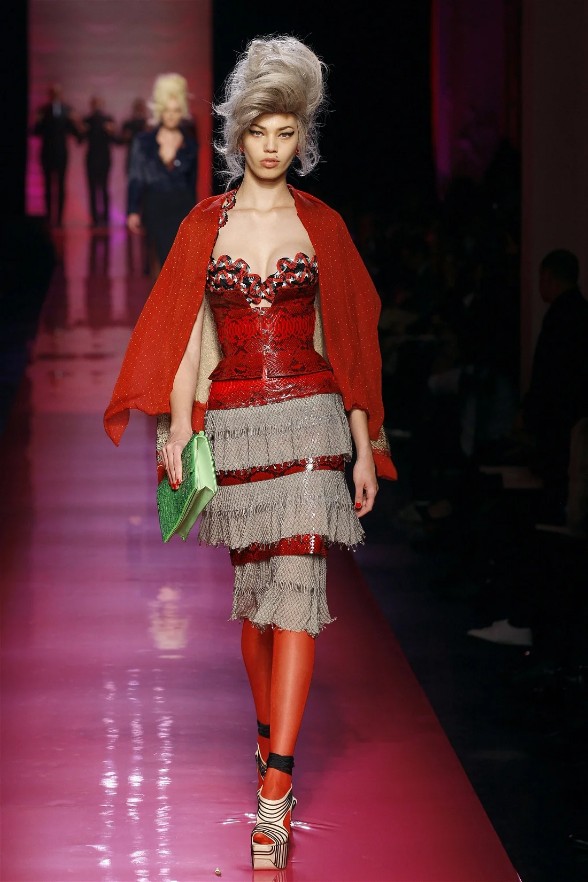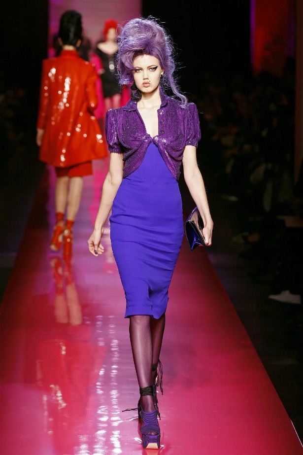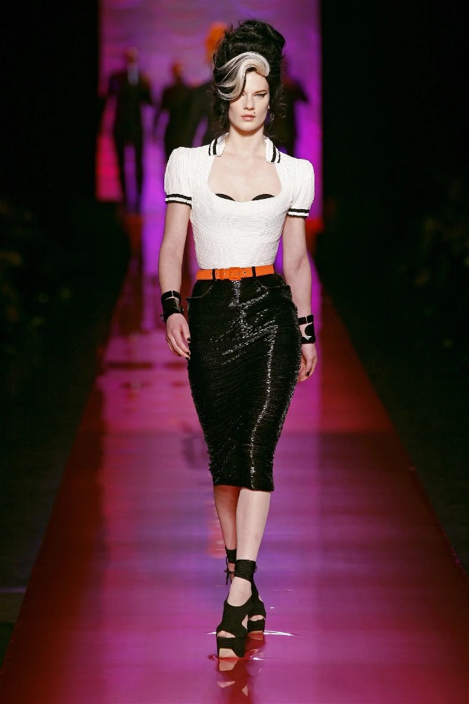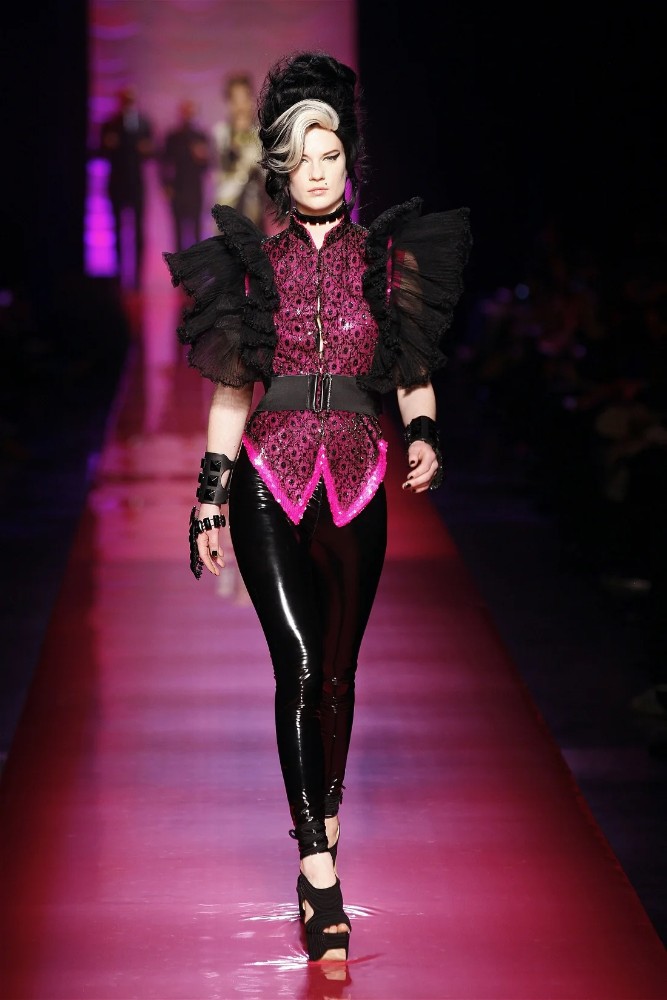 The collection was full of 1950s-inspired silhouettes, tiny waists, and pencil skirts—a nod to Amy’s love for retro glamour. Gaultier’s genius turned even casual pieces into couture, like a Fred Perry-inspired polo shirt transformed into a sleek, button-back dress. He added his signature touch with luxurious fabrics, bold colors, and intricate details. Standout pieces included a corset-backed silk parka lined with pink sequins and a baseball jacket reimagined as a red-and-white leather hourglass design.