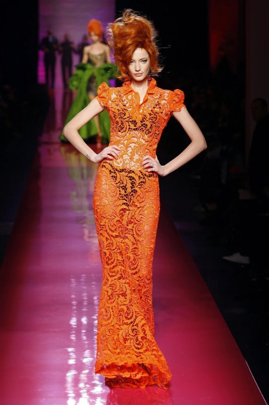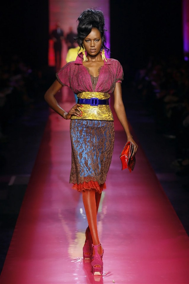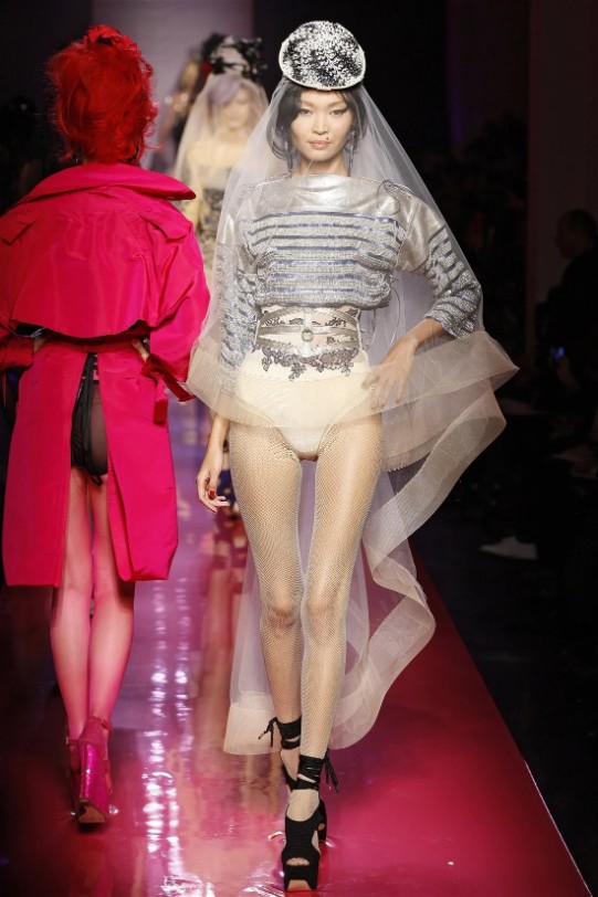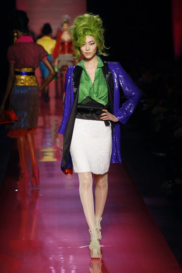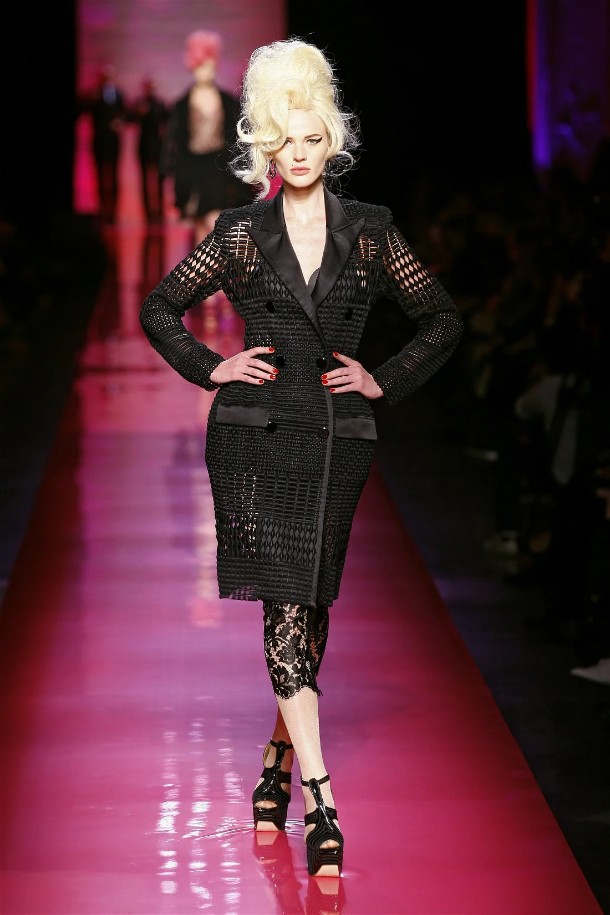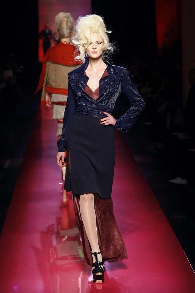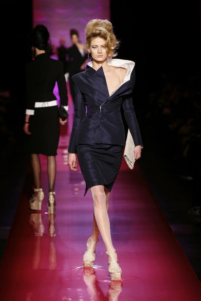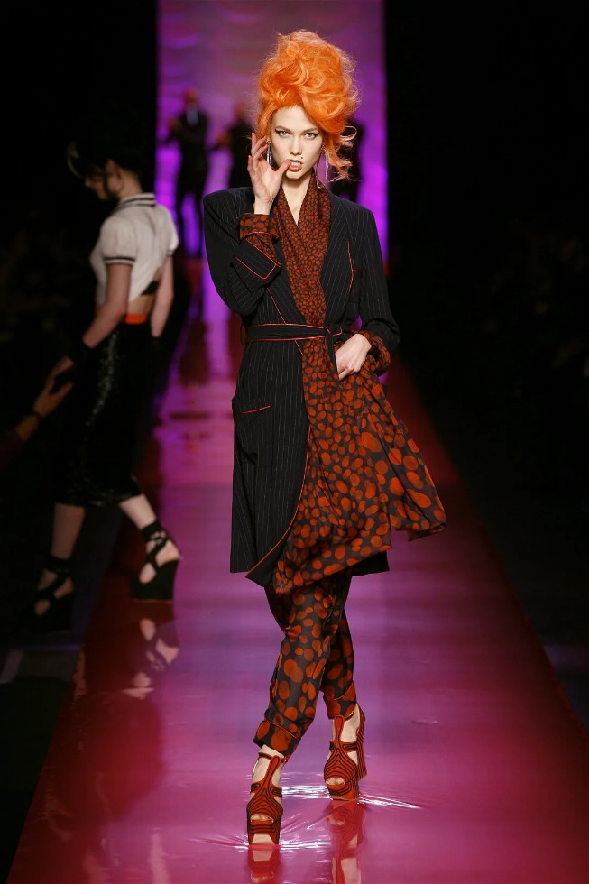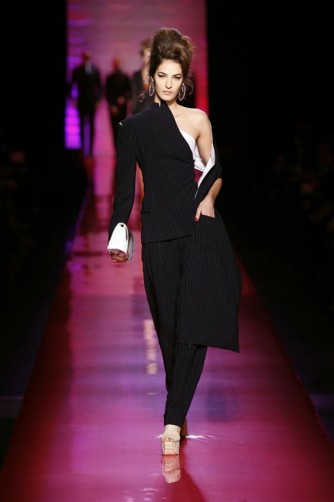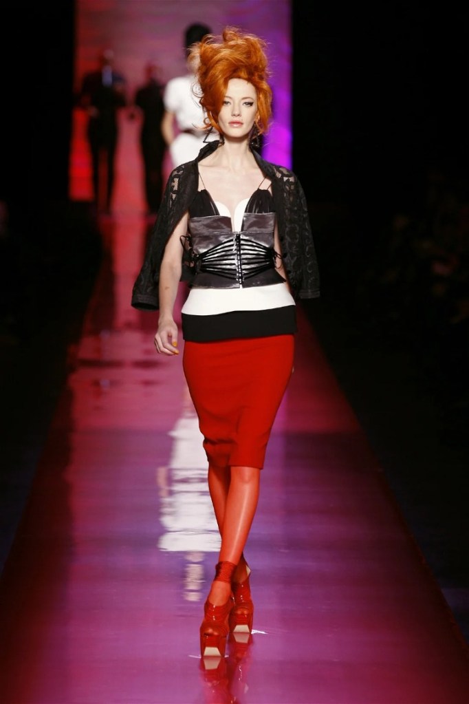 The collection was full of 1950s-inspired silhouettes, tiny waists, and pencil skirts—a nod to Amy’s love for retro glamour. Gaultier’s genius turned even casual pieces into couture, like a Fred Perry-inspired polo shirt transformed into a sleek, button-back dress. He added his signature touch with luxurious fabrics, bold colors, and intricate details. Standout pieces included a corset-backed silk parka lined with pink sequins and a baseball jacket reimagined as a red-and-white leather hourglass design.