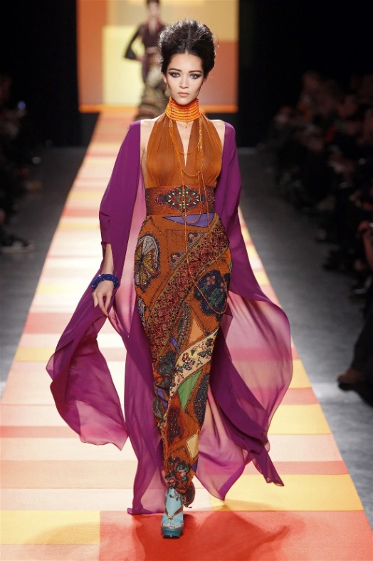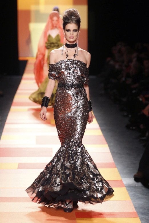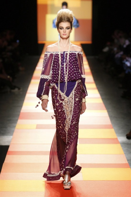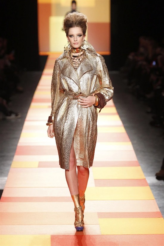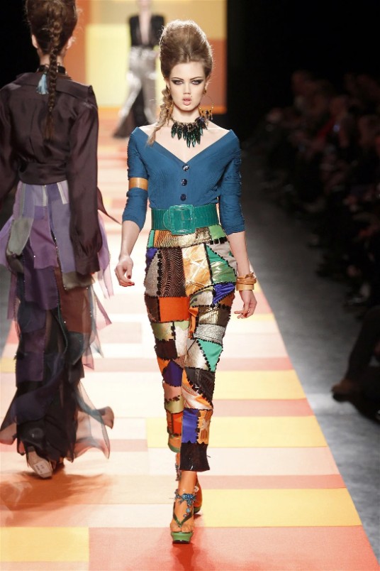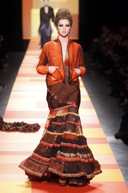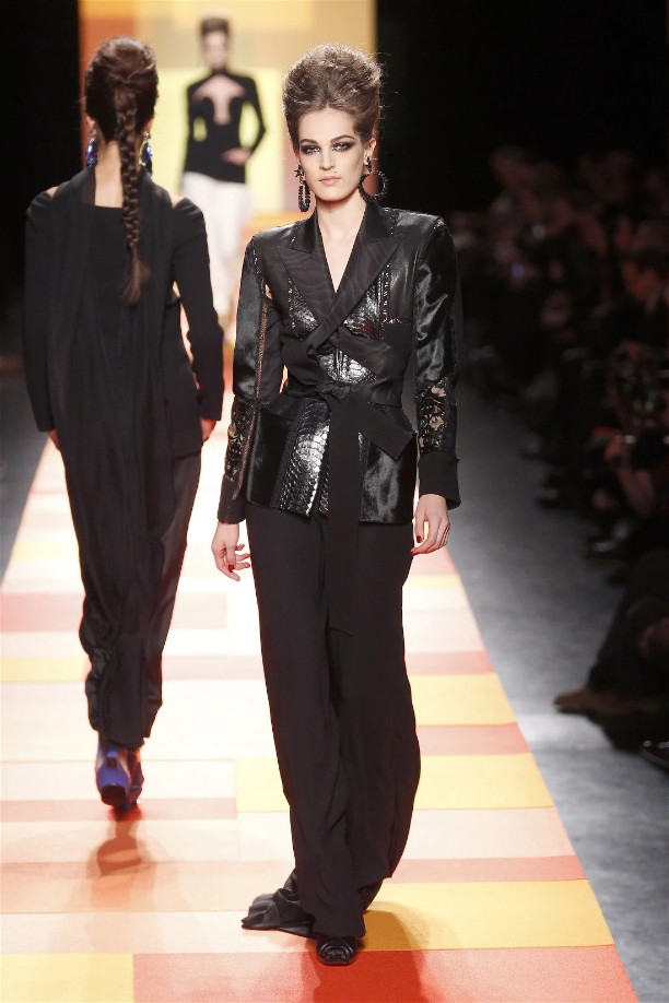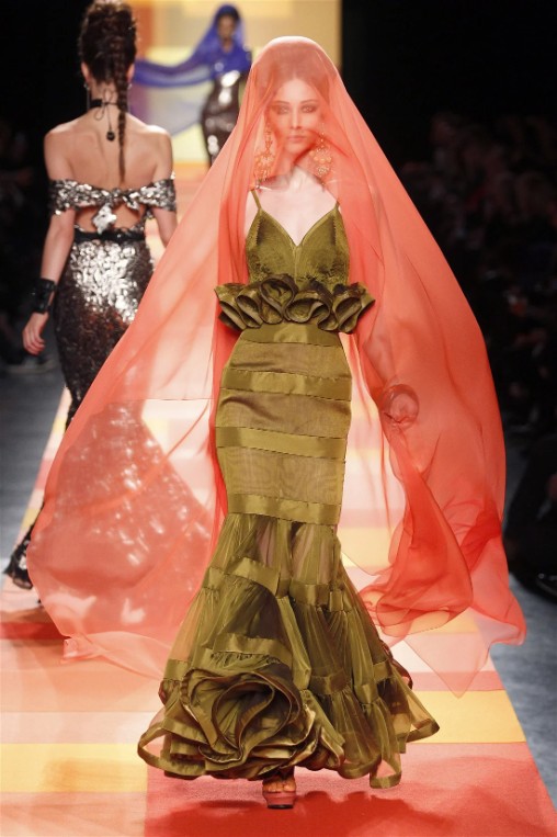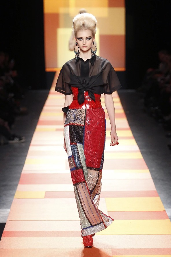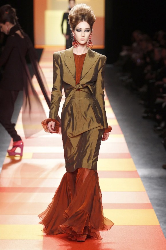 The collection featured some truly stunning pieces. Long, flared skirts with dramatic patchwork and off-the-shoulder tops evoked a fortune-teller’s whimsy, while tailored dhotis and luxe snakeskin trench coats brought a touch of modern edge. The explosion of saffron, fuchsia, and chartreuse hues was undeniably uplifting, reflecting Gaultier’s ability to channel global influences with finesse.