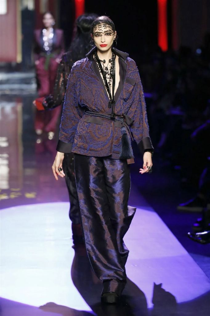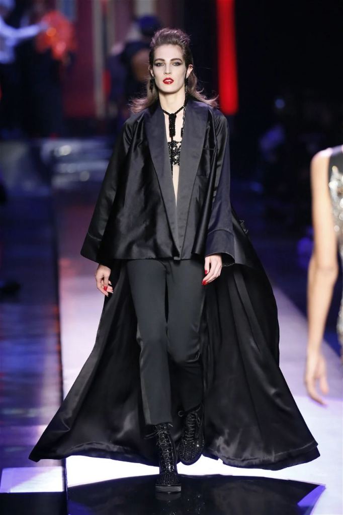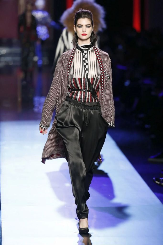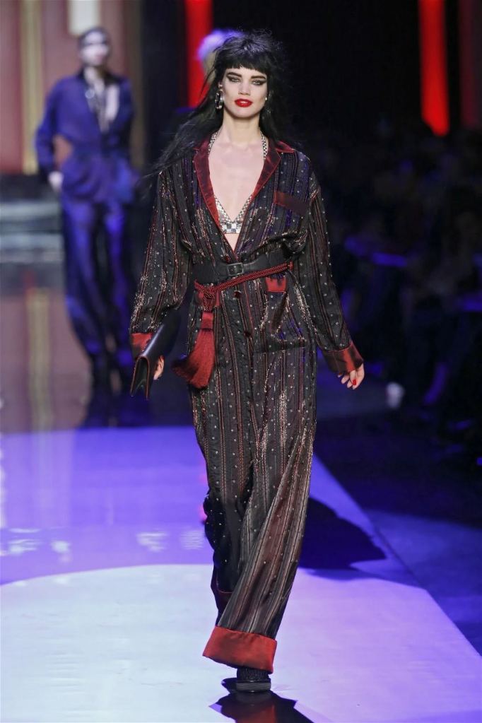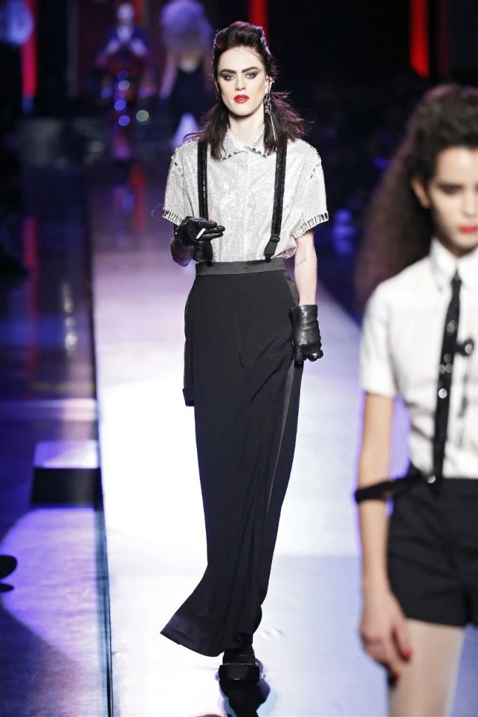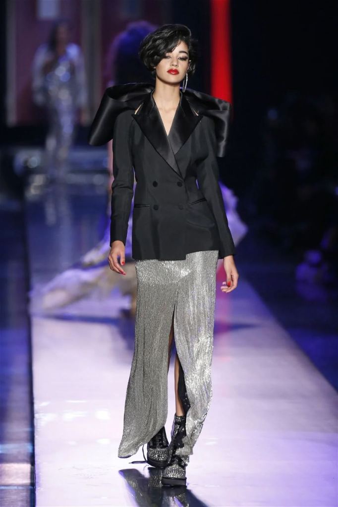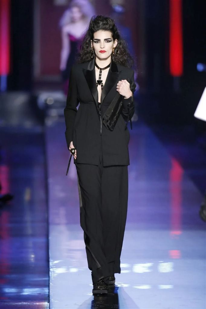 This collection was all about fun and freedom. Gaultier’s designs captured the eclectic style of Le Palace regulars, from glittering overalls reminiscent of Grace Jones to slinky evening gowns and menswear-inspired smoking jackets. Jackets were a standout, whether as leather moto styles paired with gowns or menswear cuts tied with braided sashes. Sparkling embellishments like sequins, crystals, and pearls added a sense of extravagance to relaxed silhouettes.