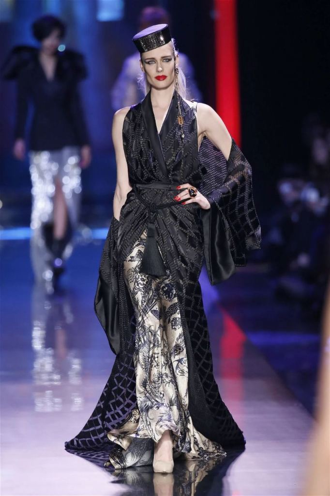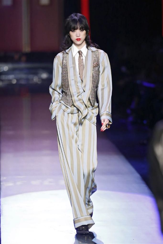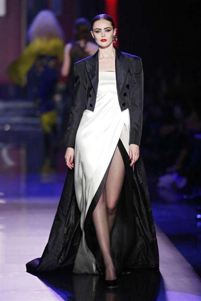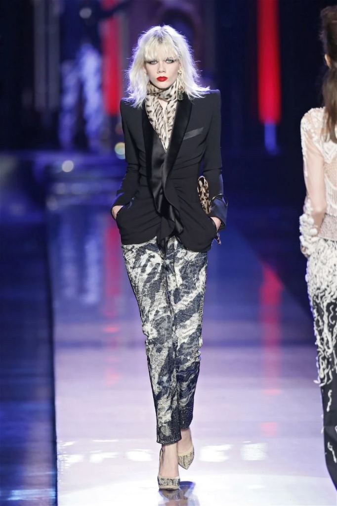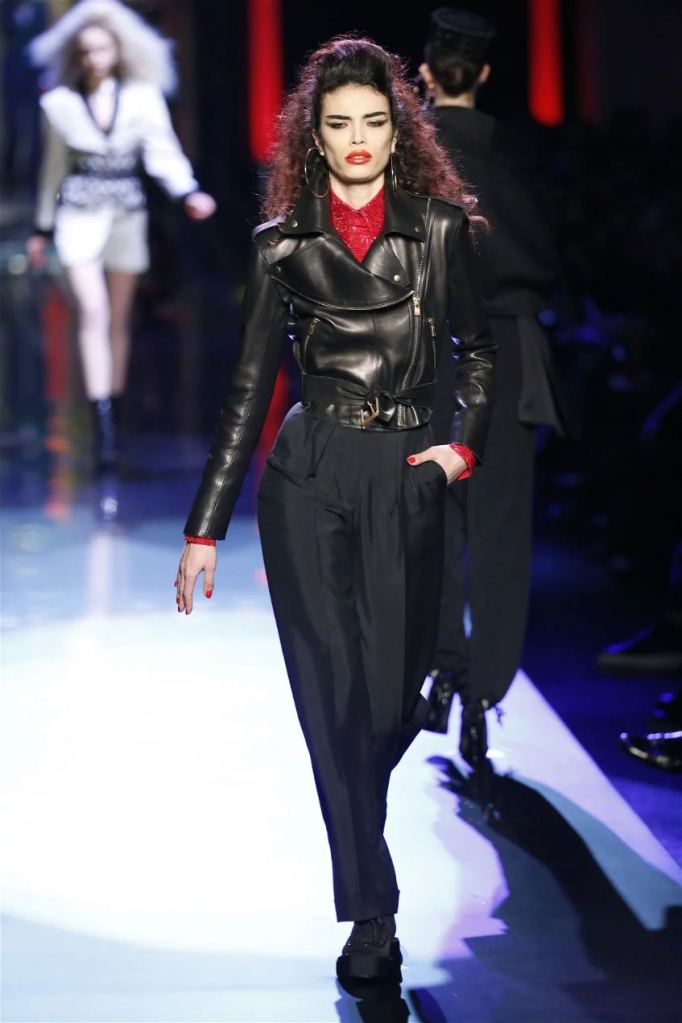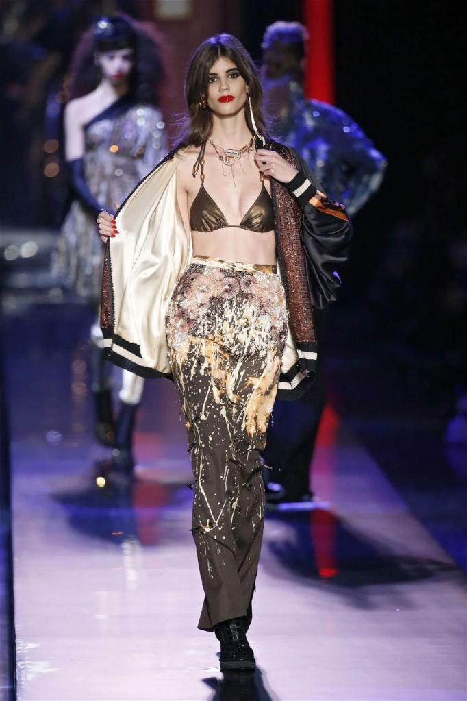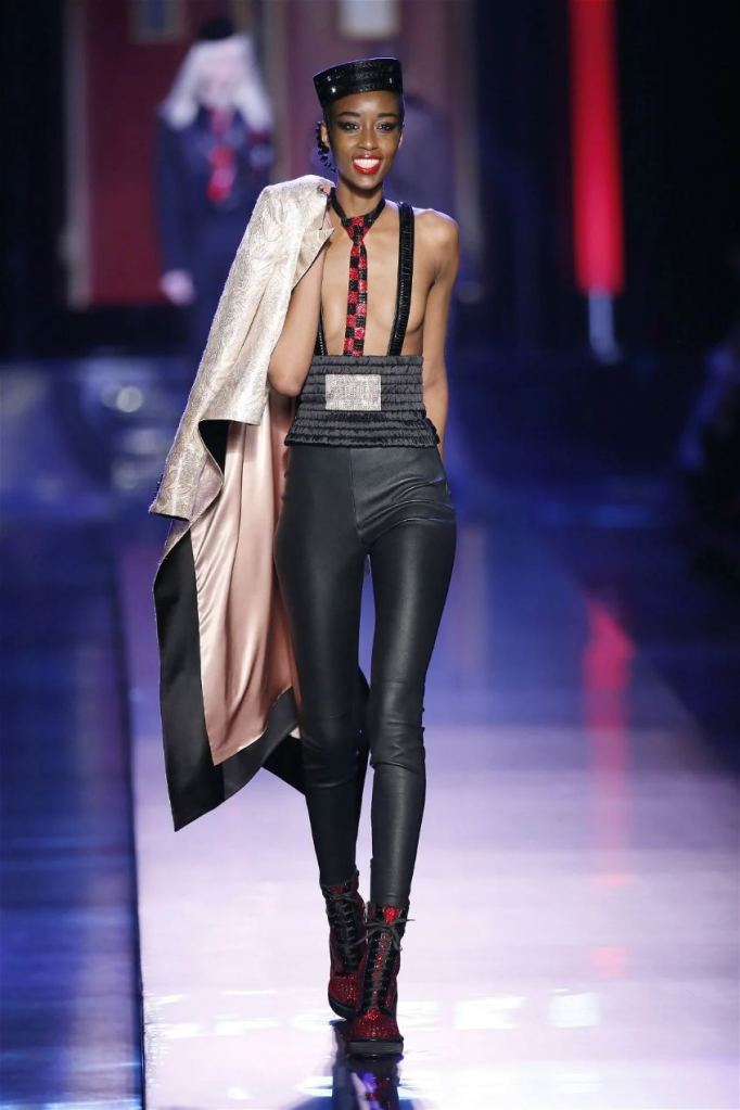 This collection was all about fun and freedom. Gaultier’s designs captured the eclectic style of Le Palace regulars, from glittering overalls reminiscent of Grace Jones to slinky evening gowns and menswear-inspired smoking jackets. Jackets were a standout, whether as leather moto styles paired with gowns or menswear cuts tied with braided sashes. Sparkling embellishments like sequins, crystals, and pearls added a sense of extravagance to relaxed silhouettes.