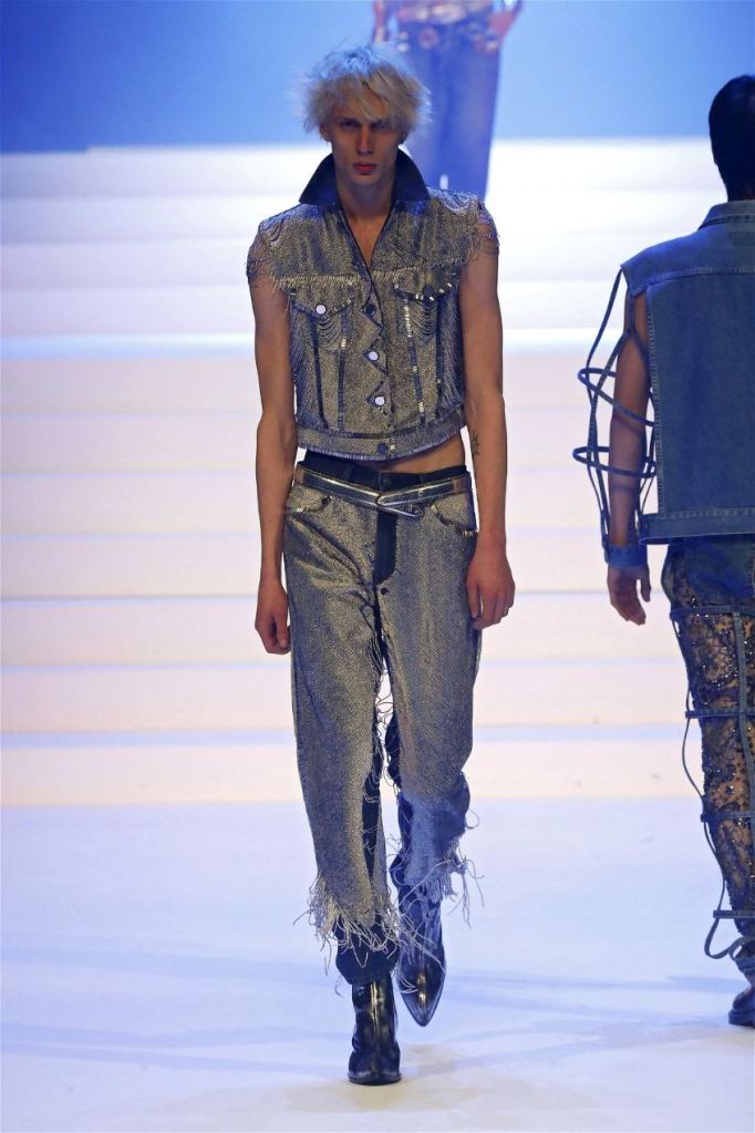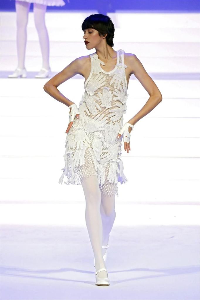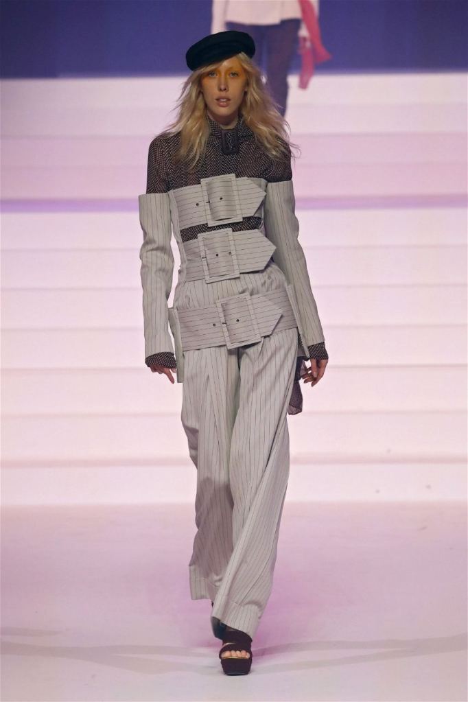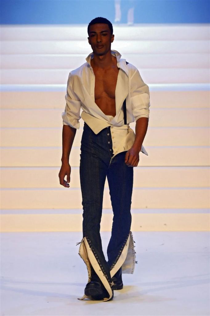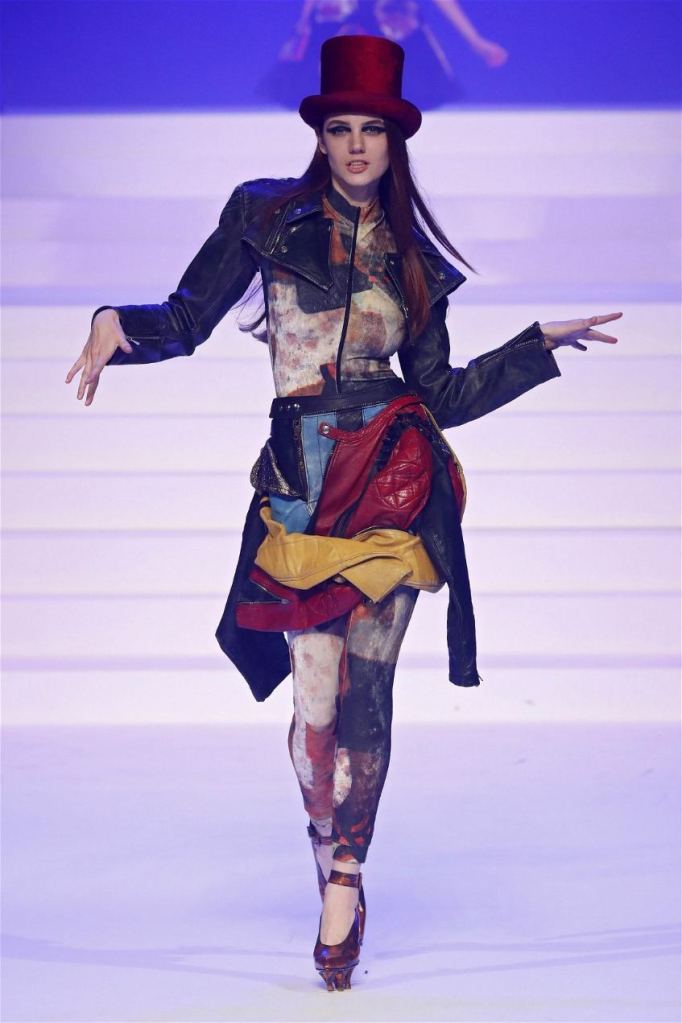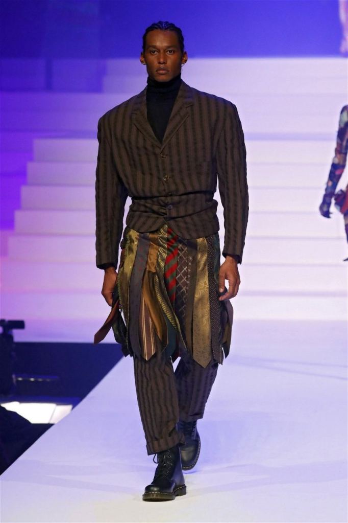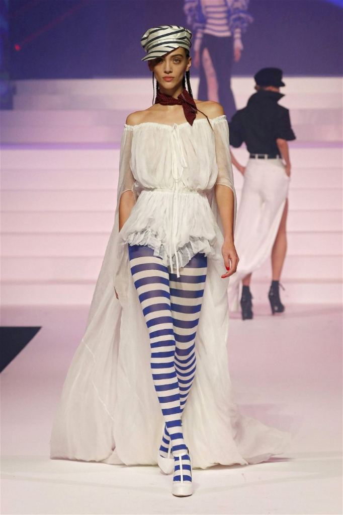 The 172-look collection showcased his iconic motifs: corsets, sailor stripes, and androgynous designs reimagined with a playful twist. A trench coat that morphed into a swimsuit, multicolored tulle gowns in camouflage patterns, and a catsuit crafted from men’s ties highlighted his creativity. His legendary cone bras and corsetry appeared in fresh forms, with ethereal, embroidered dresses and vibrant tribal-inspired designs adding a global flair. Gaultier embraced upcycling, transforming archival pieces into new creations. Over 700,000 Swarovski crystals added sparkle, while layered tulle, bodices, and unconventional fabric mixes amplified the theatricality.