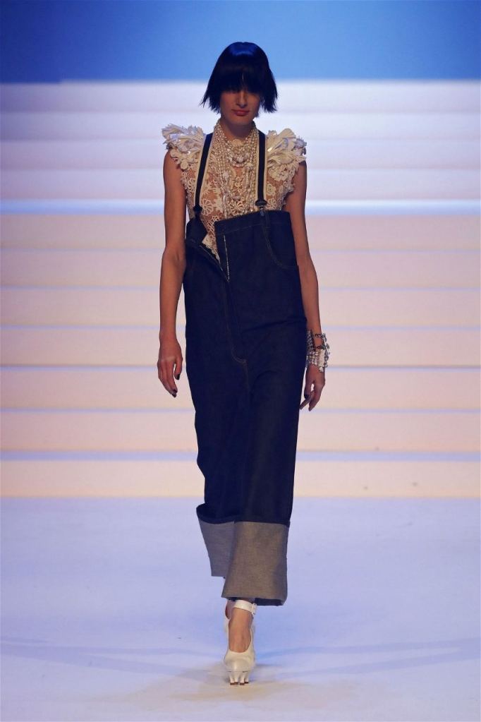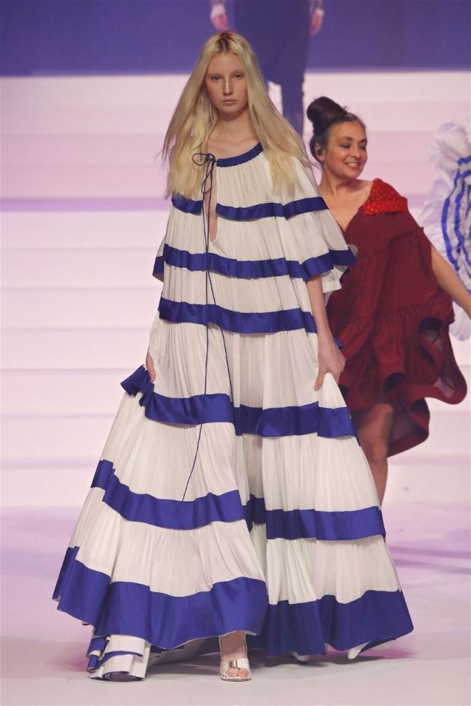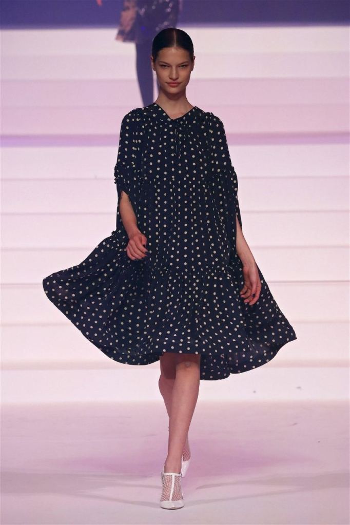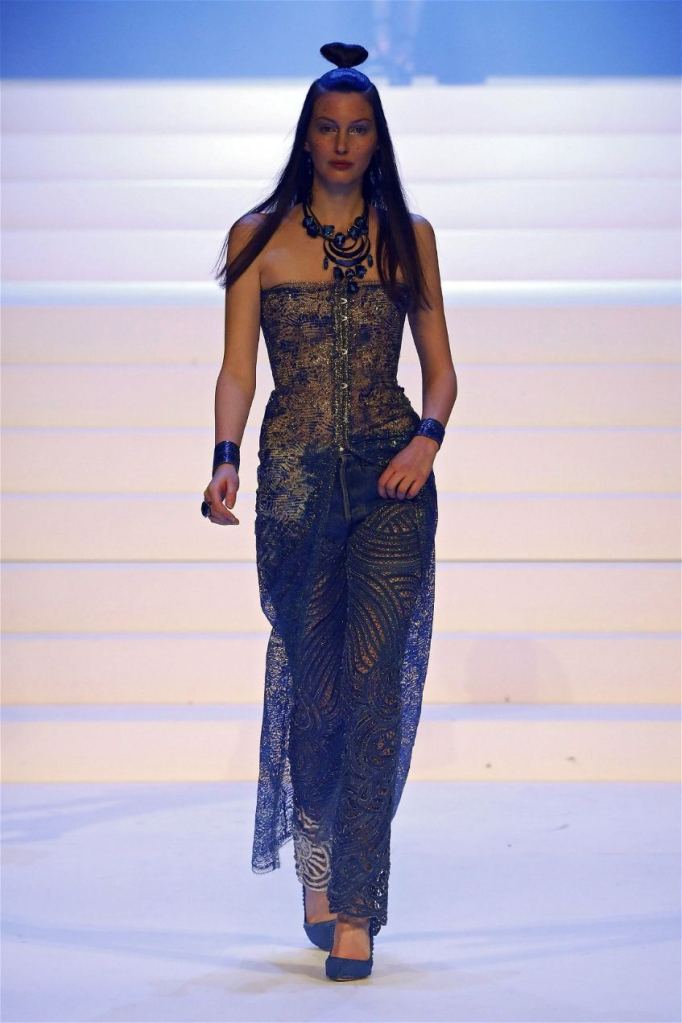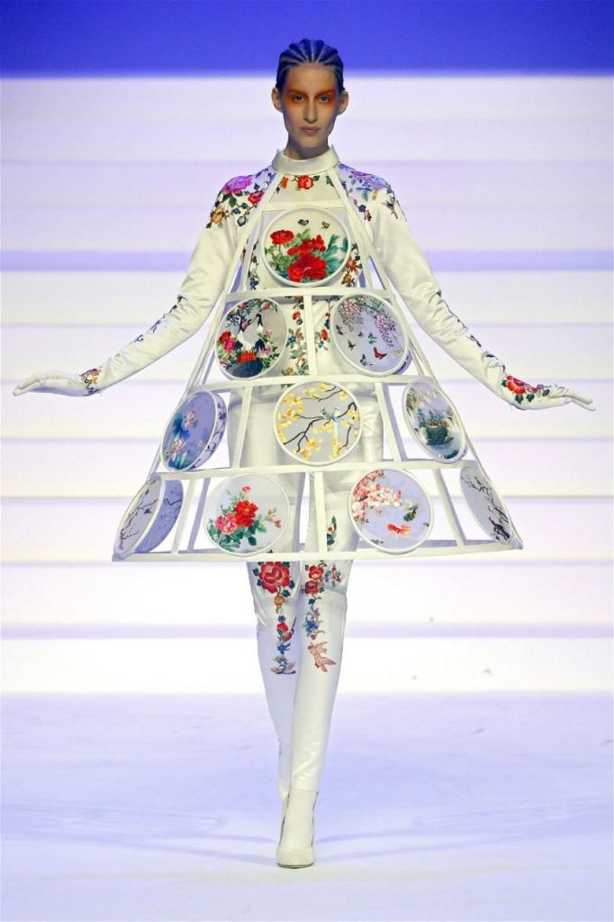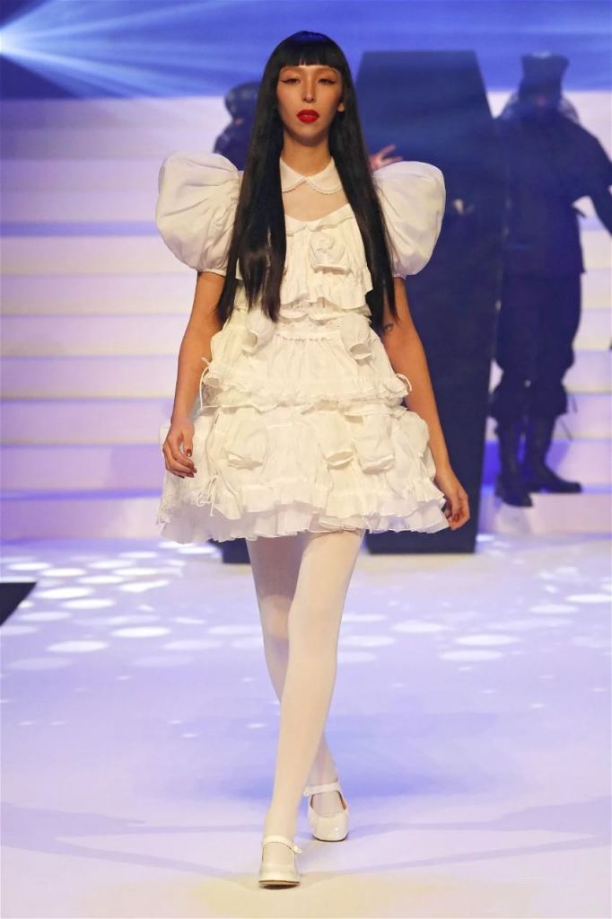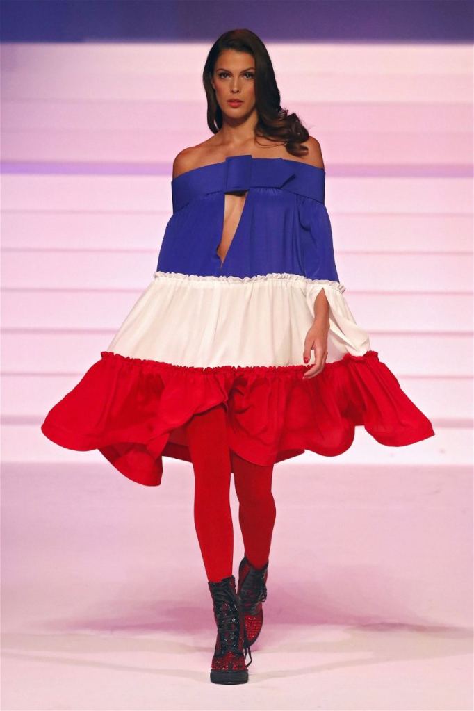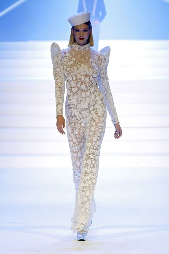 The 172-look collection showcased his iconic motifs: corsets, sailor stripes, and androgynous designs reimagined with a playful twist. A trench coat that morphed into a swimsuit, multicolored tulle gowns in camouflage patterns, and a catsuit crafted from men’s ties highlighted his creativity. His legendary cone bras and corsetry appeared in fresh forms, with ethereal, embroidered dresses and vibrant tribal-inspired designs adding a global flair. Gaultier embraced upcycling, transforming archival pieces into new creations. Over 700,000 Swarovski crystals added sparkle, while layered tulle, bodices, and unconventional fabric mixes amplified the theatricality.