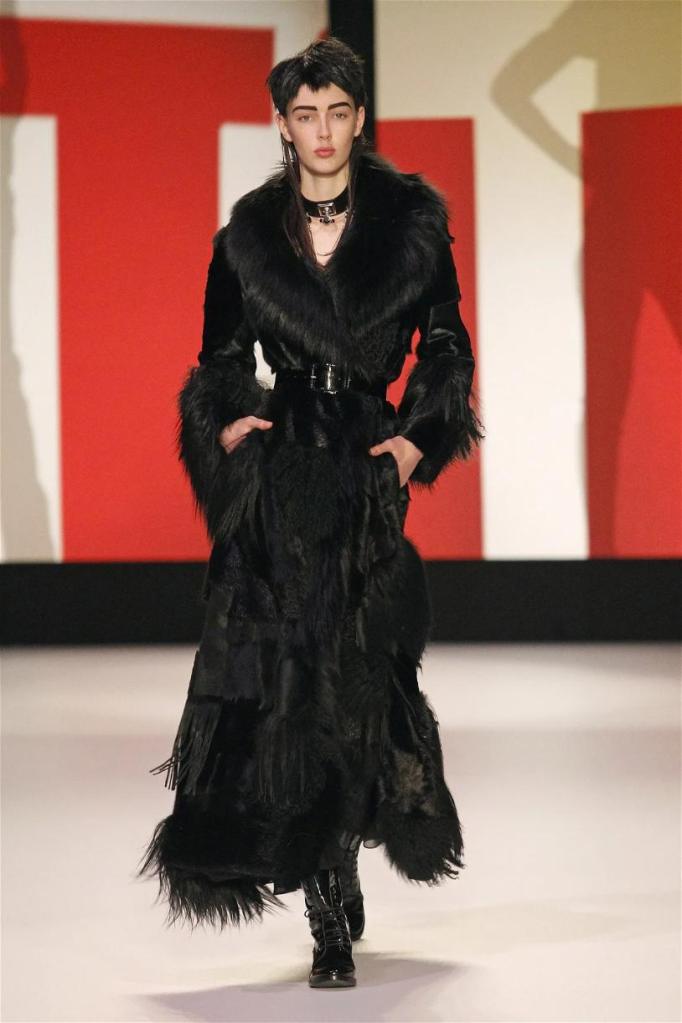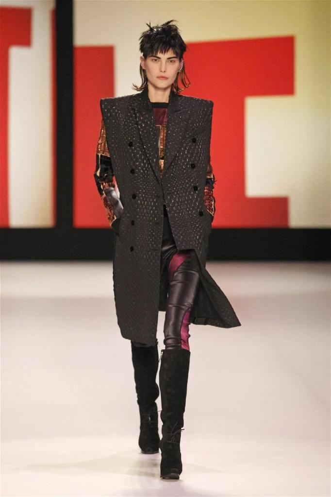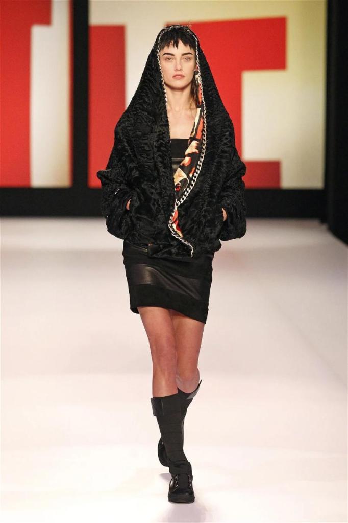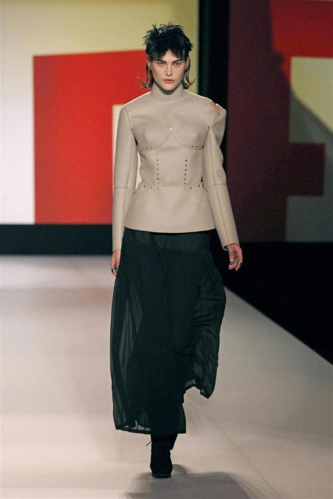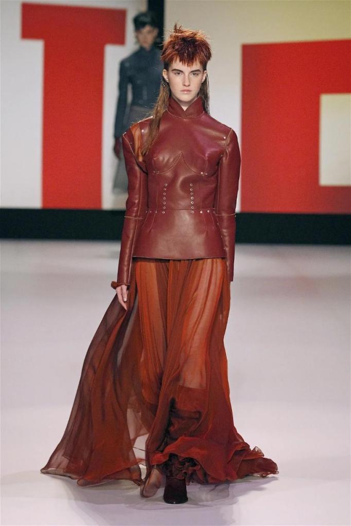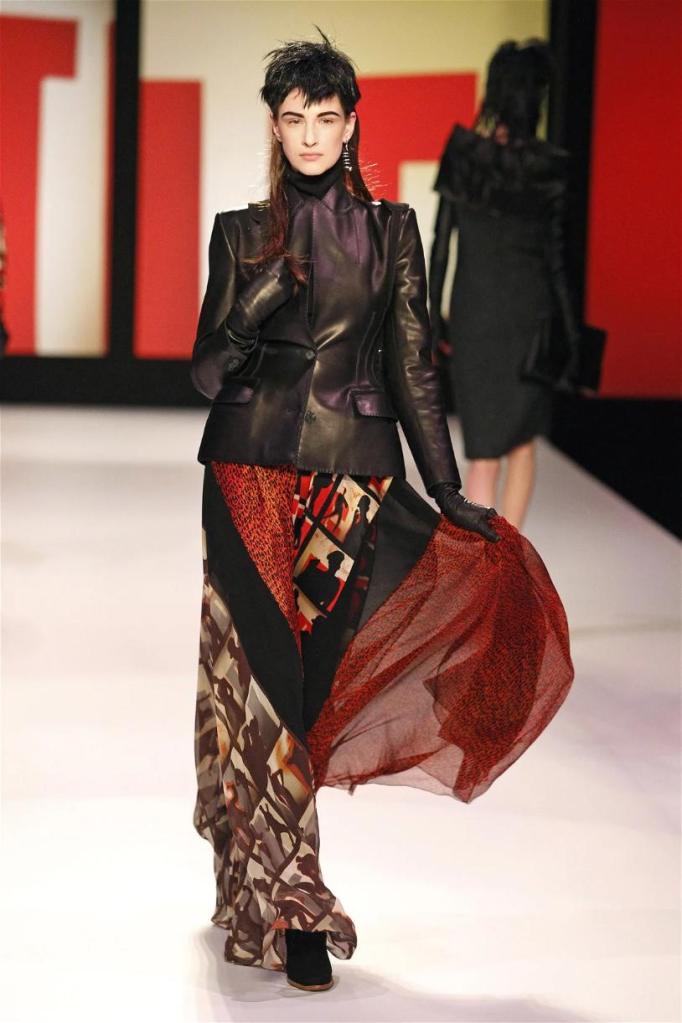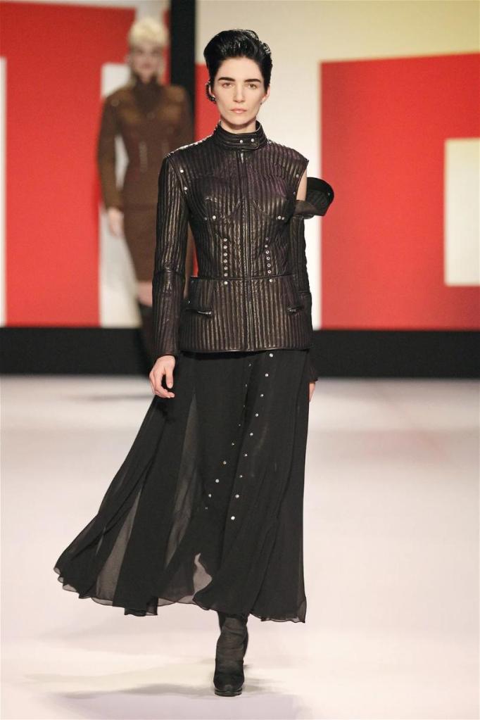 This Jean Paul Gaultier collection, showcased at the iconic Salle Wagram in Paris, was a study in contrasts, blending strength and femininity with wearable designs. Opening with bold, armor-like studded jackets paired with flowing muslin skirts, the collection set a tone of edgy elegance. Gaultier’s signature flair was evident in his masterful use of textures, with patchwork designs that incorporated felt, leather, fur, and iridescent lamés. Fur was a standout element, adding a touch of winter luxury to the collection, with dramatic coats that were both cozy and striking.