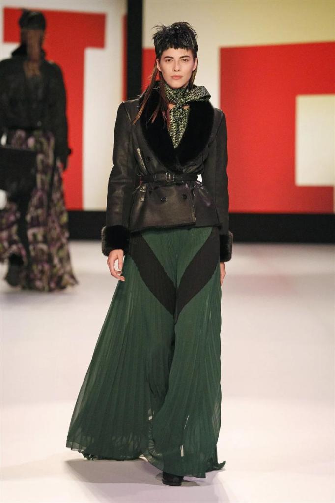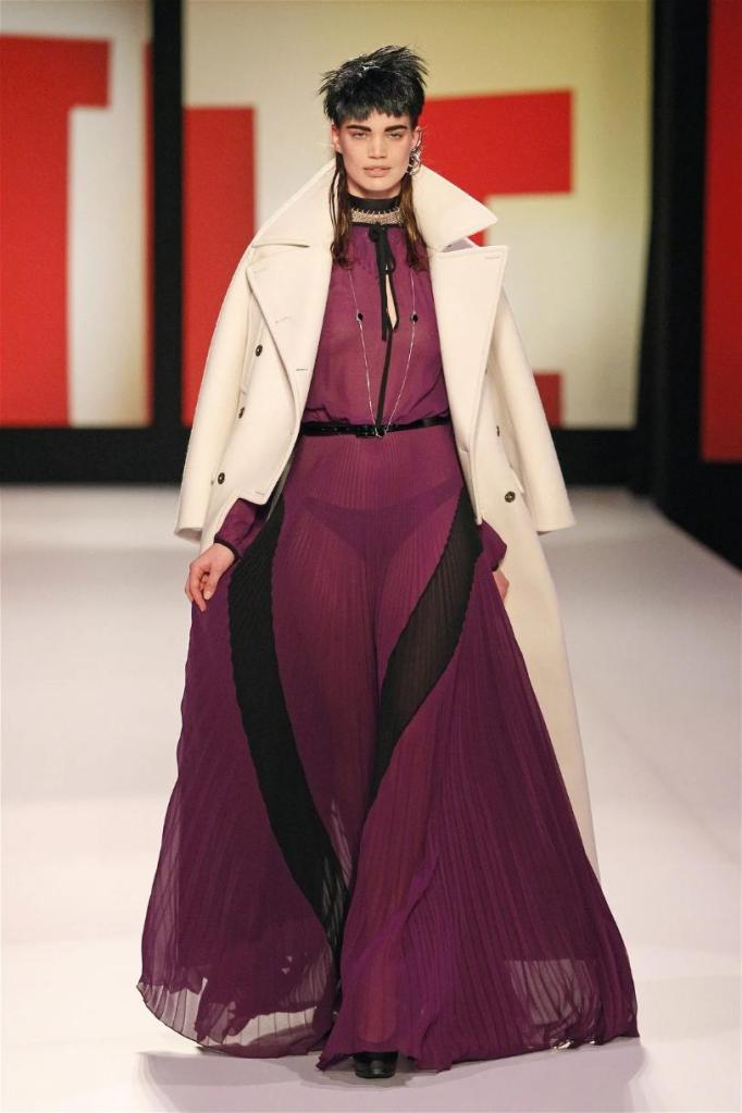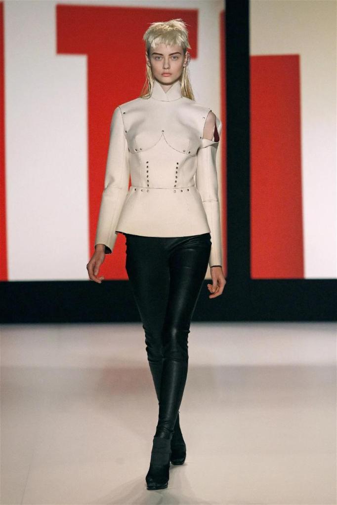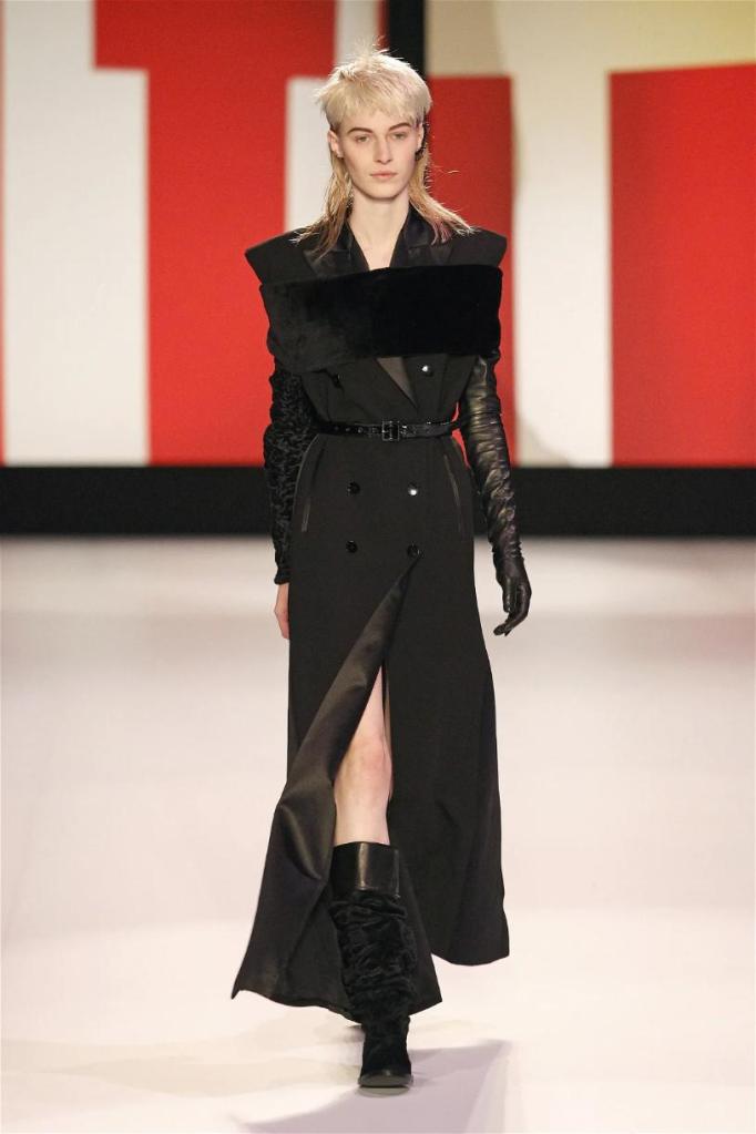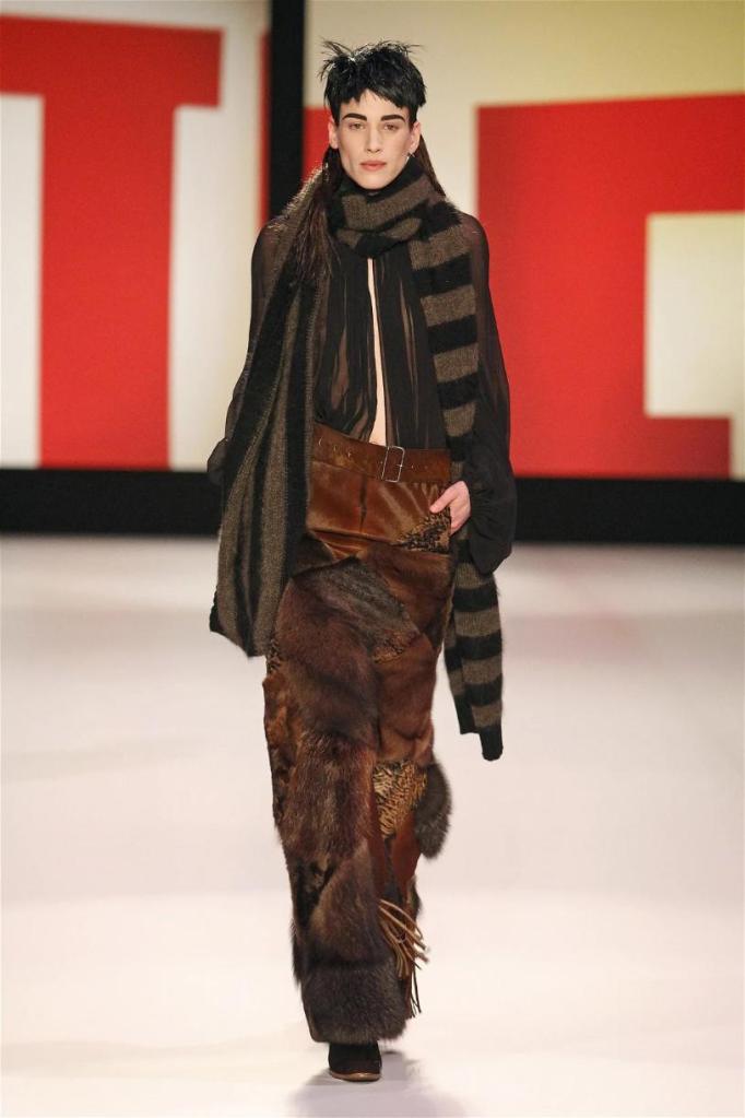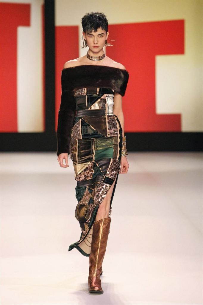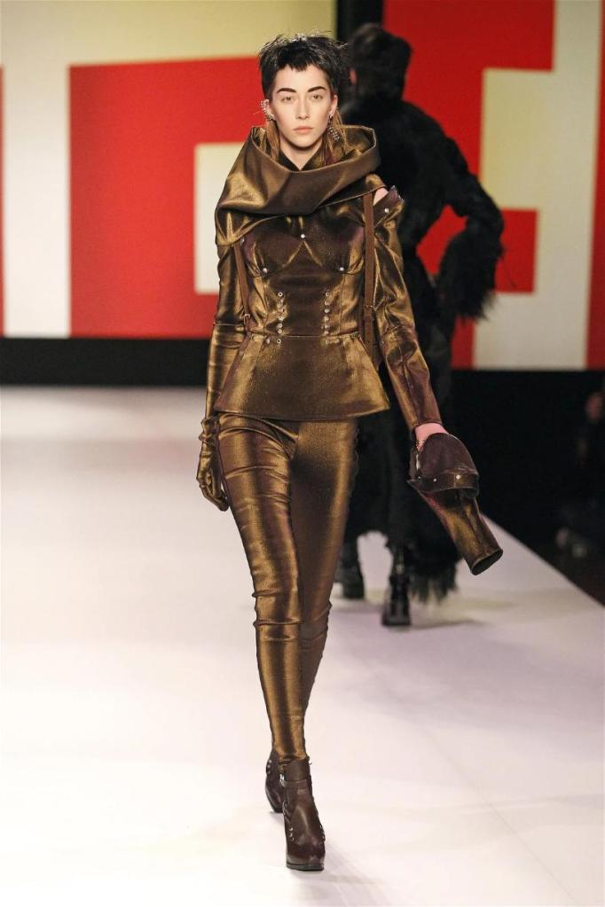 This Jean Paul Gaultier collection, showcased at the iconic Salle Wagram in Paris, was a study in contrasts, blending strength and femininity with wearable designs. Opening with bold, armor-like studded jackets paired with flowing muslin skirts, the collection set a tone of edgy elegance. Gaultier’s signature flair was evident in his masterful use of textures, with patchwork designs that incorporated felt, leather, fur, and iridescent lamés. Fur was a standout element, adding a touch of winter luxury to the collection, with dramatic coats that were both cozy and striking.