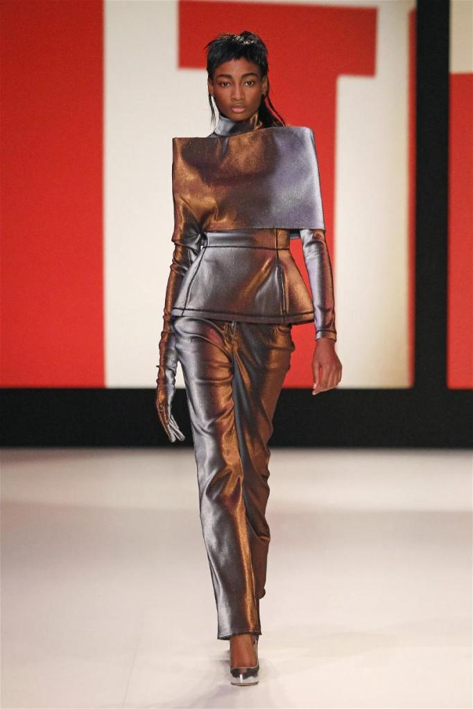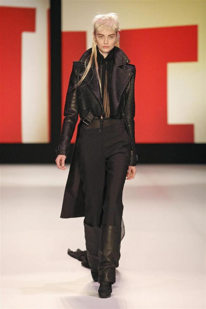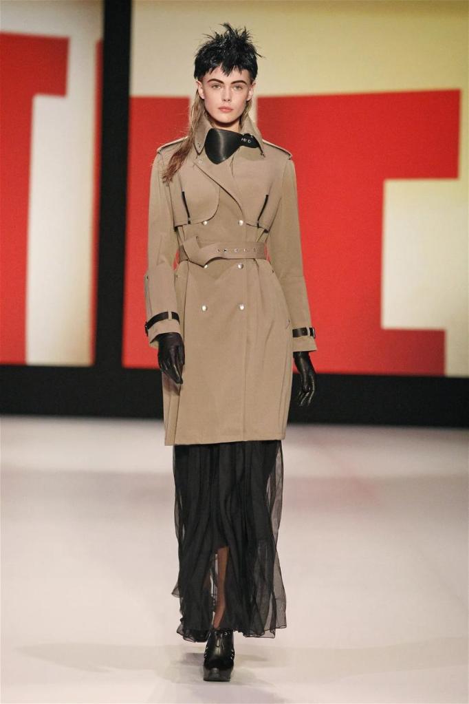 The lineup included wardrobe staples like trench coats, duster coats, leather jackets, and reimagined marinière stripes. These pieces, while practical and ready-to-wear, lacked the wow factor often associated with Gaultier. Creative geometric patterns and layered ensembles added interest, but the overall effect felt simple and somewhat forgettable. While well-constructed and elegant, the collection missed a defining moment that could make it truly memorable.