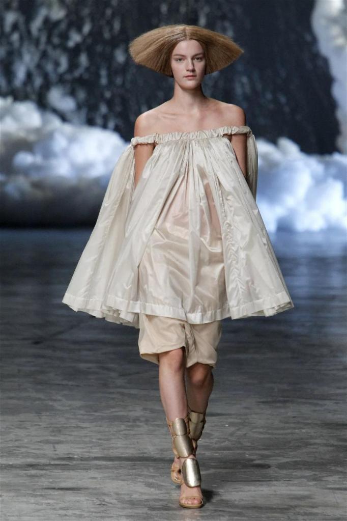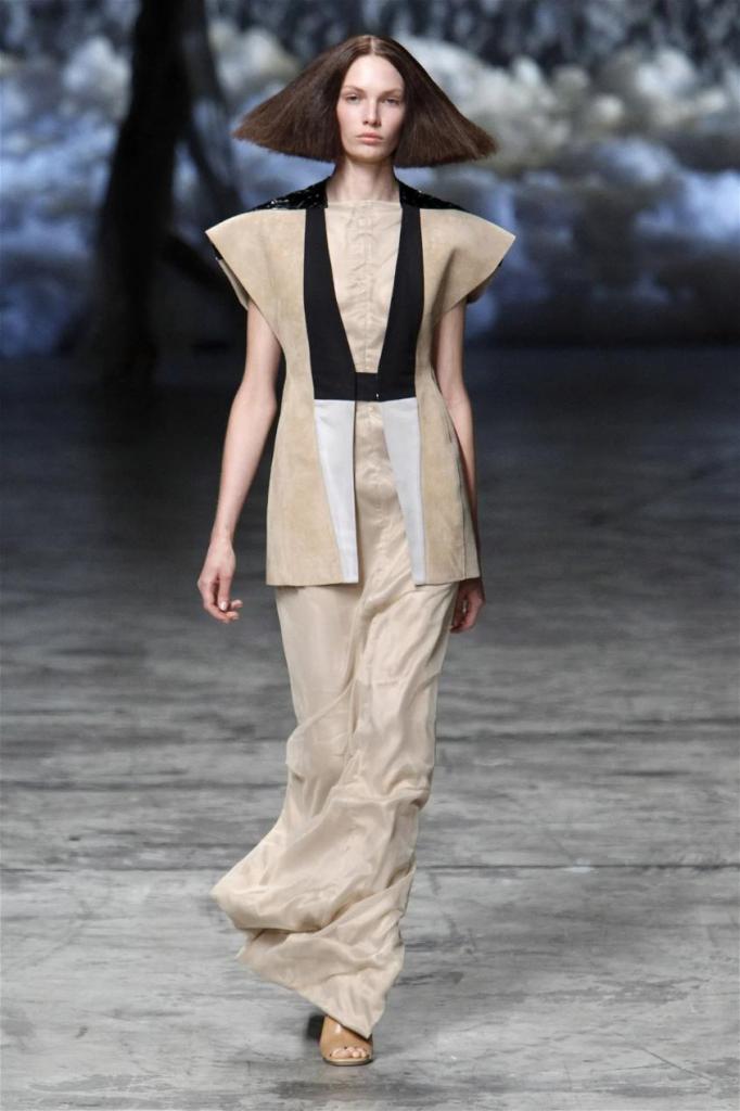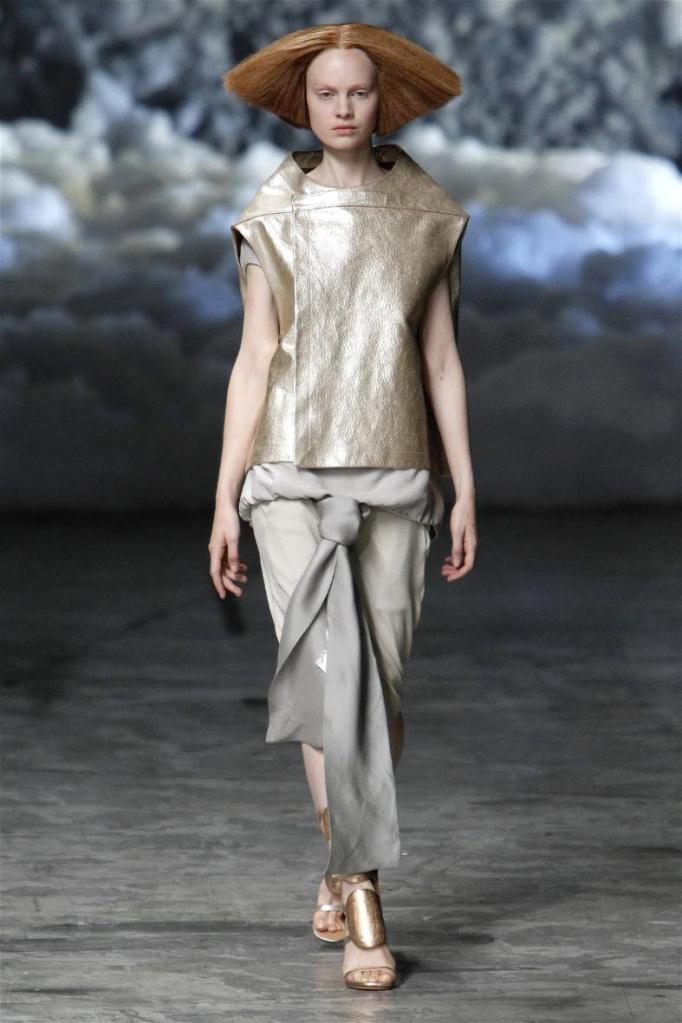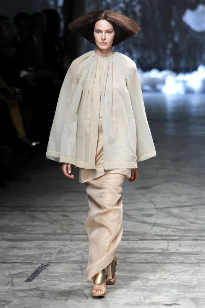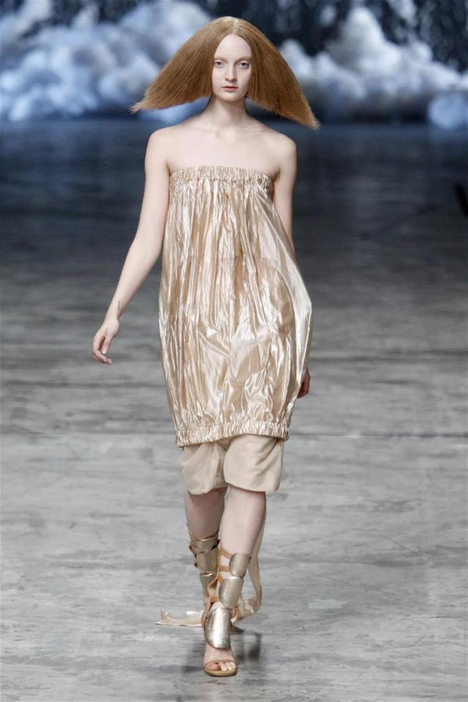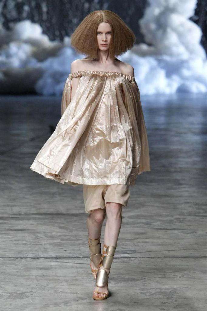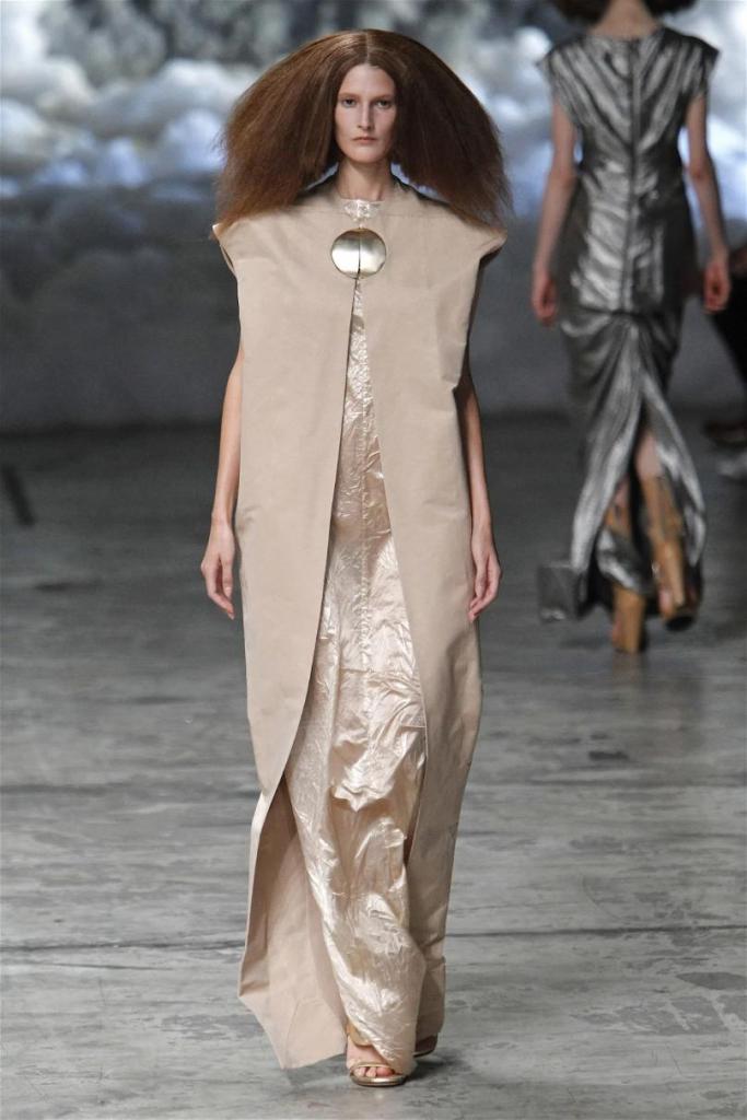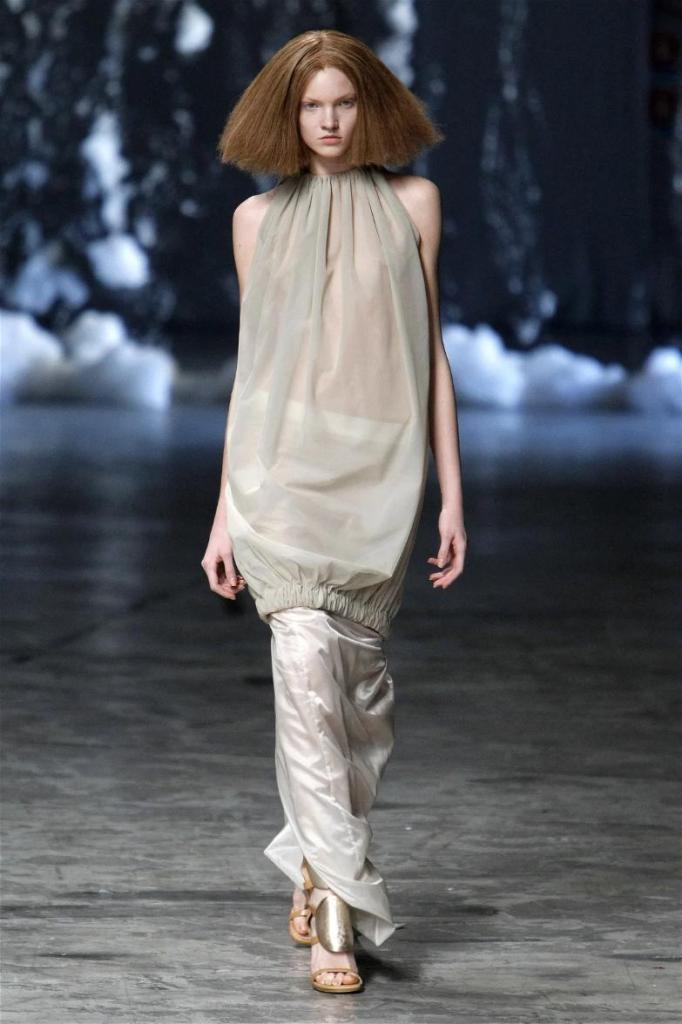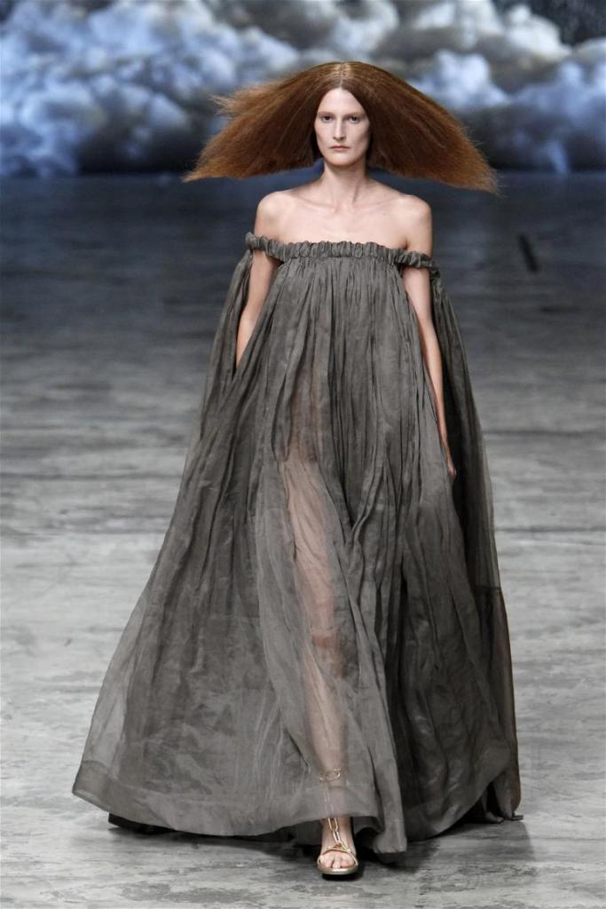 Known for his dark, gothic edge, Owens embraced a lighter mood this time, inspired by Gustav Klimt and the Ballets Russes. The collection featured shimmering fabrics, soft hues like sand and pearl, and striking silhouettes—voluminous tops paired with sleek skirts. Subtle details, like tiny knots and metallic accents, added an understated elegance. Owens described this vision as a retreat, a place of peace and kindness. The result? A celestial, modern-day muse brought to life, both serene and sublime. One of the standout aspects of this collection was its ability to merge minimalism with extravagant details. Models walked the runway in garments that showcased intricate textures and unusual shapes, creating an almost sculptural effect.