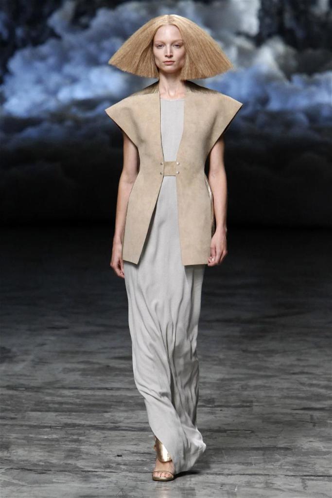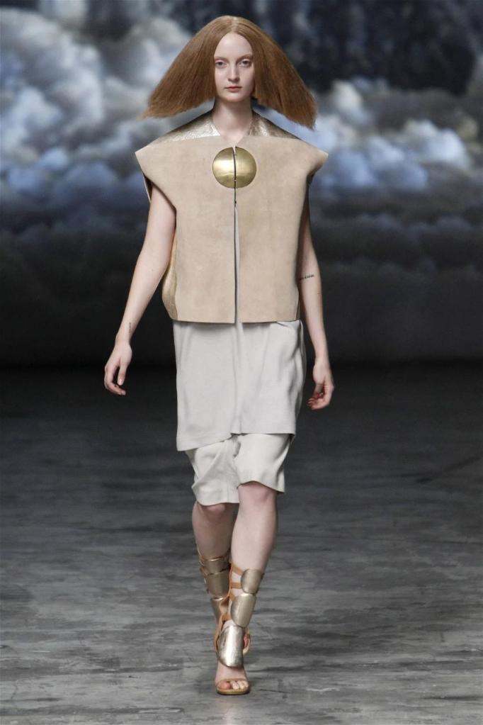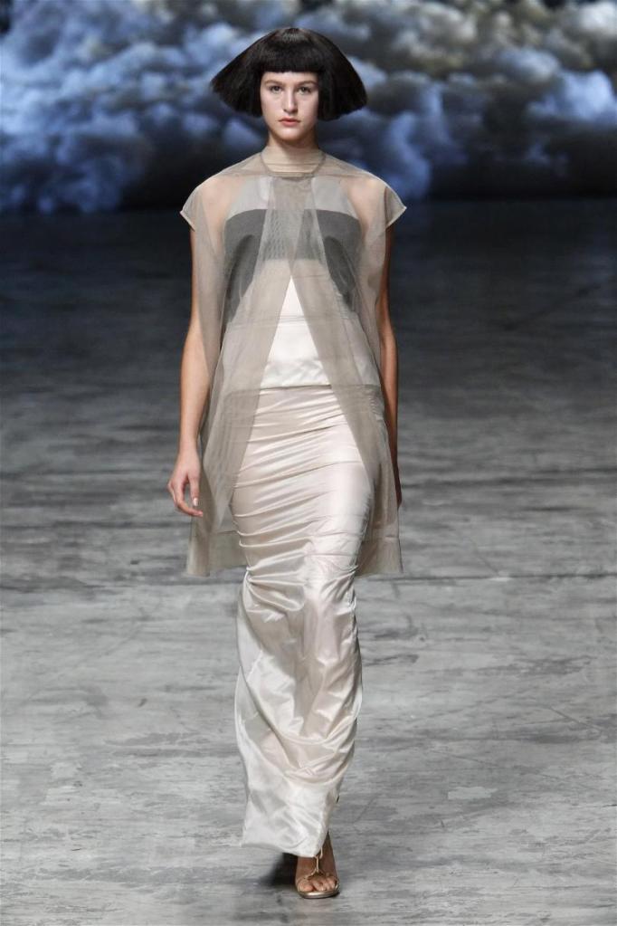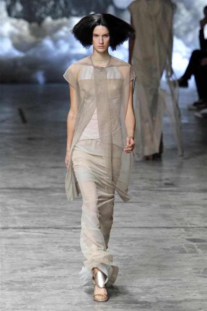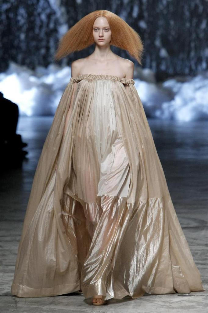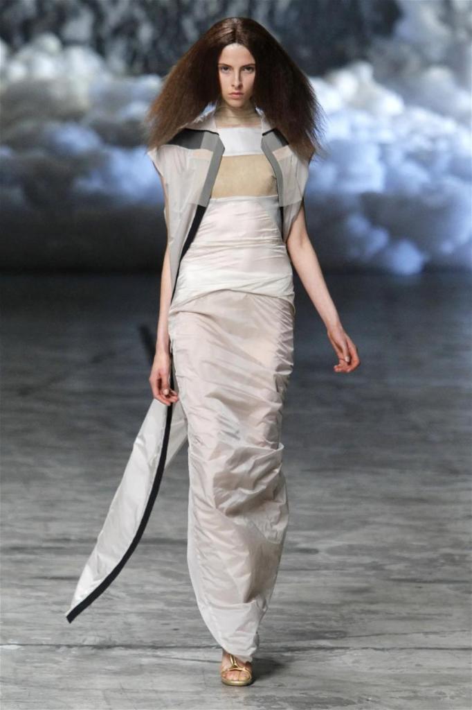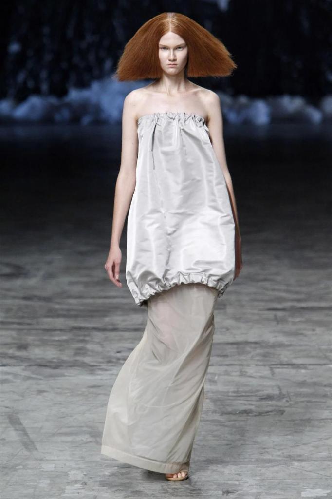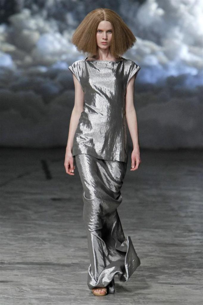 Known for his dark, gothic edge, Owens embraced a lighter mood this time, inspired by Gustav Klimt and the Ballets Russes. The collection featured shimmering fabrics, soft hues like sand and pearl, and striking silhouettes—voluminous tops paired with sleek skirts. Subtle details, like tiny knots and metallic accents, added an understated elegance. Owens described this vision as a retreat, a place of peace and kindness. The result? A celestial, modern-day muse brought to life, both serene and sublime. One of the standout aspects of this collection was its ability to merge minimalism with extravagant details. Models walked the runway in garments that showcased intricate textures and unusual shapes, creating an almost sculptural effect.