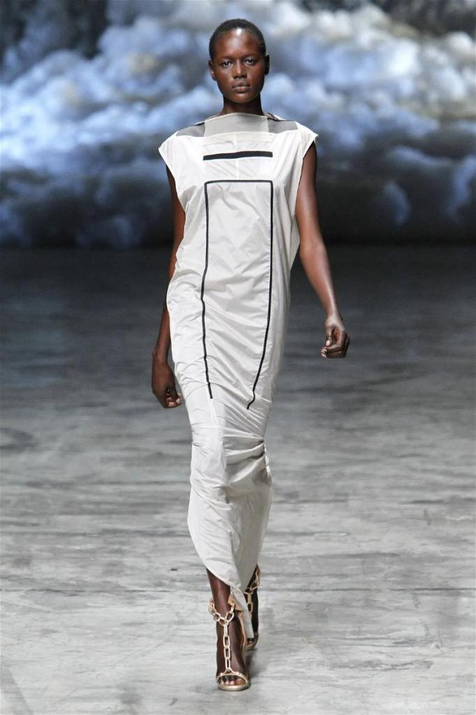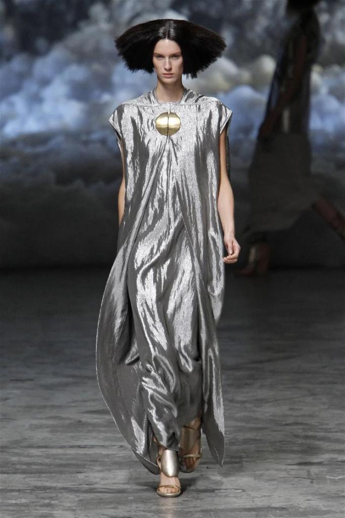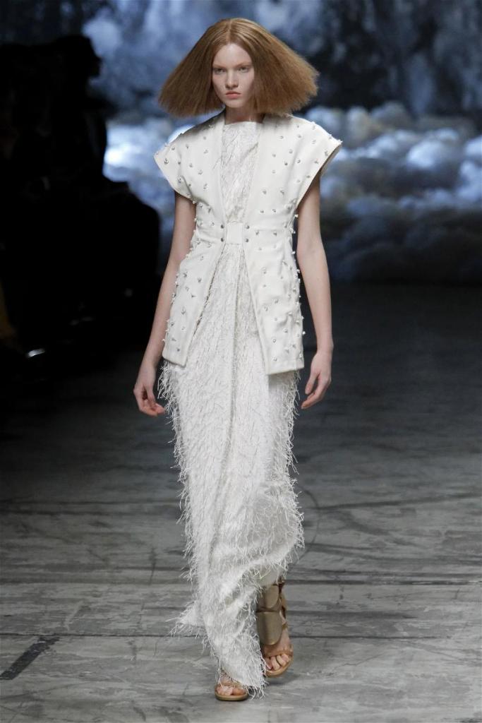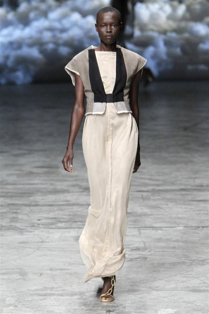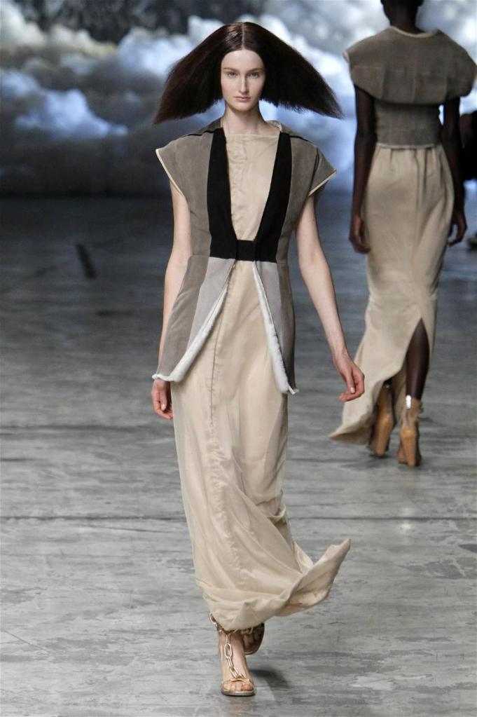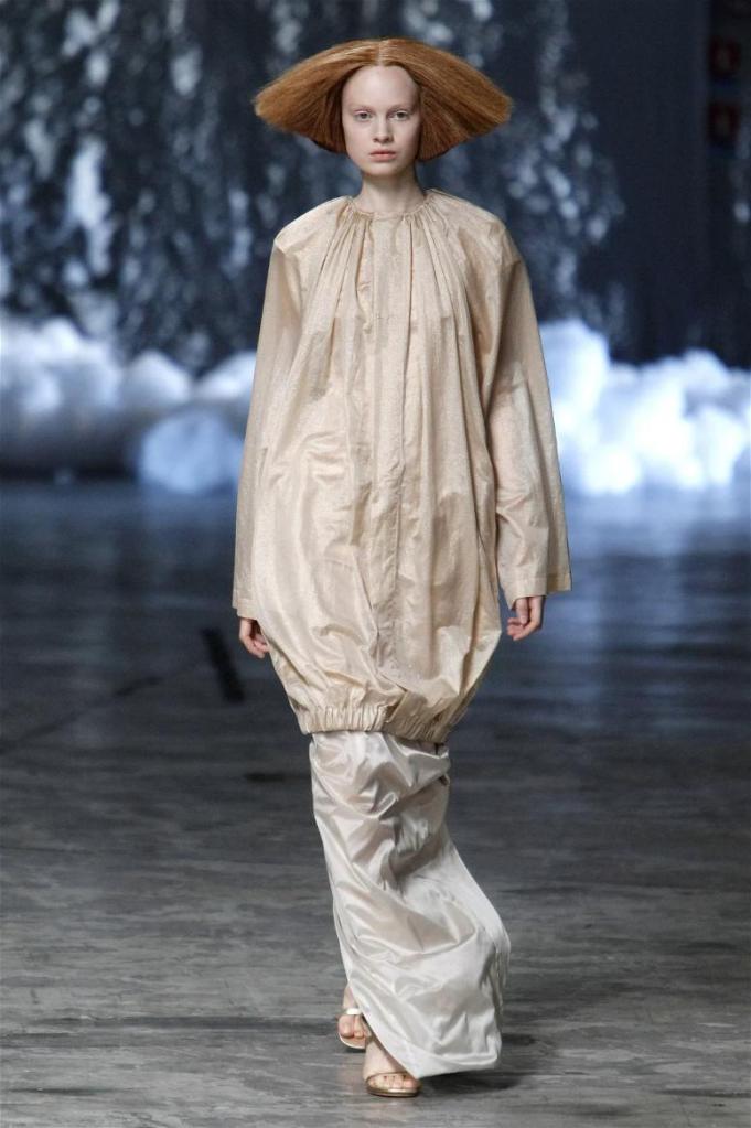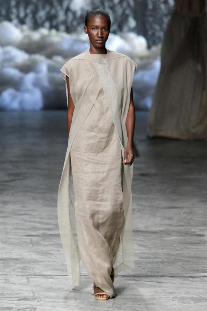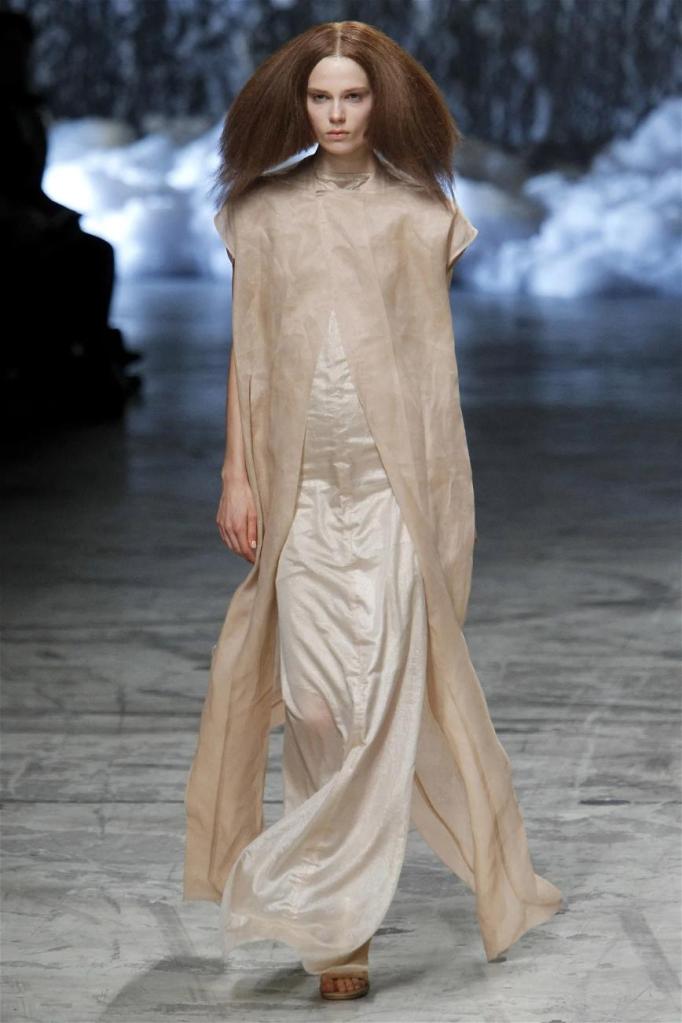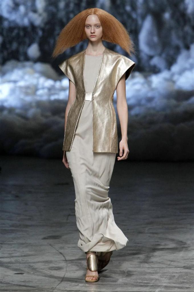 Known for his dark, gothic edge, Owens embraced a lighter mood this time, inspired by Gustav Klimt and the Ballets Russes. The collection featured shimmering fabrics, soft hues like sand and pearl, and striking silhouettes—voluminous tops paired with sleek skirts. Subtle details, like tiny knots and metallic accents, added an understated elegance. Owens described this vision as a retreat, a place of peace and kindness. The result? A celestial, modern-day muse brought to life, both serene and sublime. One of the standout aspects of this collection was its ability to merge minimalism with extravagant details. Models walked the runway in garments that showcased intricate textures and unusual shapes, creating an almost sculptural effect.