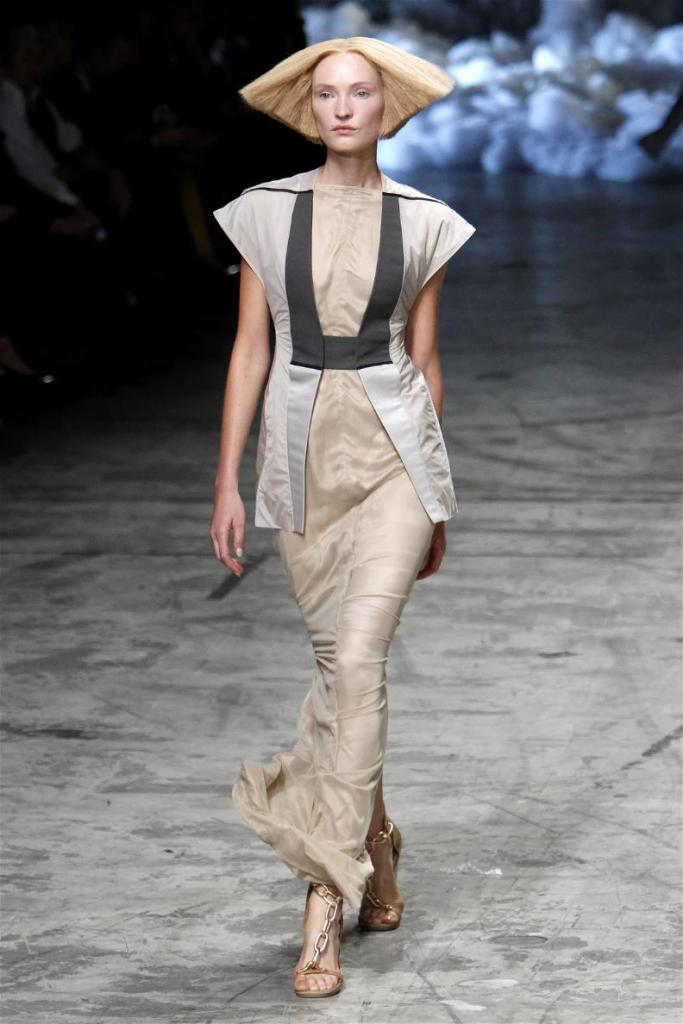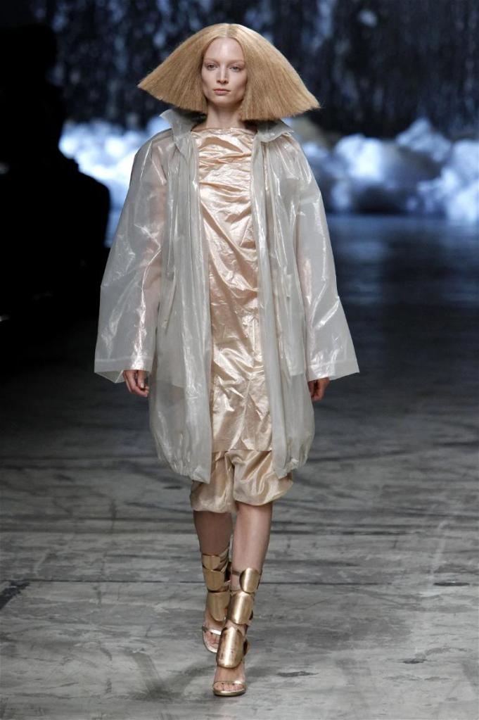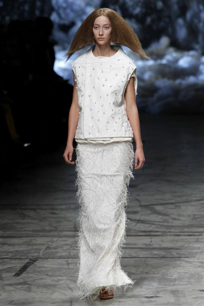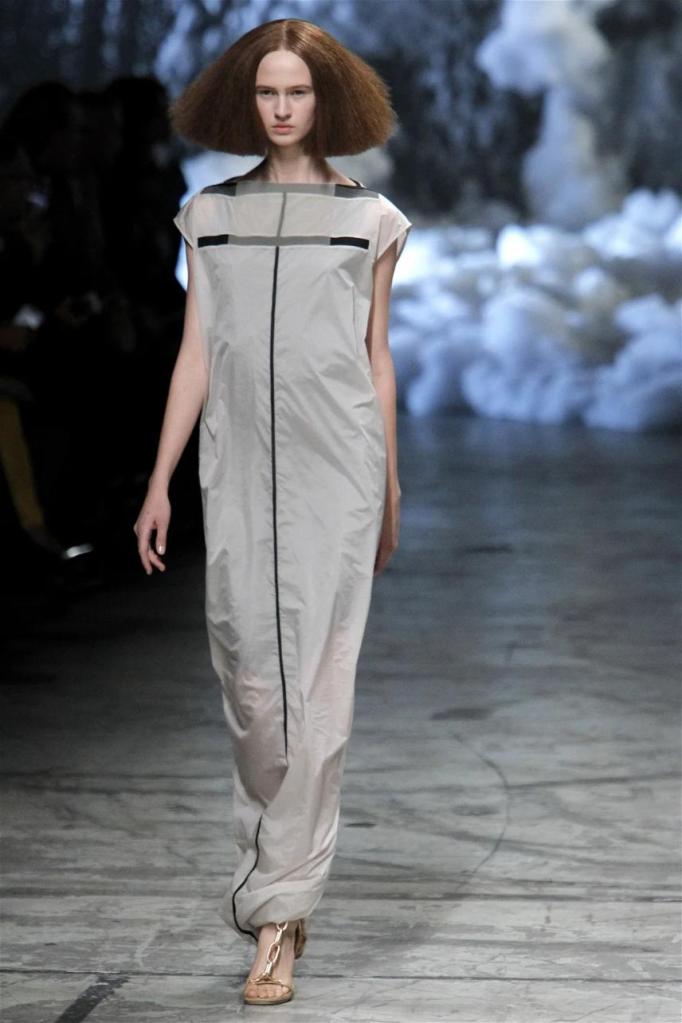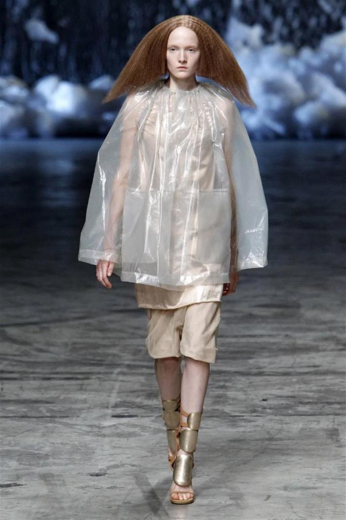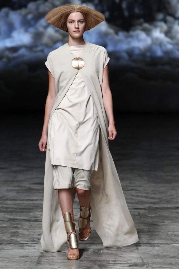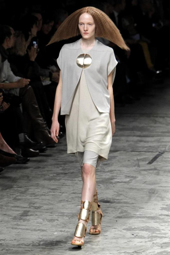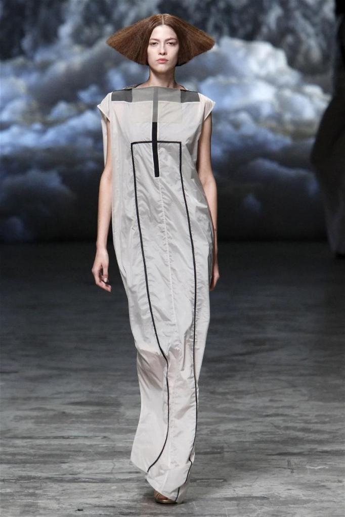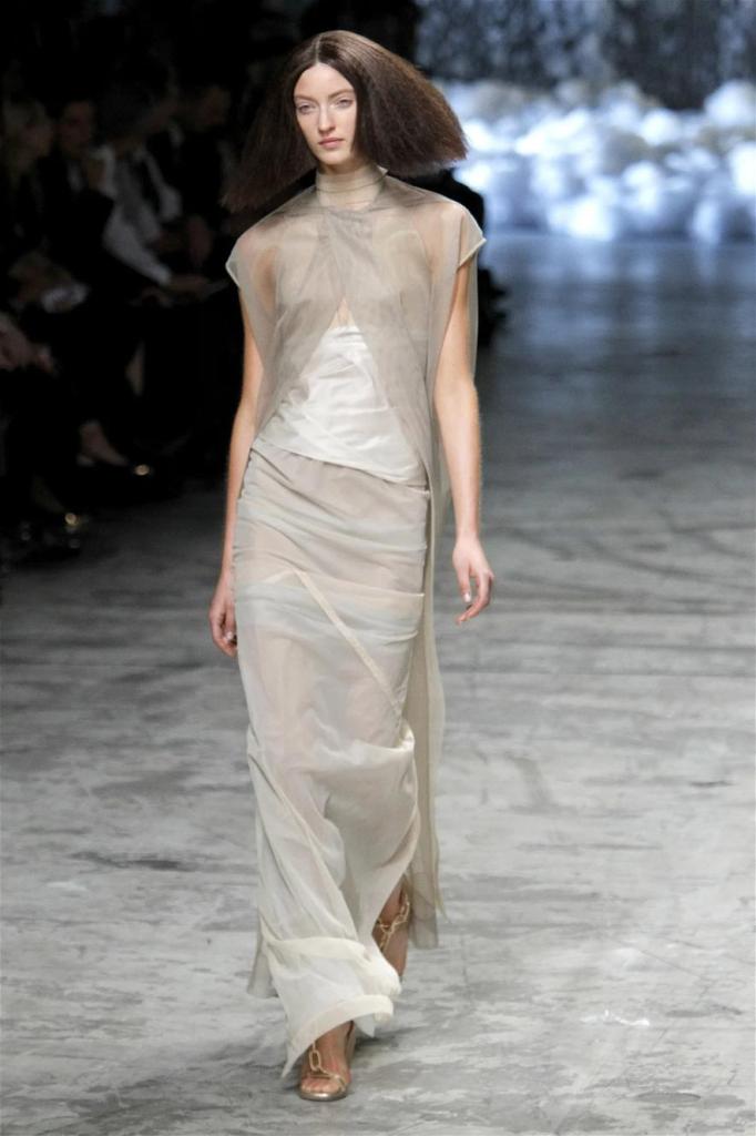 Known for his dark, gothic edge, Owens embraced a lighter mood this time, inspired by Gustav Klimt and the Ballets Russes. The collection featured shimmering fabrics, soft hues like sand and pearl, and striking silhouettes—voluminous tops paired with sleek skirts. Subtle details, like tiny knots and metallic accents, added an understated elegance. Owens described this vision as a retreat, a place of peace and kindness. The result? A celestial, modern-day muse brought to life, both serene and sublime. One of the standout aspects of this collection was its ability to merge minimalism with extravagant details. Models walked the runway in garments that showcased intricate textures and unusual shapes, creating an almost sculptural effect.