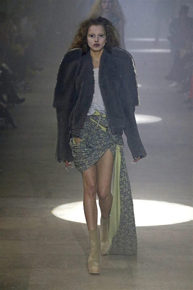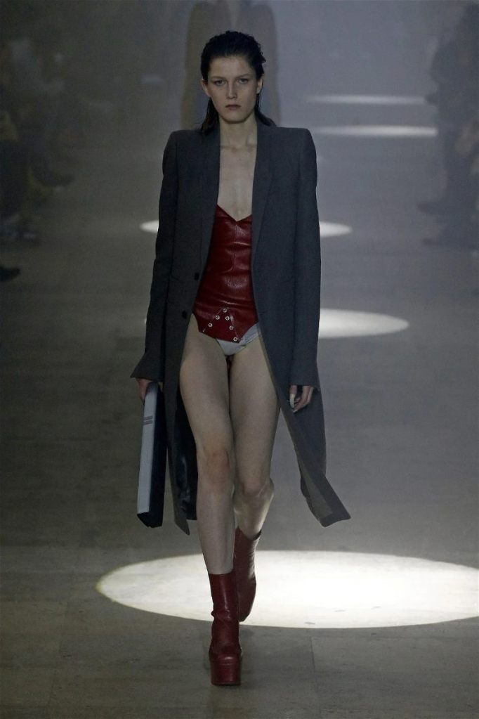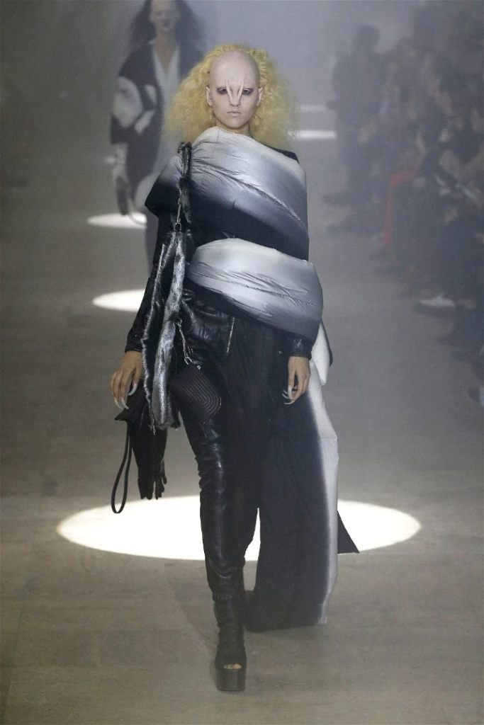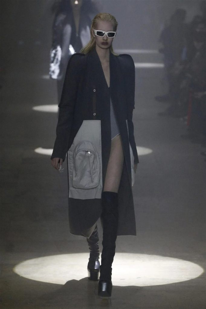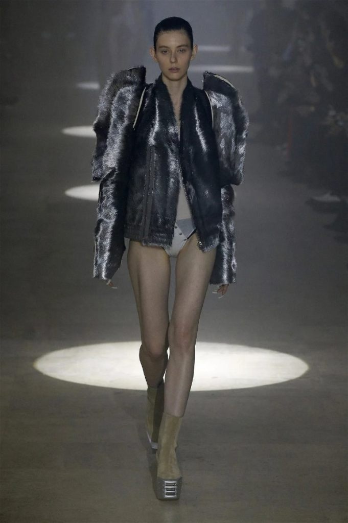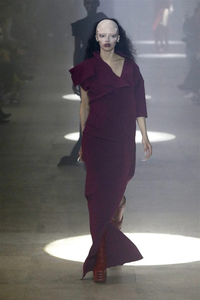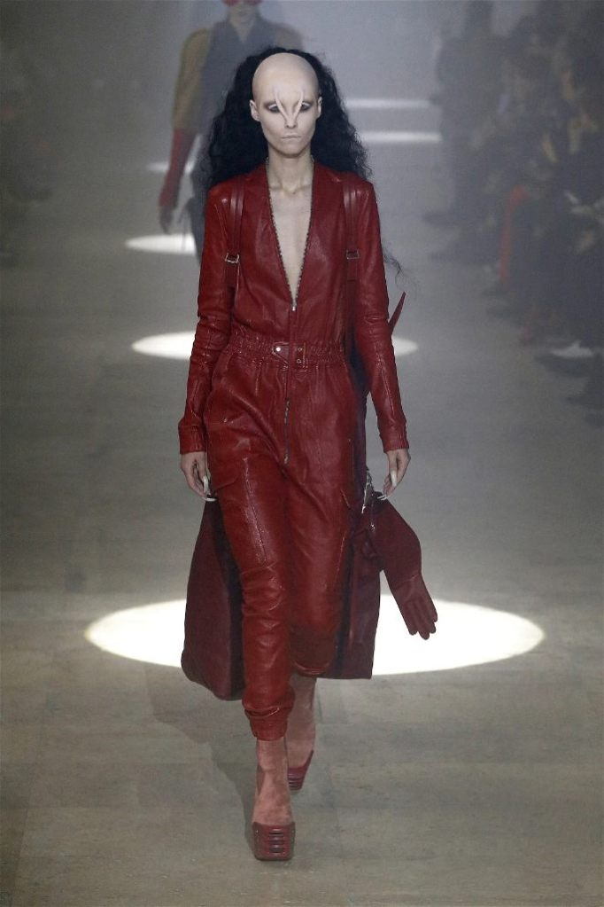 Owens’s tribute wasn’t just about the clothes. Collaborating with Instagram artist Salvia, the show embraced body-mod makeup, adding a futuristic, almost otherworldly edge. Towering platform boots and striking leather bodysuits carried the rock-and-roll spirit forward, while tailored coats and silver-dipped outerwear brought a streetwise sophistication.