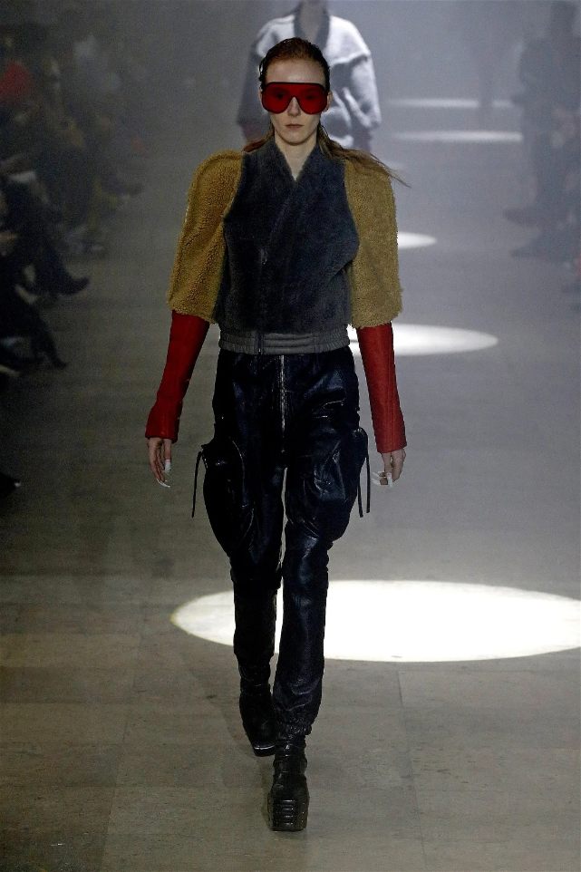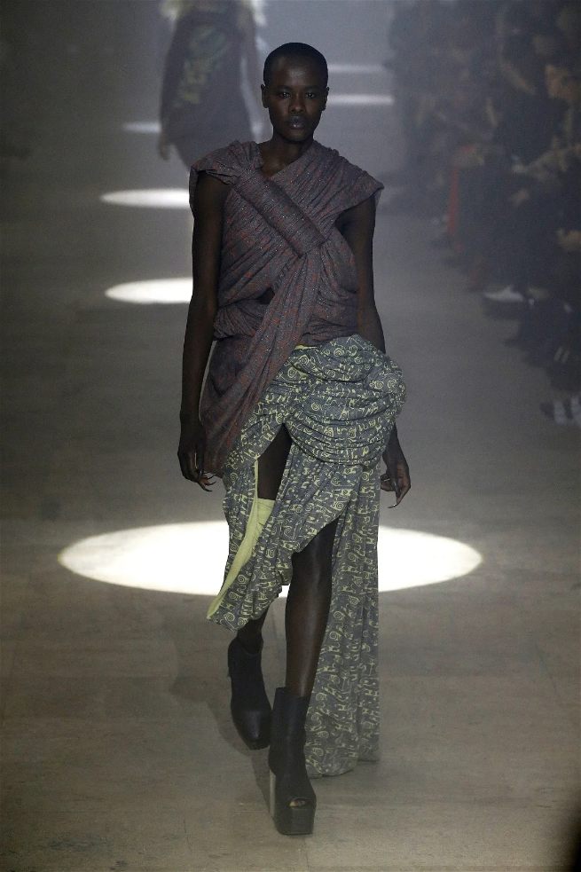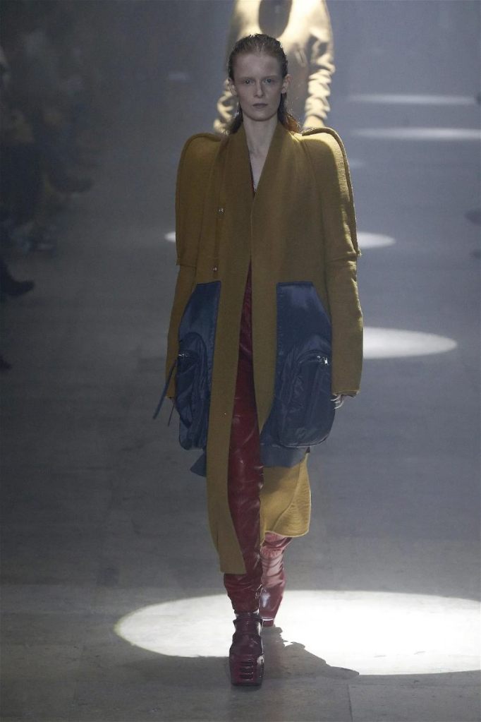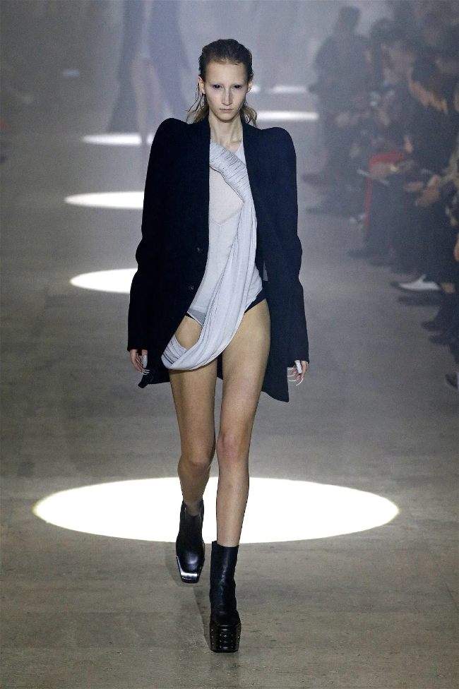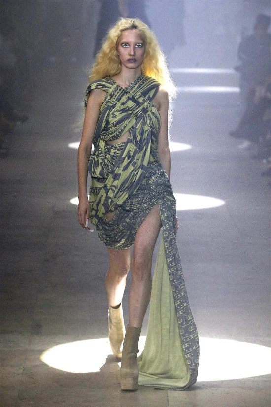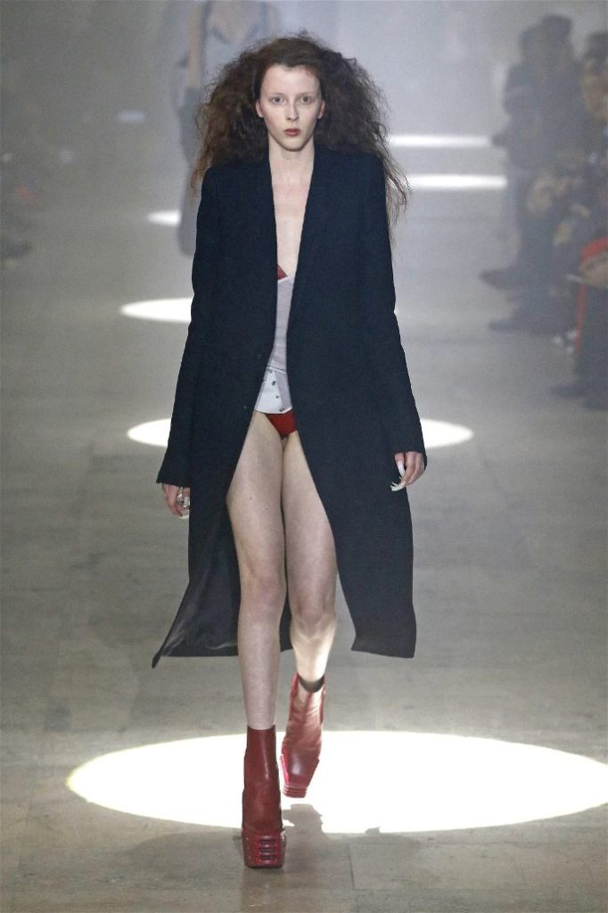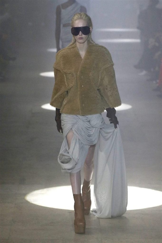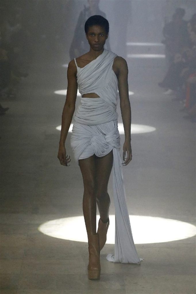 Owens’s tribute wasn’t just about the clothes. Collaborating with Instagram artist Salvia, the show embraced body-mod makeup, adding a futuristic, almost otherworldly edge. Towering platform boots and striking leather bodysuits carried the rock-and-roll spirit forward, while tailored coats and silver-dipped outerwear brought a streetwise sophistication.