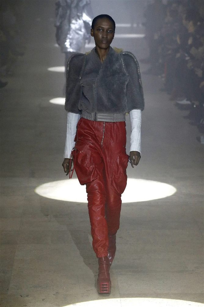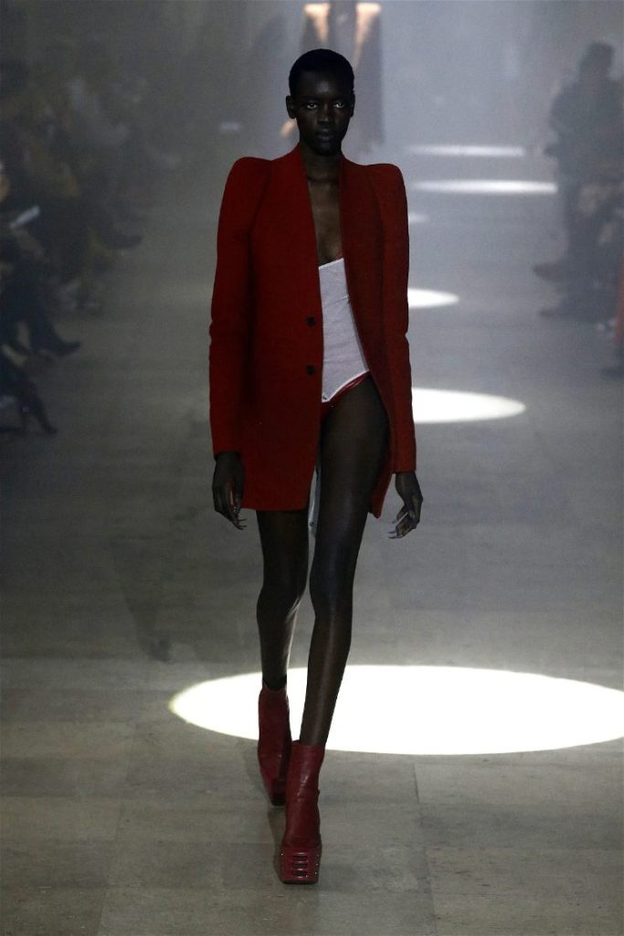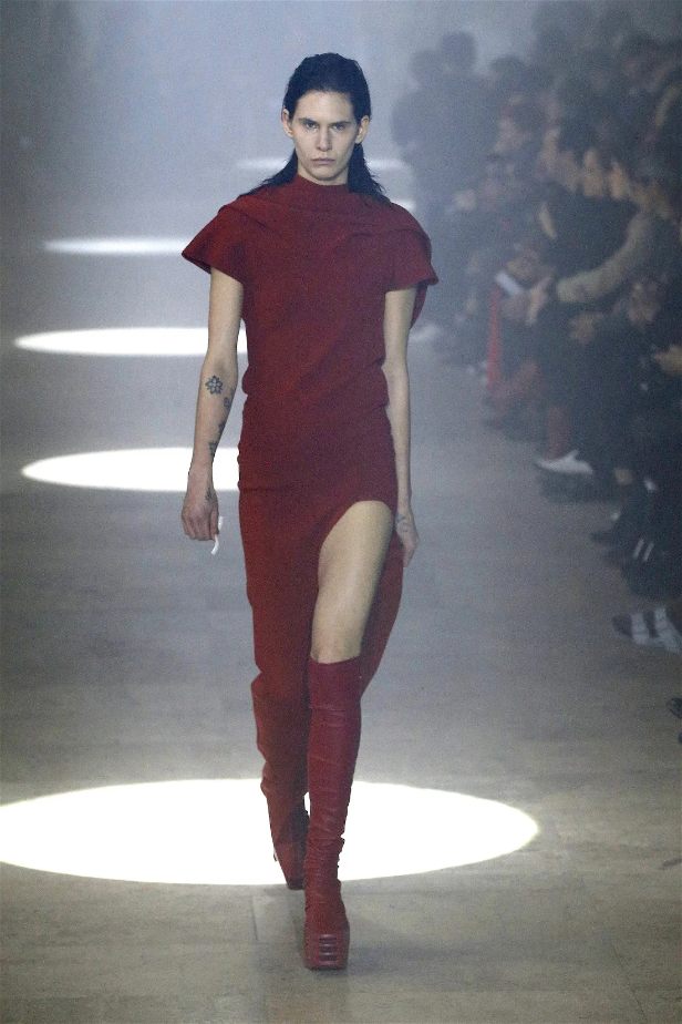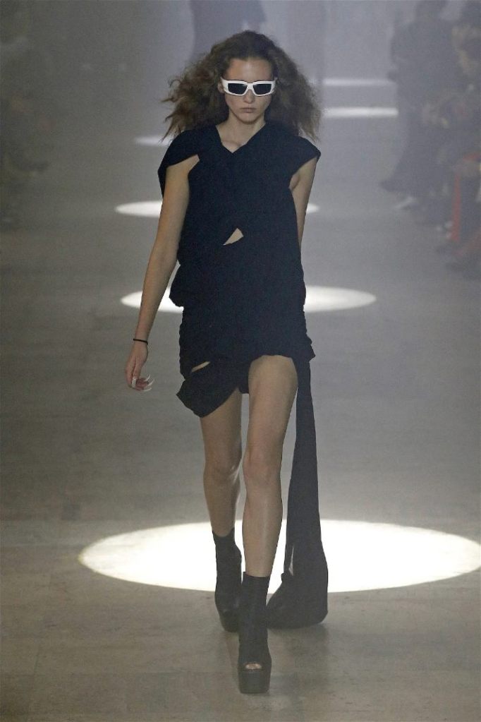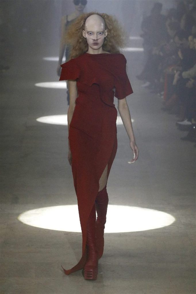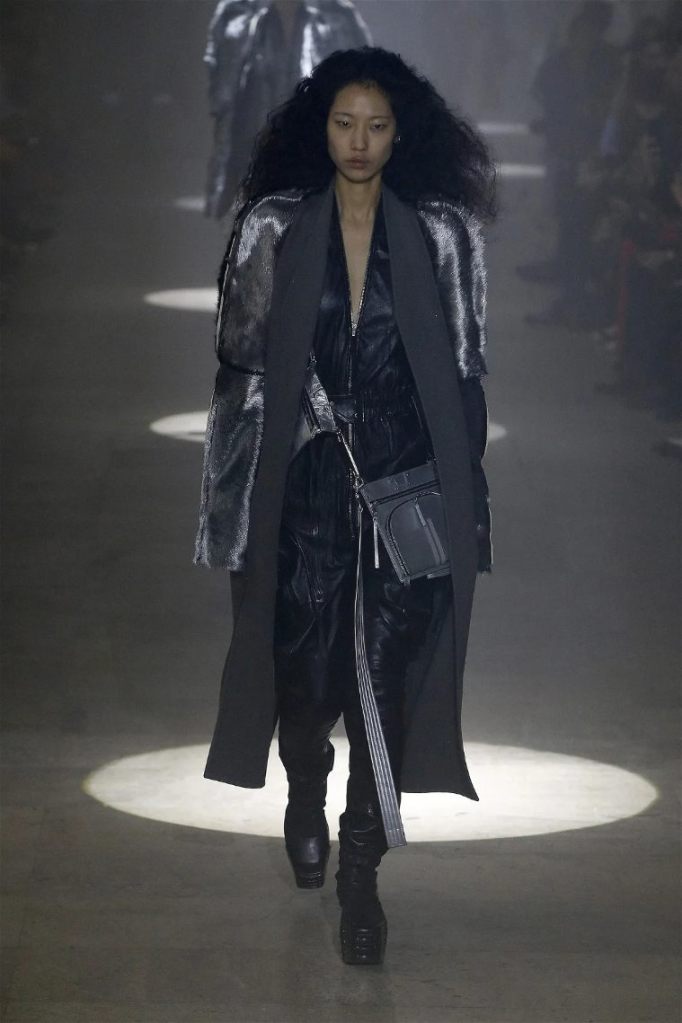 The runway was alive with contrasts—sharp-shouldered coats reminiscent of Kiss’s theatrical style met the sculptural elegance of Charles James, another of Owens’s muses. Jewel-toned gowns draped and twisted around the models, echoing James’s couture craftsmanship while embracing modern, figure-hugging lines. Even accessories nodded to LeGaspi, with lightning bolt charms adorning bold red leather bags.