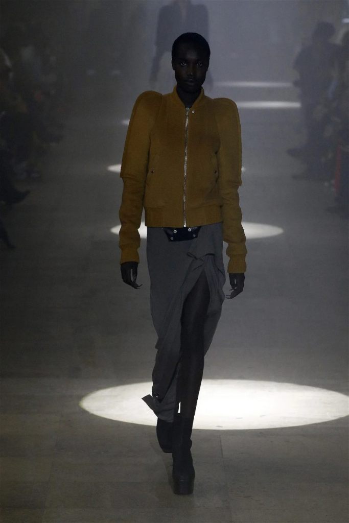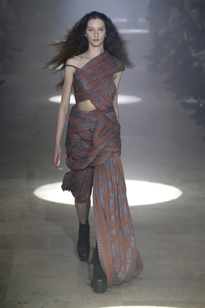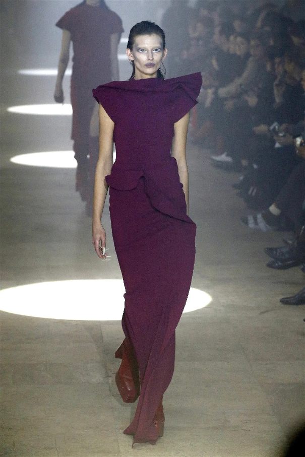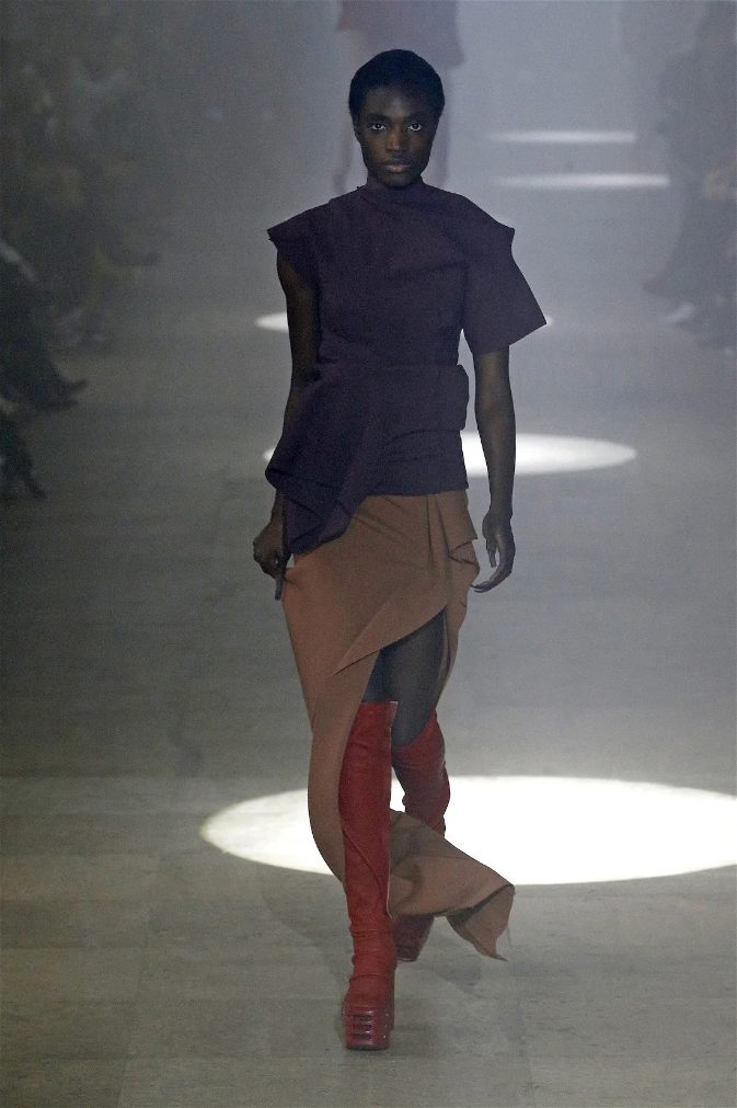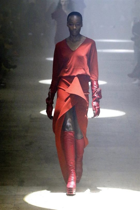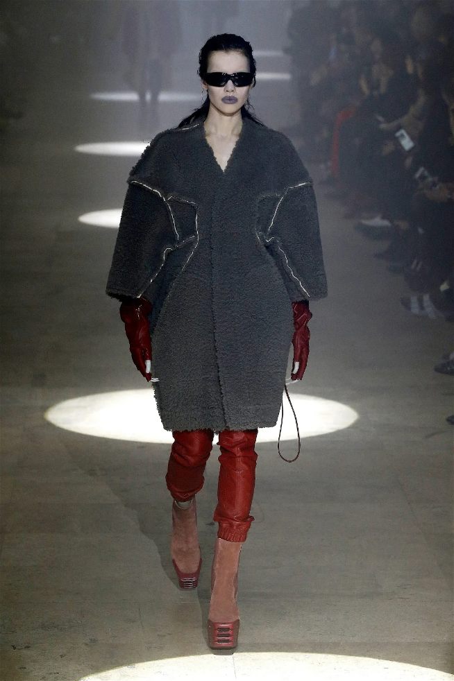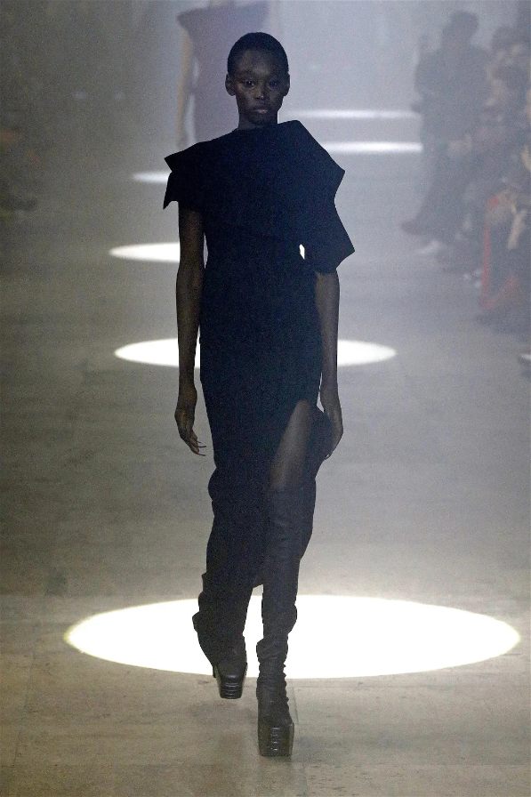 The runway was alive with contrasts—sharp-shouldered coats reminiscent of Kiss’s theatrical style met the sculptural elegance of Charles James, another of Owens’s muses. Jewel-toned gowns draped and twisted around the models, echoing James’s couture craftsmanship while embracing modern, figure-hugging lines. Even accessories nodded to LeGaspi, with lightning bolt charms adorning bold red leather bags.