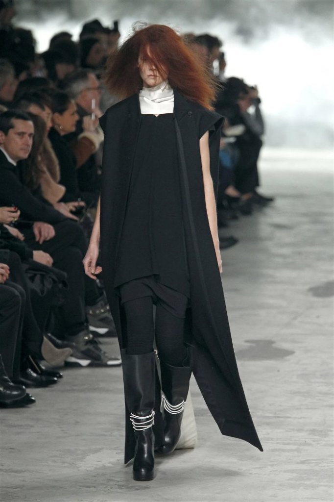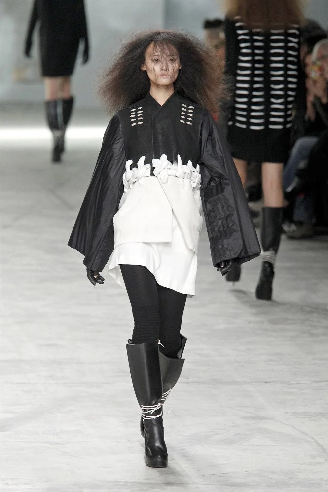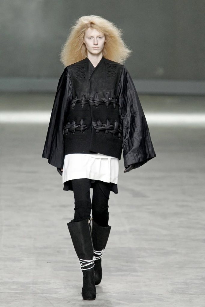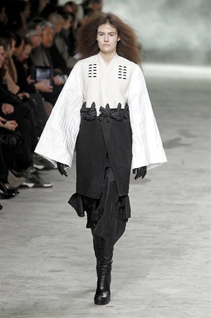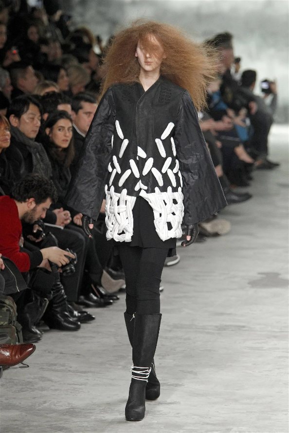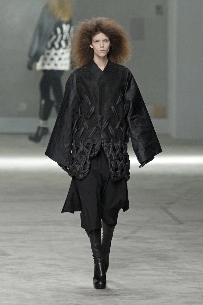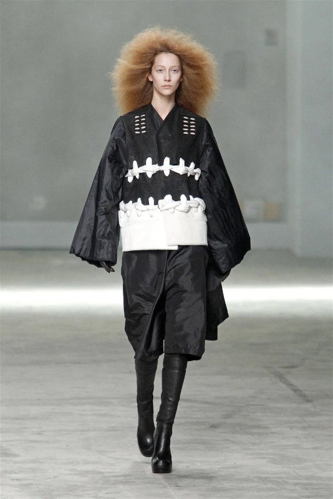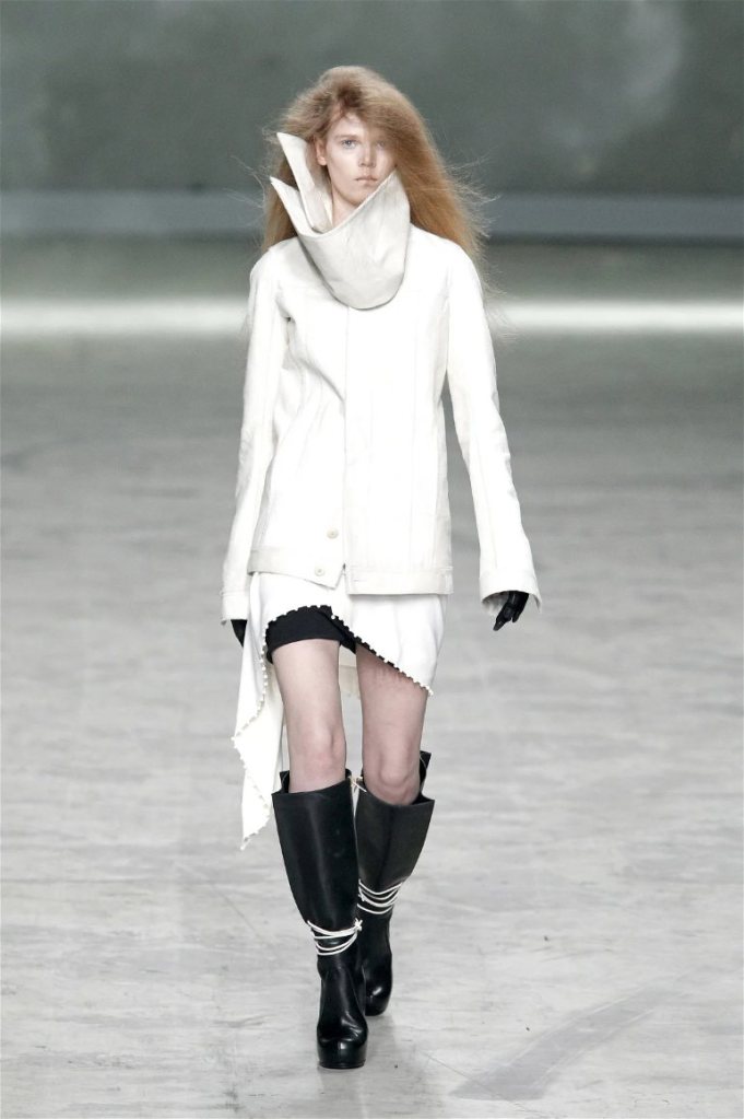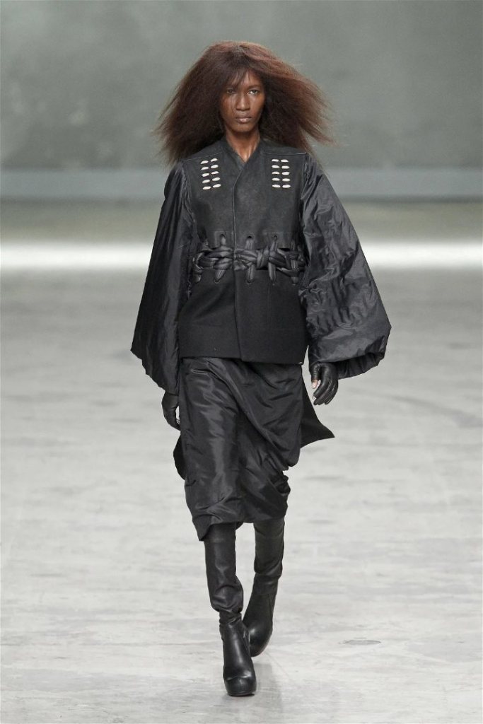 Owens embraced surface decoration in this collection, weaving strings through eyelets, creating intricate designs with rope, and tying black-and-white panels together with prominent knit details. These touches brought an artistic and chic feel to the clothes, making them stand out as more than just fashion—they felt like wearable art. His theme of “battle-scarred heroism” echoed throughout the show, as models wore the big coats, boots, and T-shirts Owens is known for, but with a fresh twist.