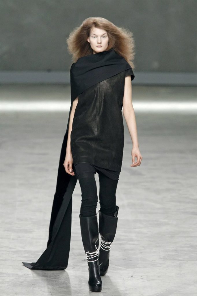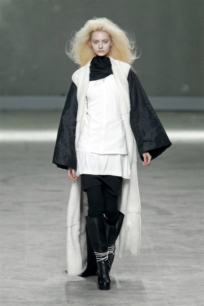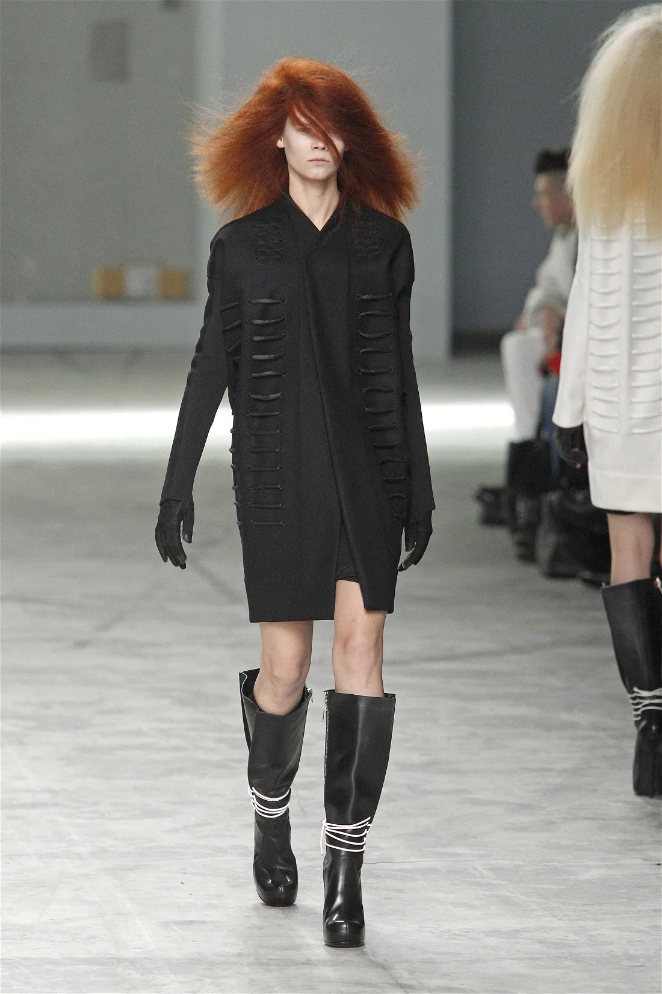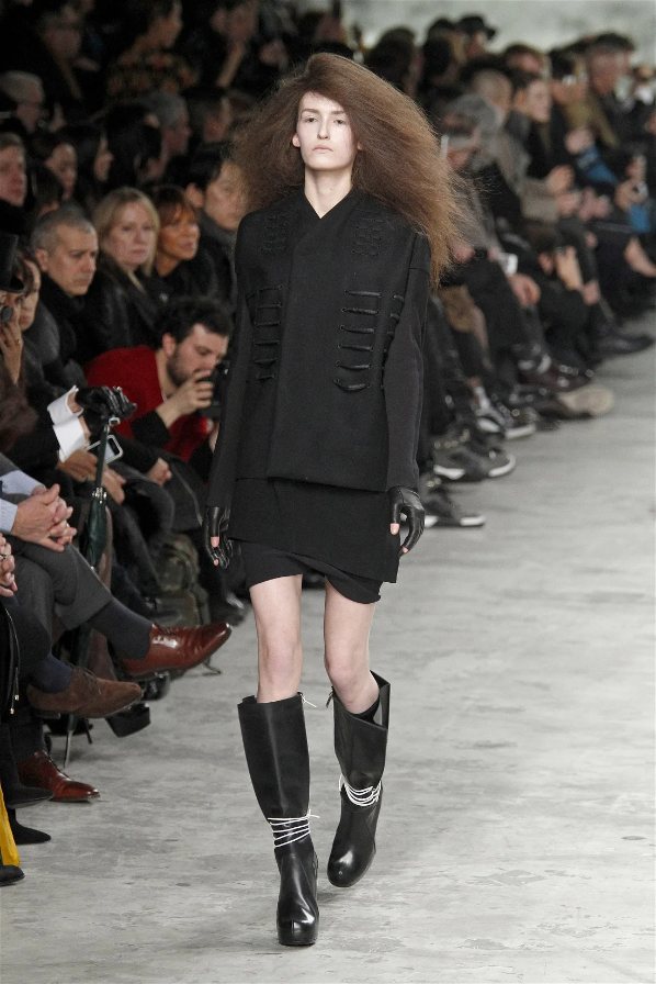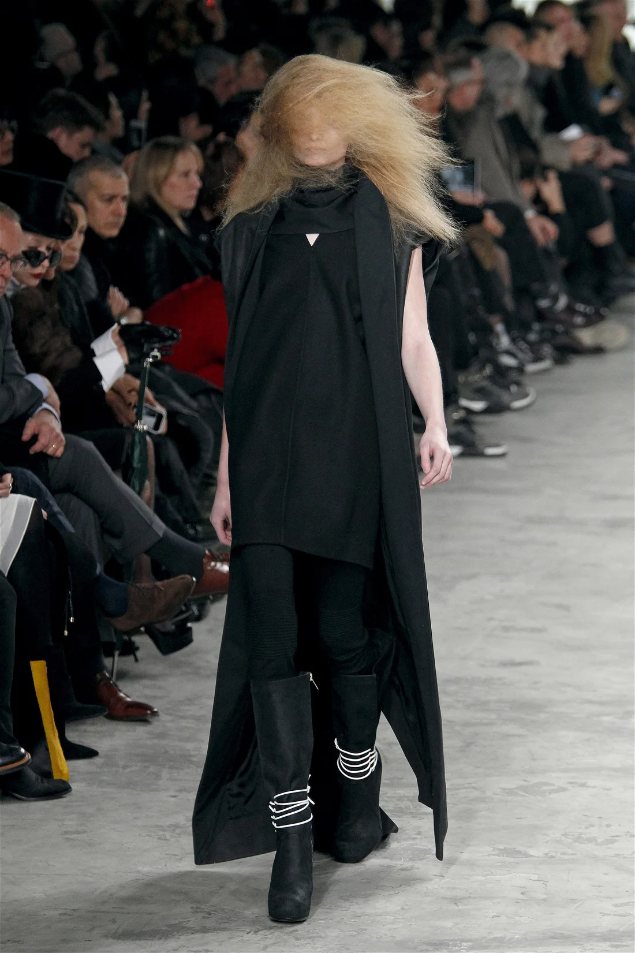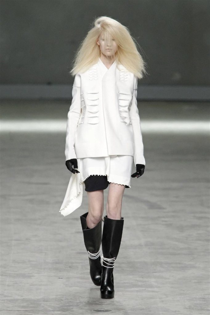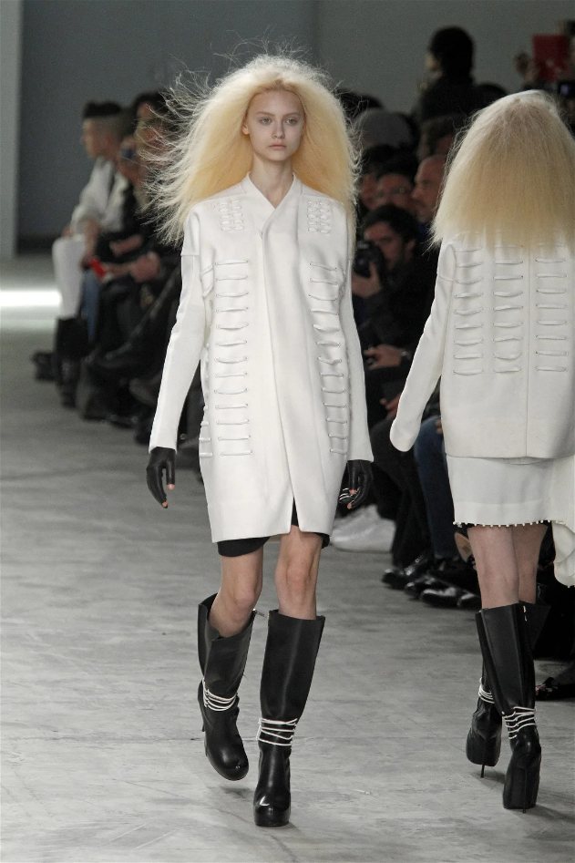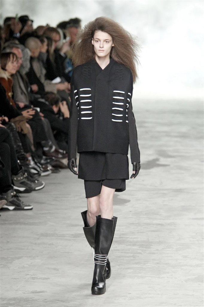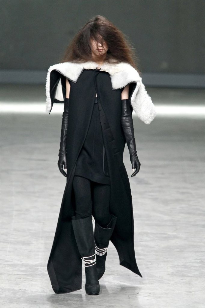 Owens embraced surface decoration in this collection, weaving strings through eyelets, creating intricate designs with rope, and tying black-and-white panels together with prominent knit details. These touches brought an artistic and chic feel to the clothes, making them stand out as more than just fashion—they felt like wearable art. His theme of “battle-scarred heroism” echoed throughout the show, as models wore the big coats, boots, and T-shirts Owens is known for, but with a fresh twist.