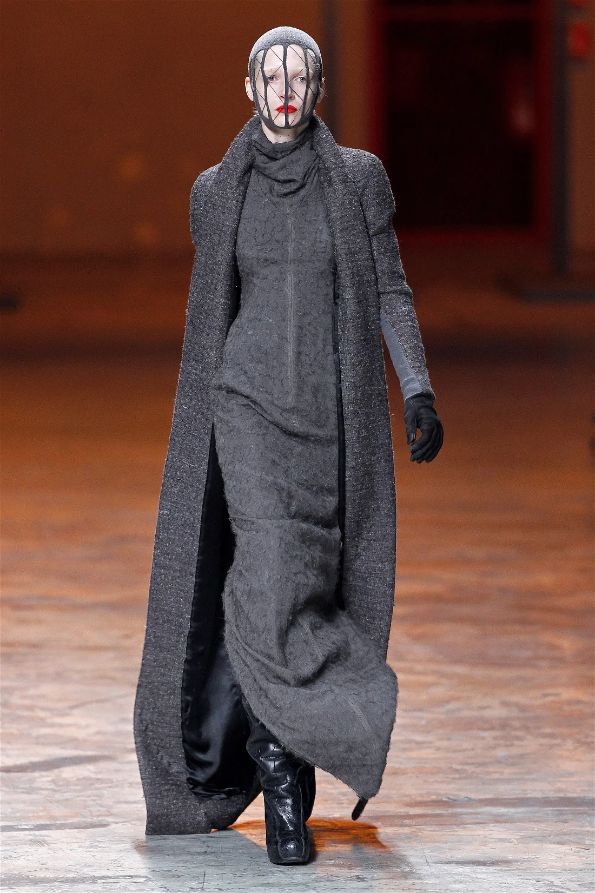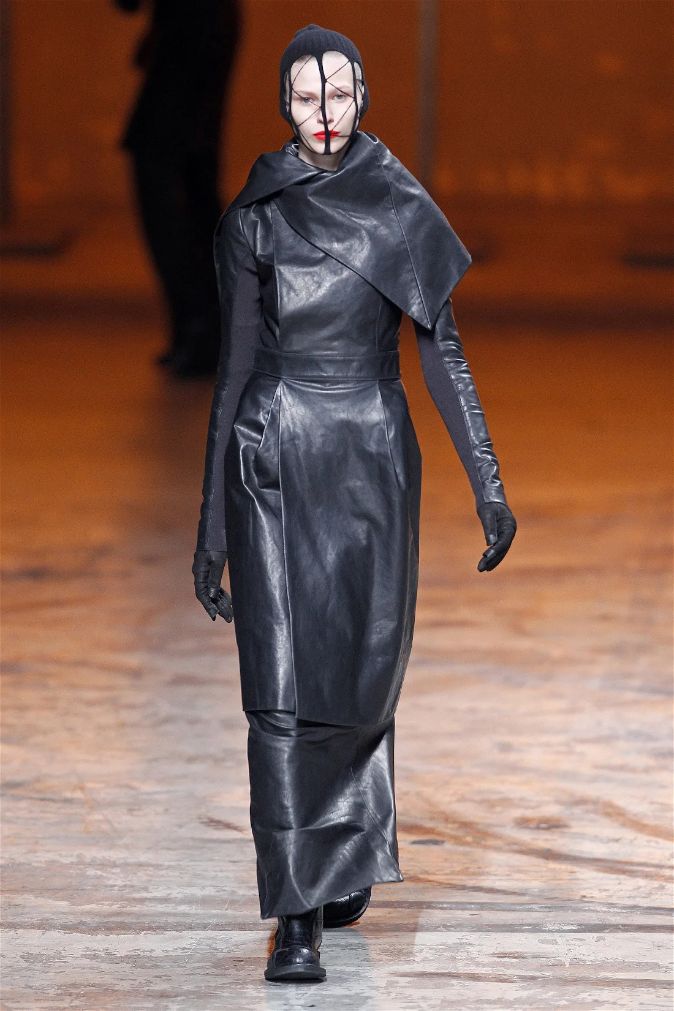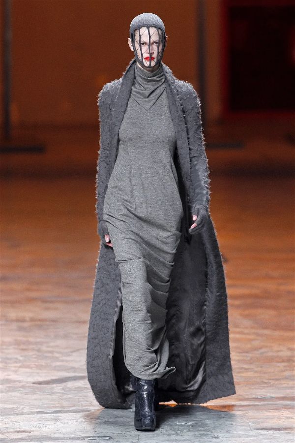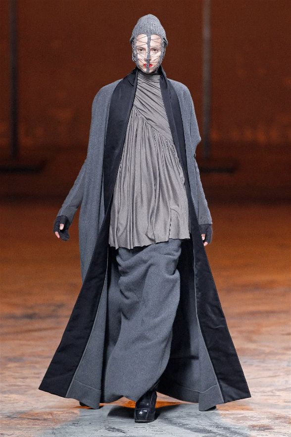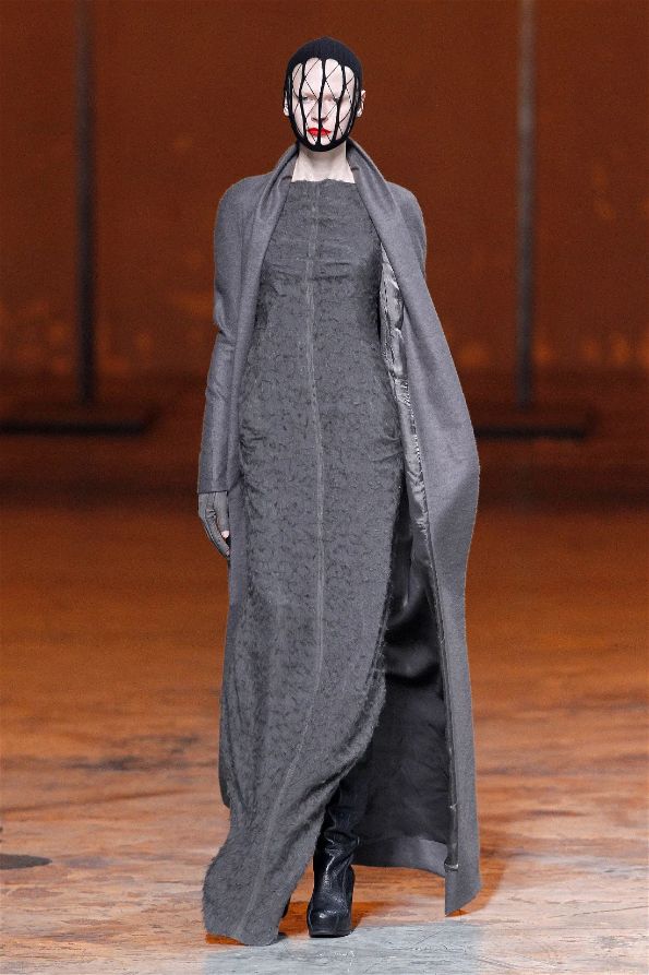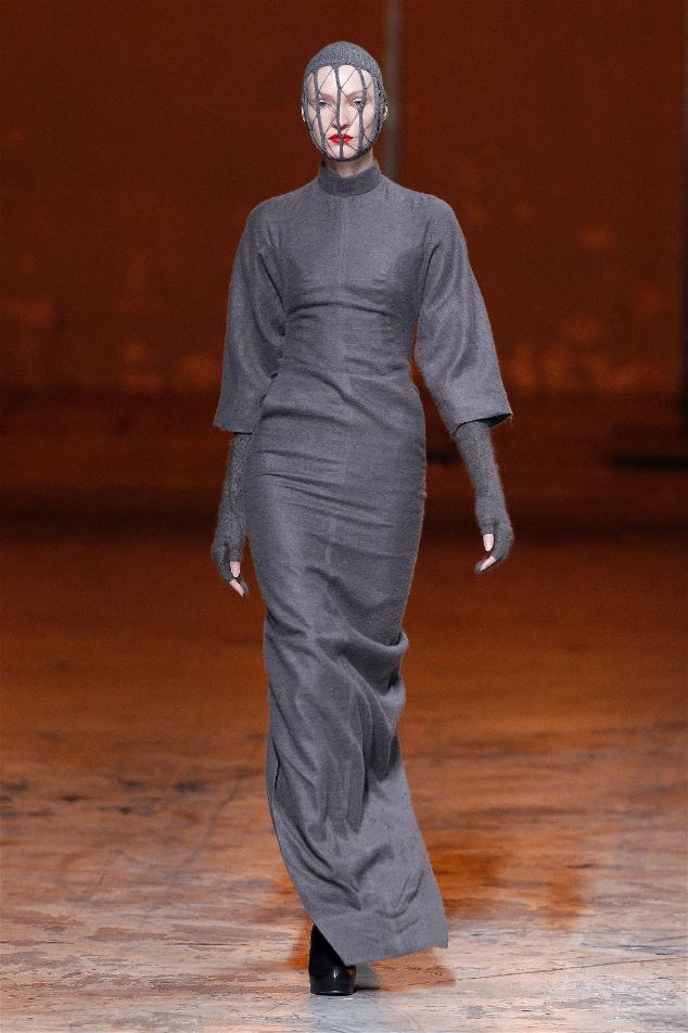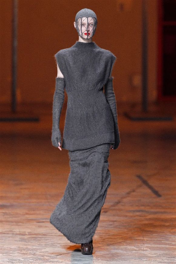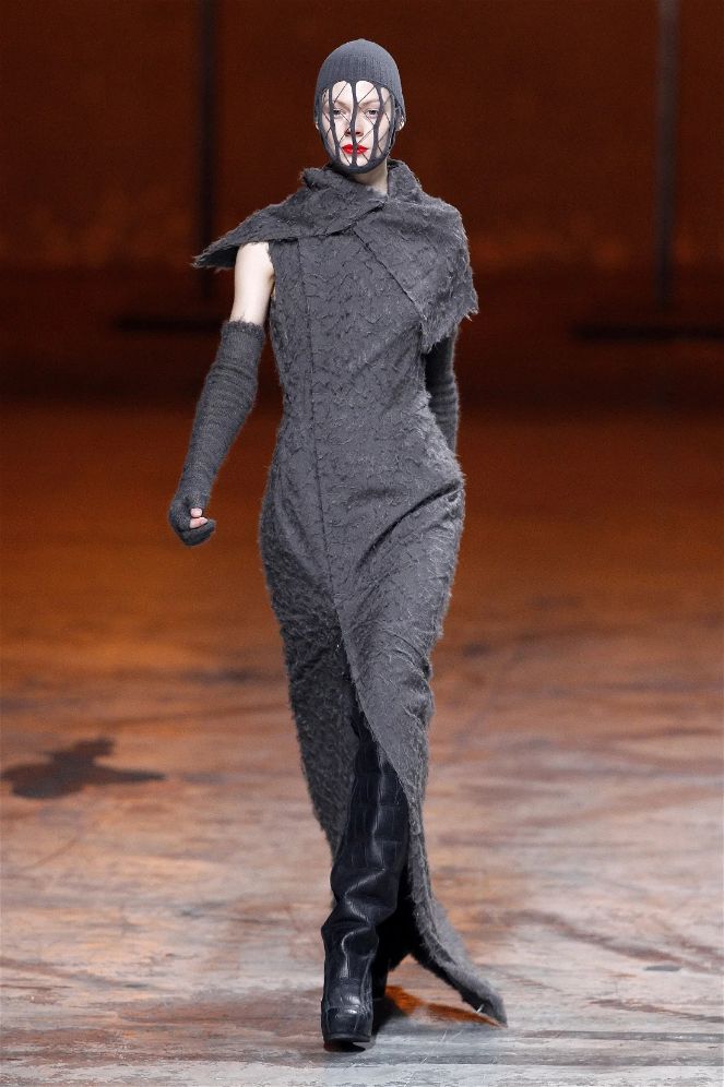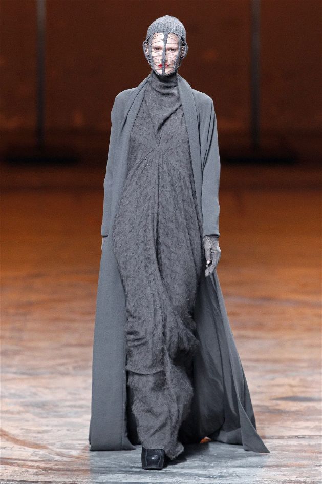 The atmosphere was intense, with models wearing caged ski masks that gave a sense of mystery and high concept. These masks were described as “brutalist veils,” yet they were softened by the classically beautiful makeup—pale skin and bold red lips—adding a touch of elegance. The collection itself, though, defied expectations. Despite the brutalist influences Owens mentioned, like the fire backdrop and the intense soundtrack, the clothes were unexpectedly lyrical. There was a sense of quiet beauty, with flowing dresses in soft fabrics like pilled chiffon, reminding some of Marlene Dietrich’s iconic gowns.