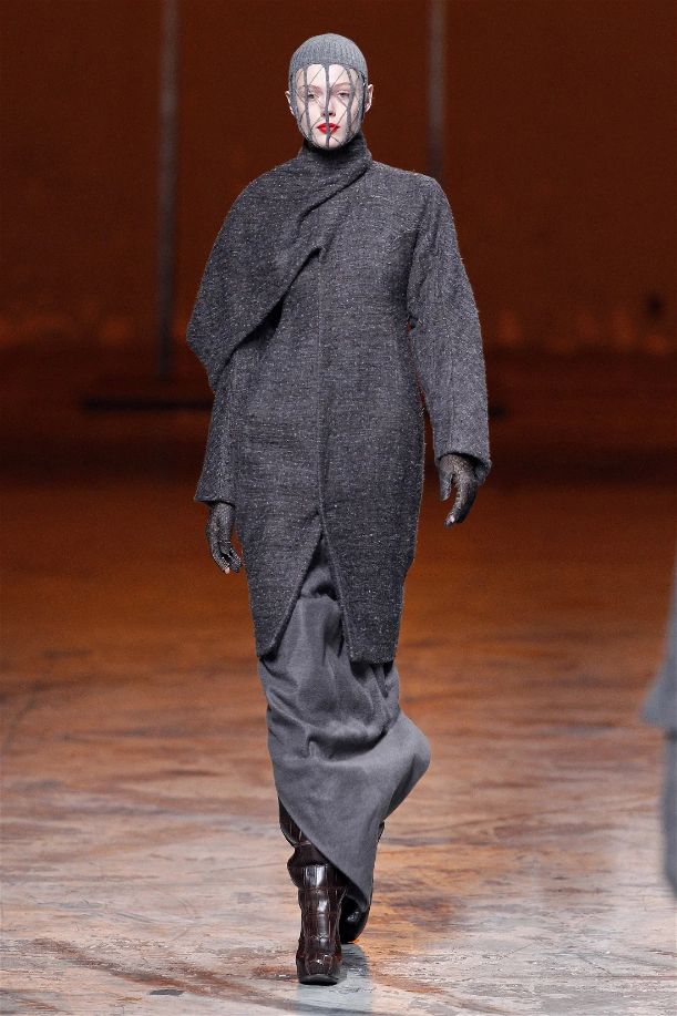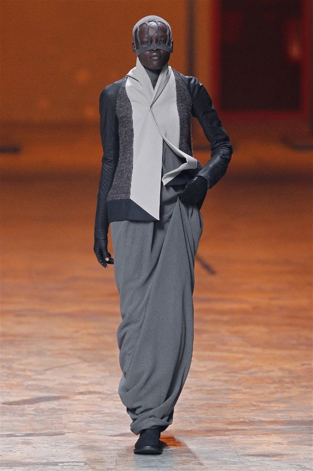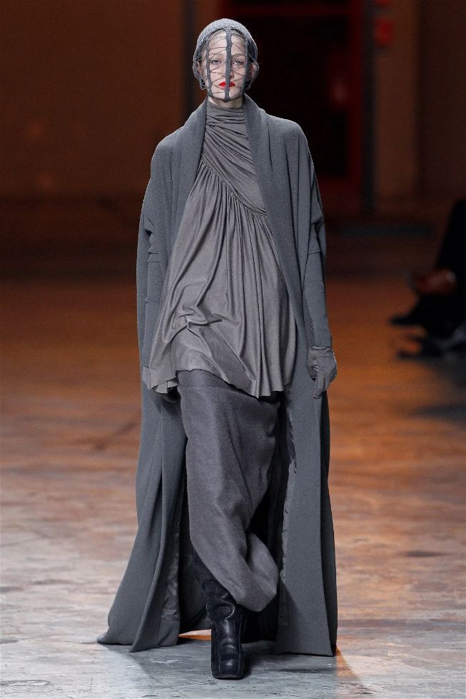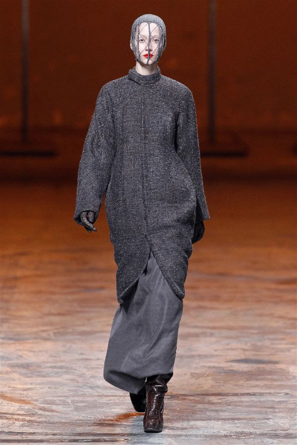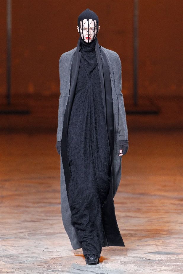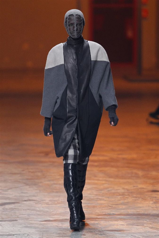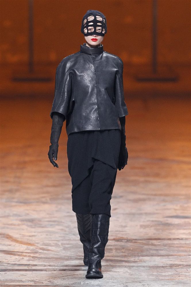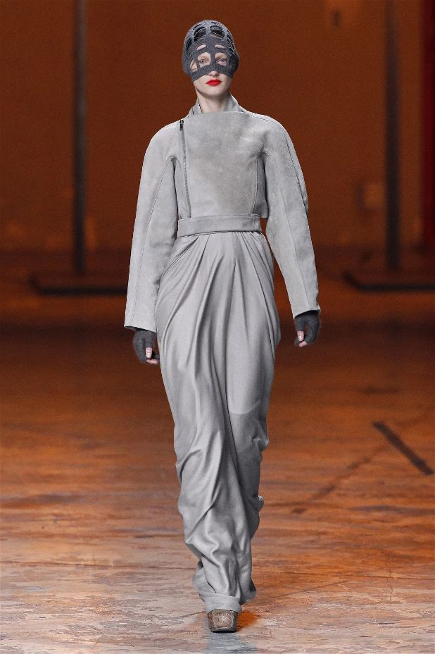 The atmosphere was intense, with models wearing caged ski masks that gave a sense of mystery and high concept. These masks were described as “brutalist veils,” yet they were softened by the classically beautiful makeup—pale skin and bold red lips—adding a touch of elegance. The collection itself, though, defied expectations. Despite the brutalist influences Owens mentioned, like the fire backdrop and the intense soundtrack, the clothes were unexpectedly lyrical. There was a sense of quiet beauty, with flowing dresses in soft fabrics like pilled chiffon, reminding some of Marlene Dietrich’s iconic gowns.