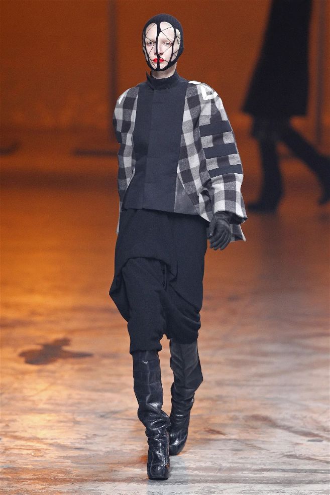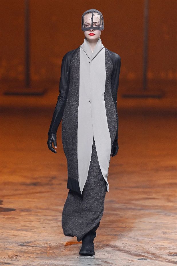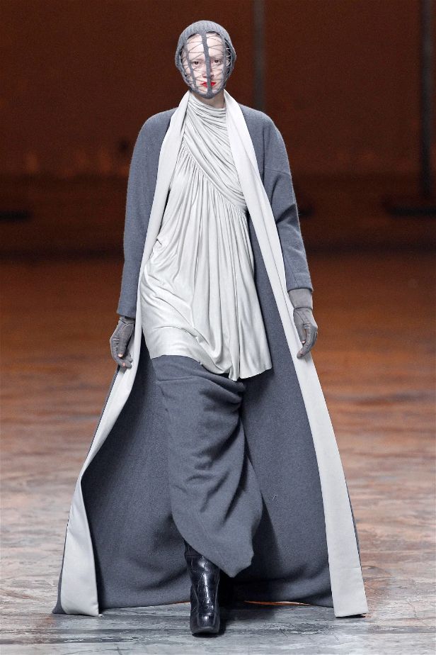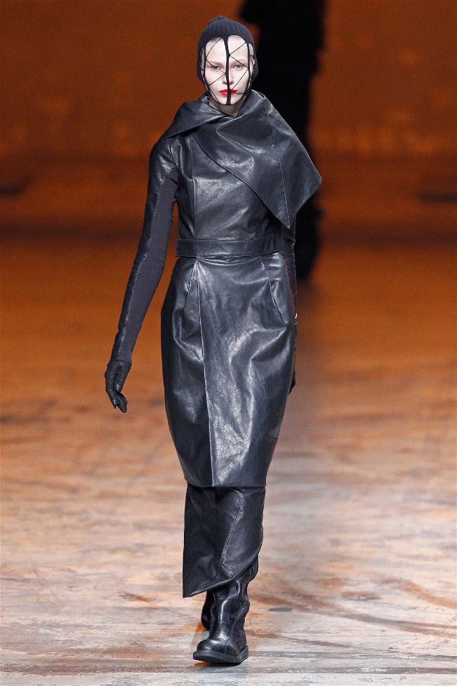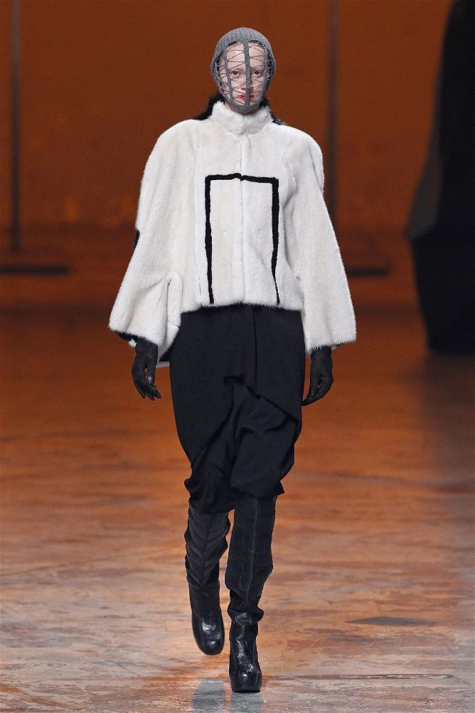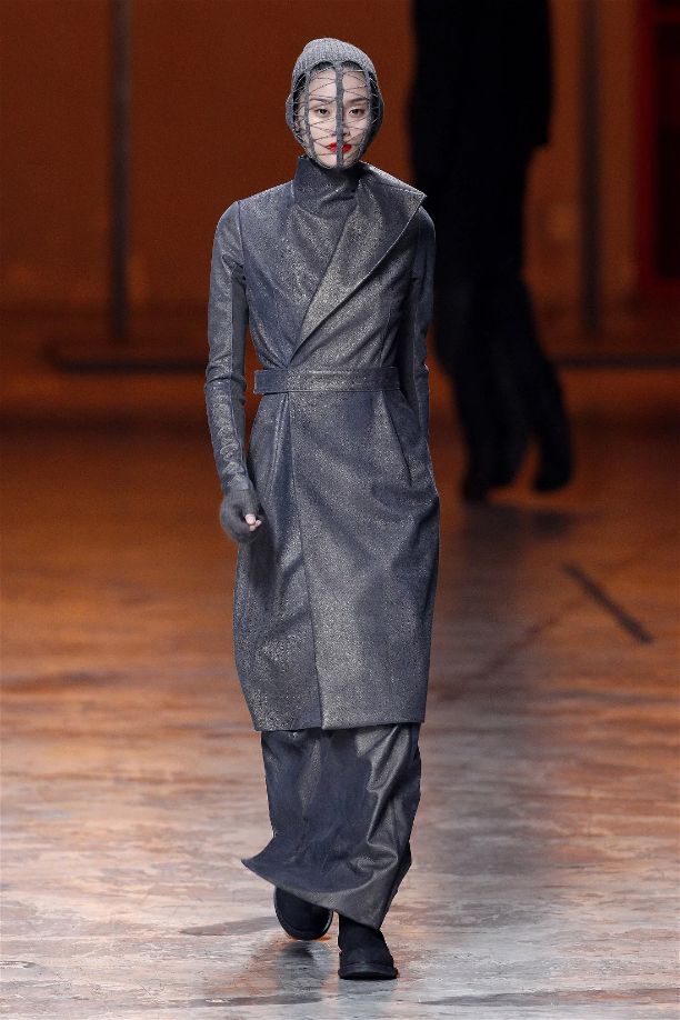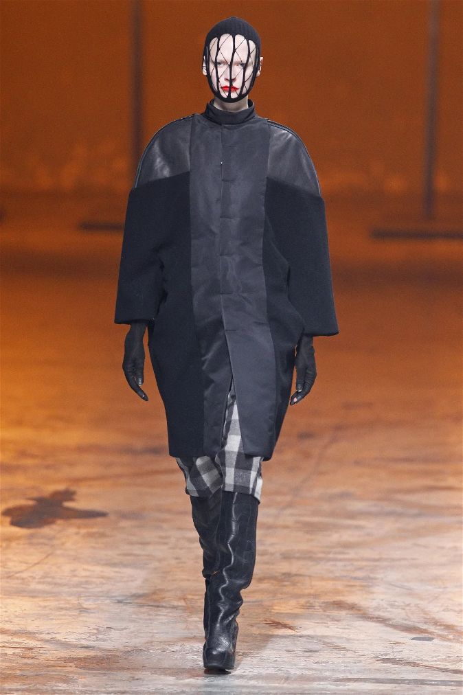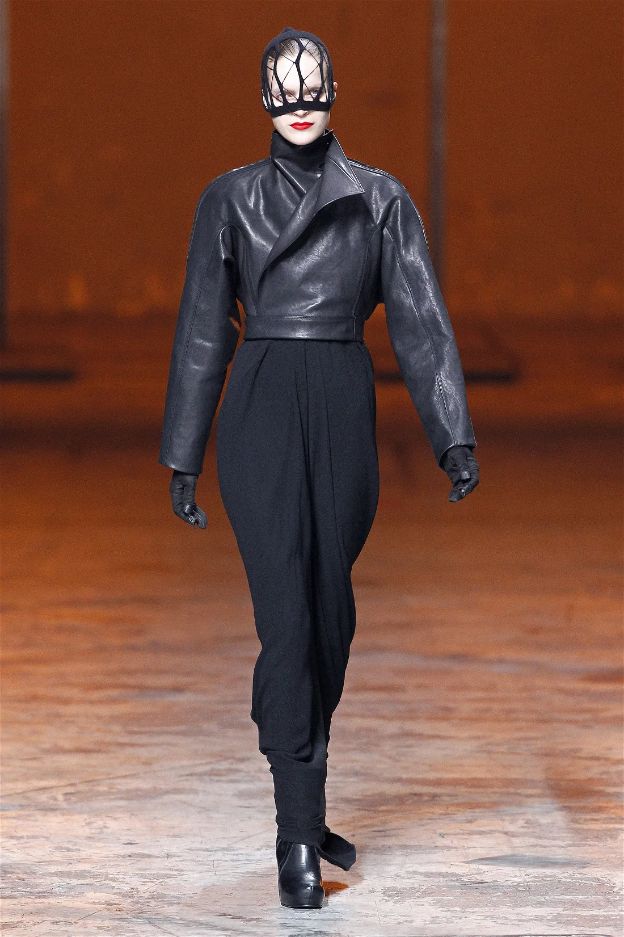 The atmosphere was intense, with models wearing caged ski masks that gave a sense of mystery and high concept. These masks were described as “brutalist veils,” yet they were softened by the classically beautiful makeup—pale skin and bold red lips—adding a touch of elegance. The collection itself, though, defied expectations. Despite the brutalist influences Owens mentioned, like the fire backdrop and the intense soundtrack, the clothes were unexpectedly lyrical. There was a sense of quiet beauty, with flowing dresses in soft fabrics like pilled chiffon, reminding some of Marlene Dietrich’s iconic gowns.