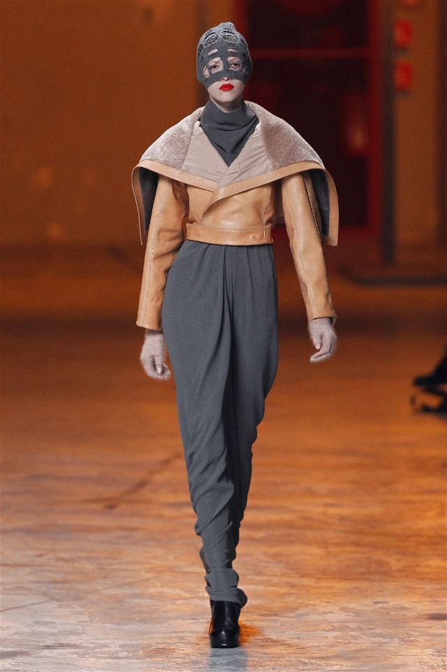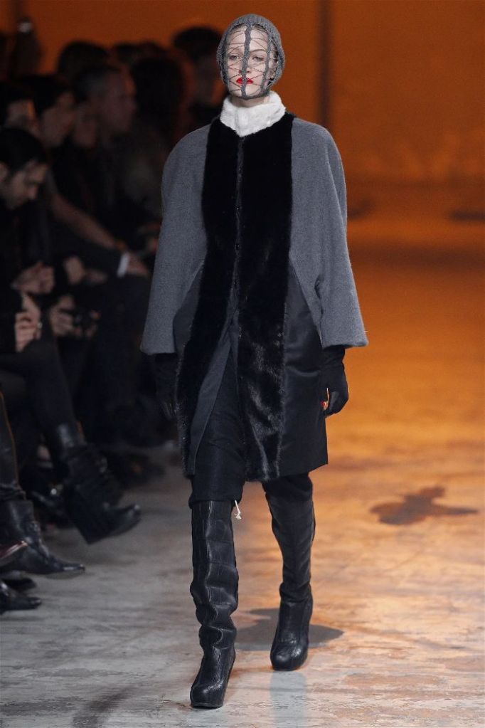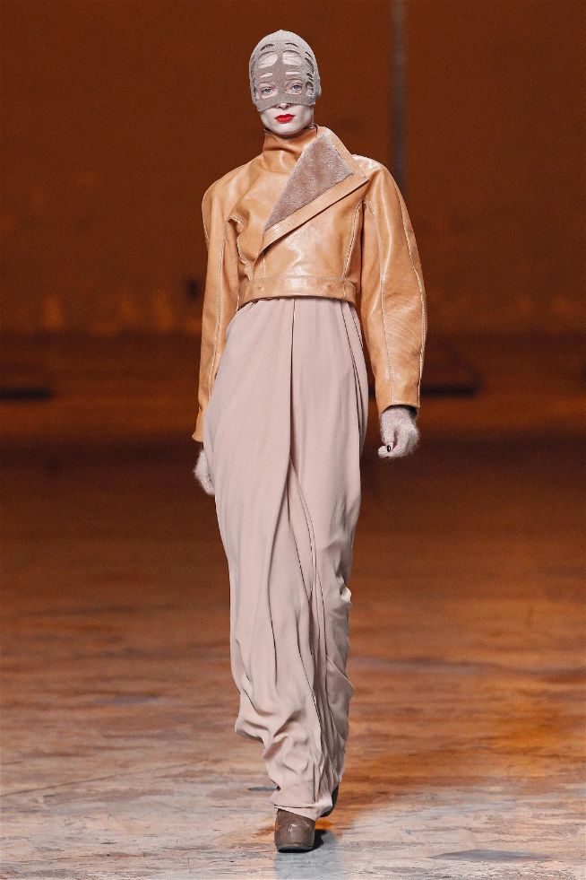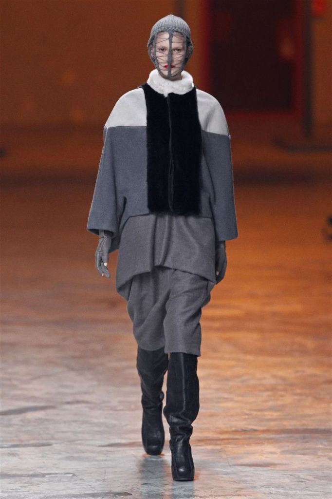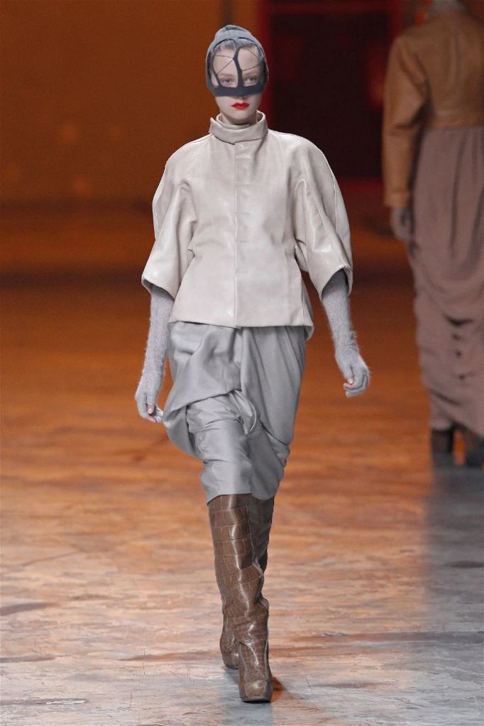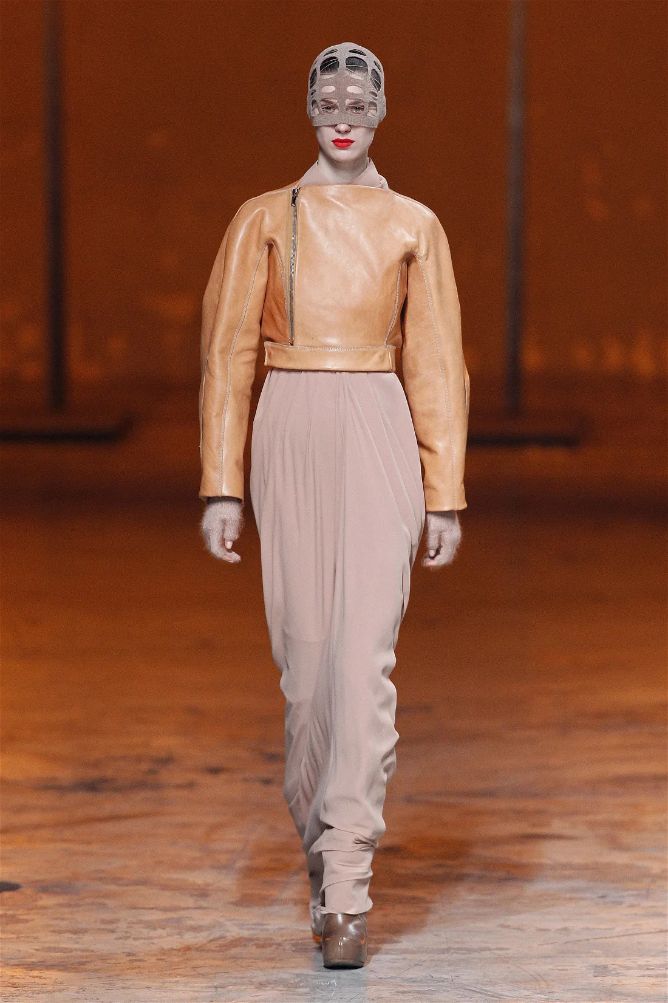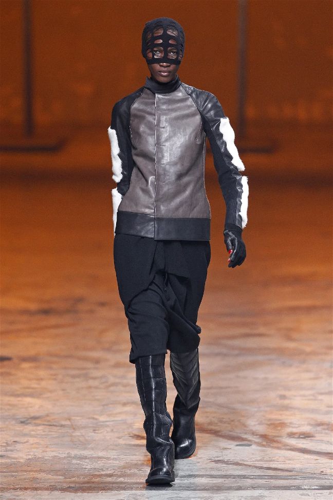 Owens embraced softer shapes, creating relaxed silhouettes in gray and tan hues, with elements like drop-crotch shorts that somehow felt both cool and refined. The outerwear was especially striking—fitted coats and cropped leather jackets paired with dramatic shearling collars added depth to the collection.