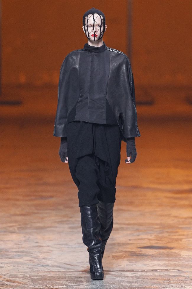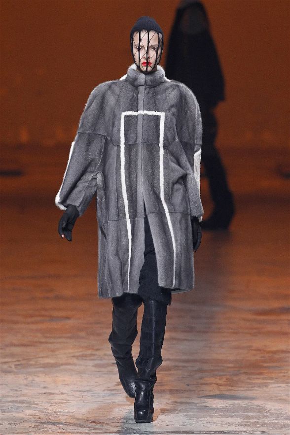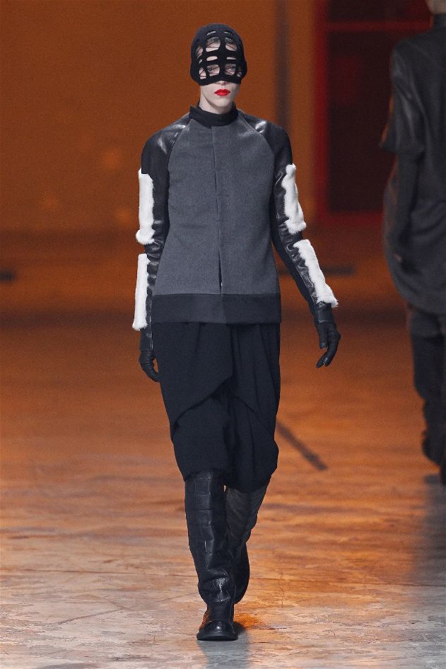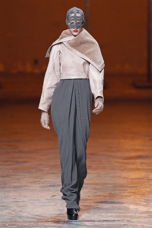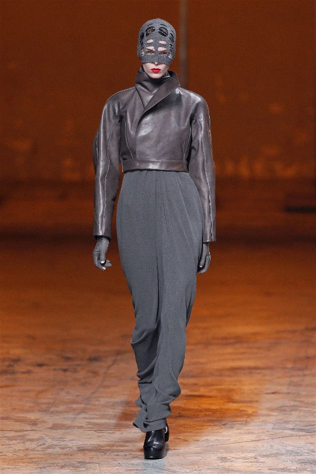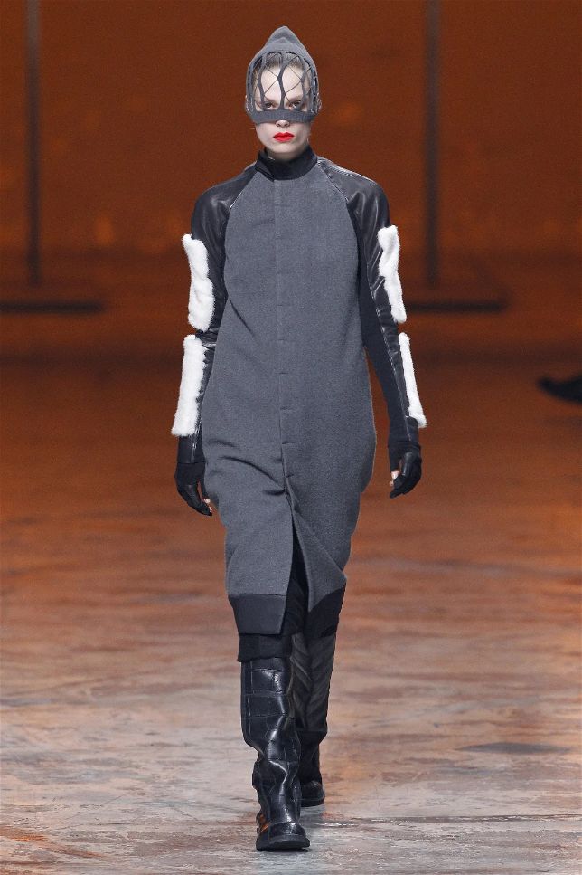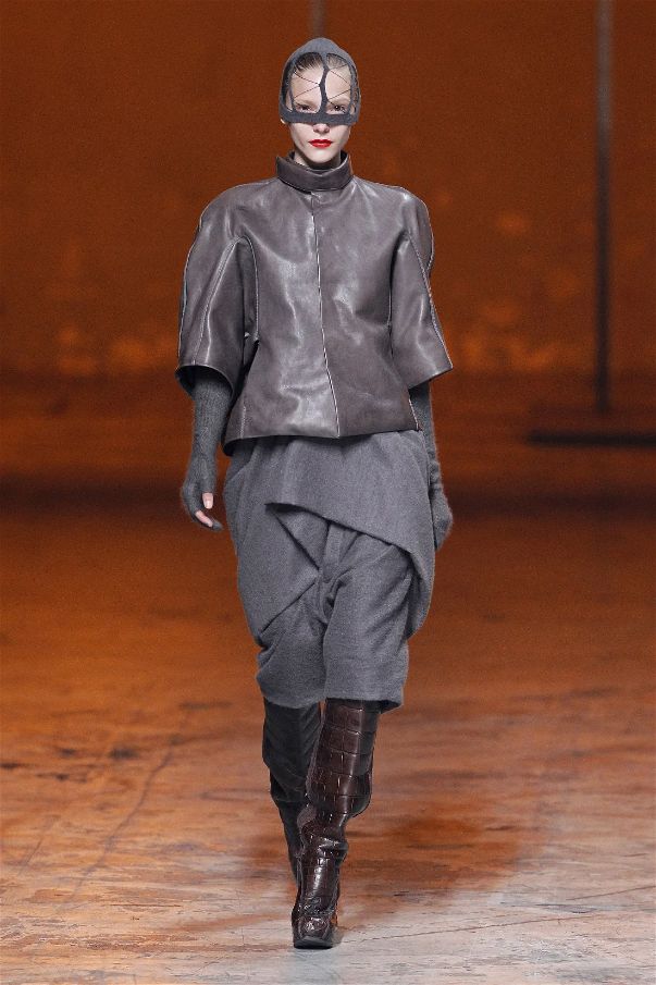 Owens embraced softer shapes, creating relaxed silhouettes in gray and tan hues, with elements like drop-crotch shorts that somehow felt both cool and refined. The outerwear was especially striking—fitted coats and cropped leather jackets paired with dramatic shearling collars added depth to the collection.