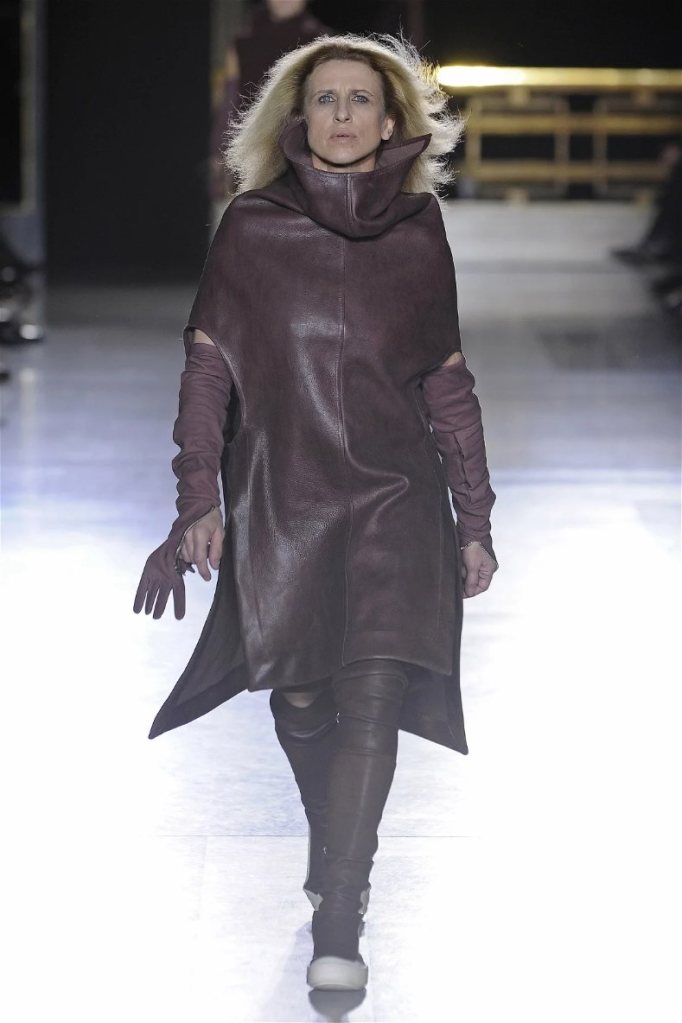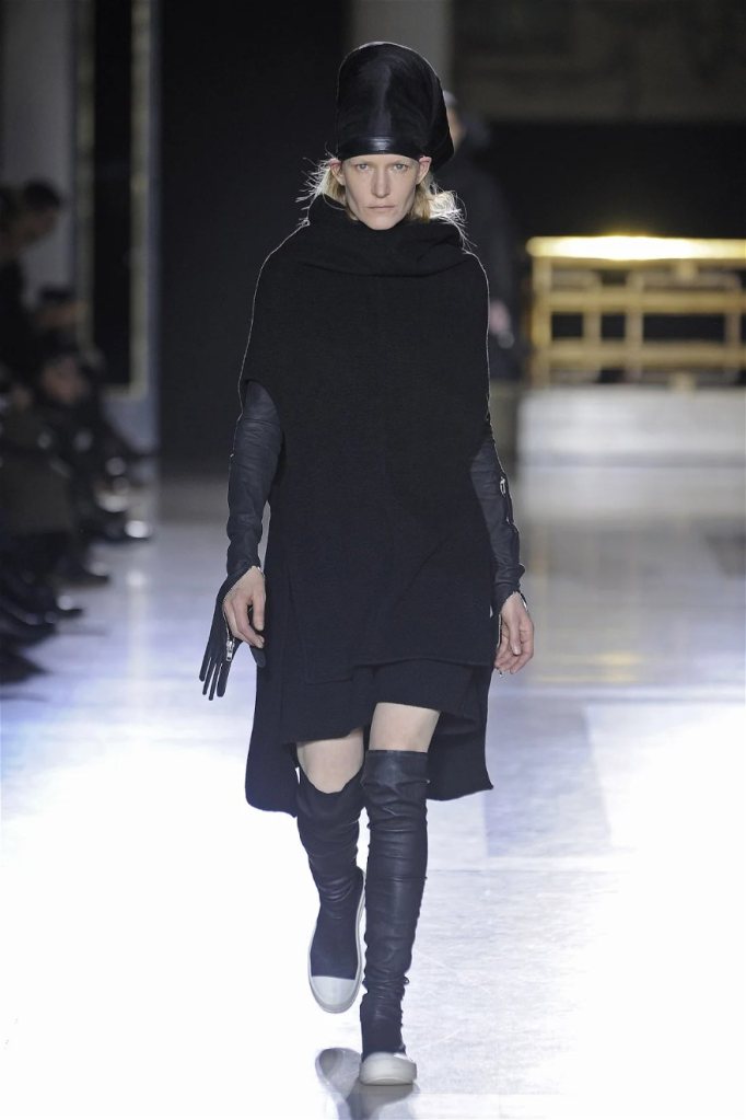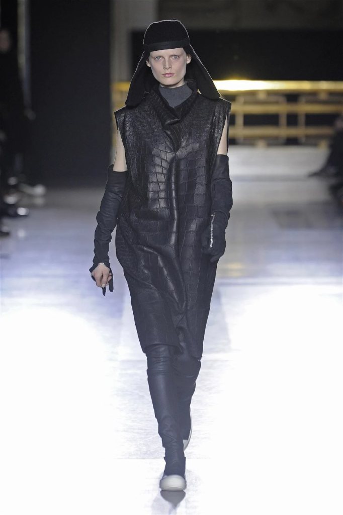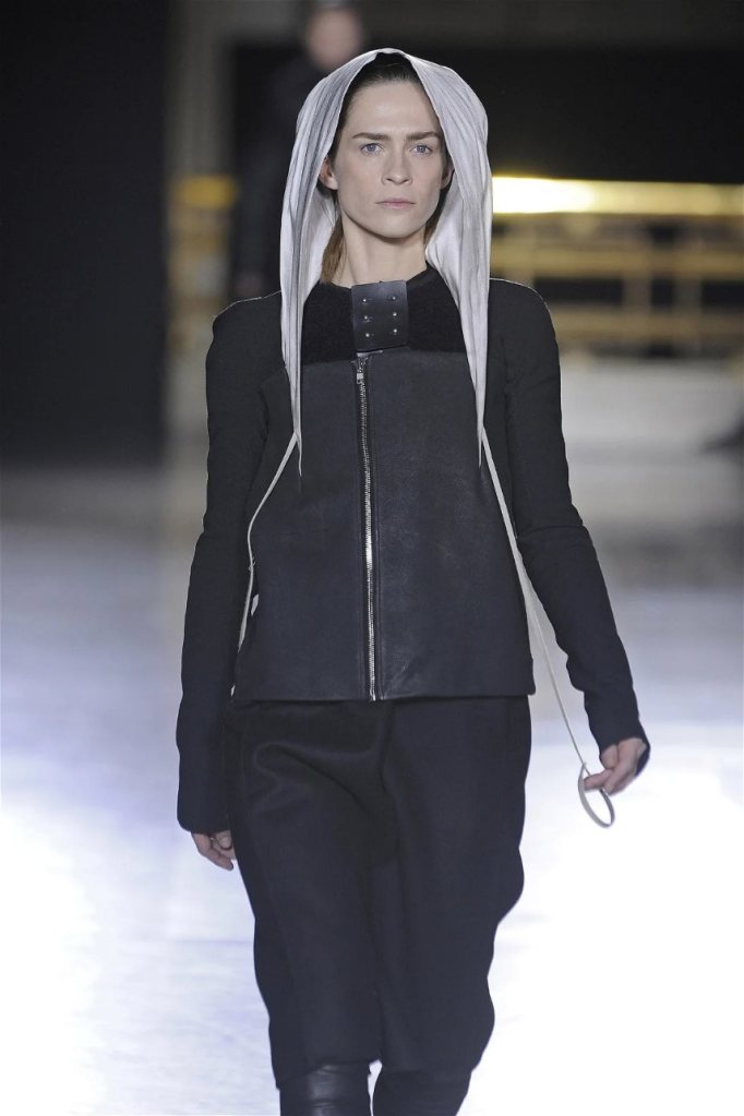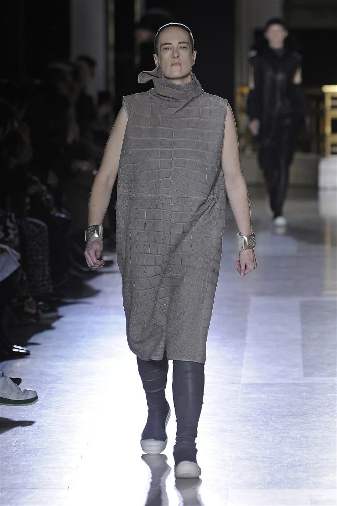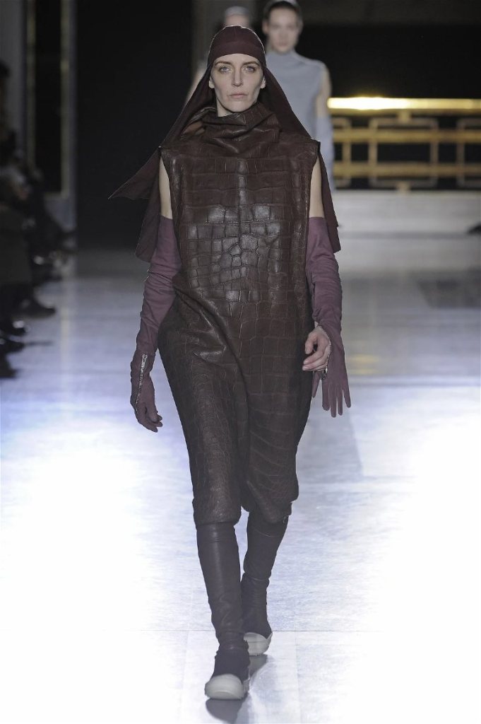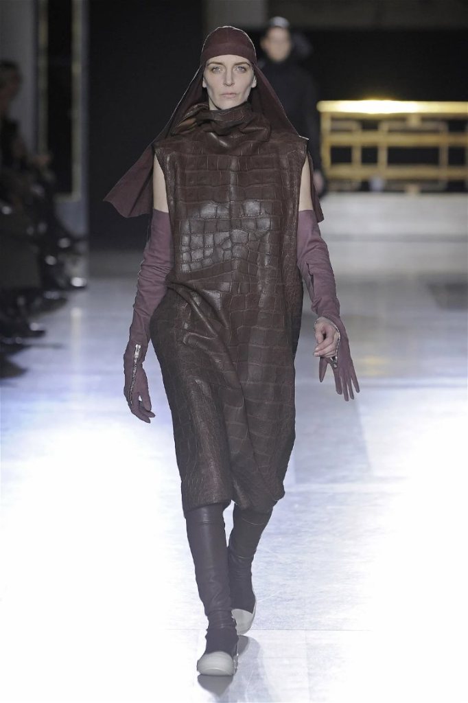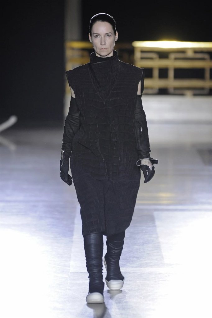 The clothes themselves embraced comfort and warmth—think cocooning capes, soft fabrics, and plush onesies. While Owens’ past shows have been known for their edginess, this collection offered something gentler, with a focus on love, protection, and communication. There was still an element of the warrior in the looks, with bold pieces like croc-printed shifts and motocross leather pants, but they were balanced by an overarching theme of family and unity. This collection is a testament to Owens’ ability to blend darkness with beauty,