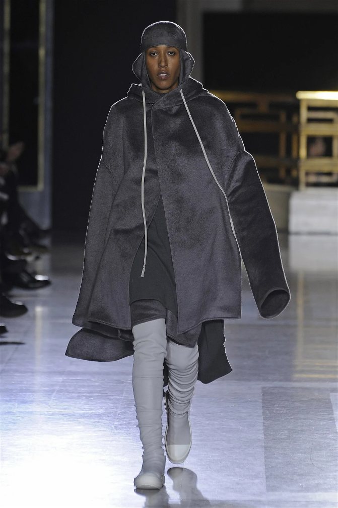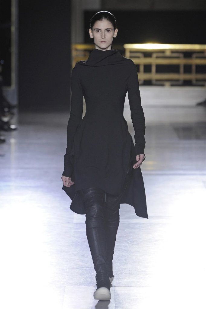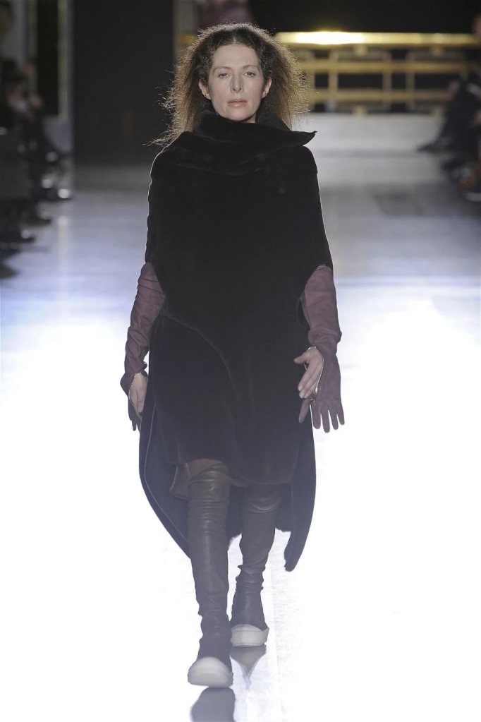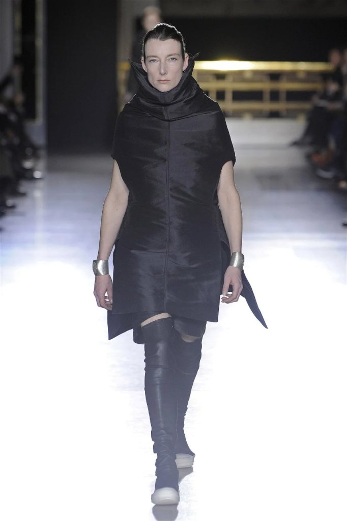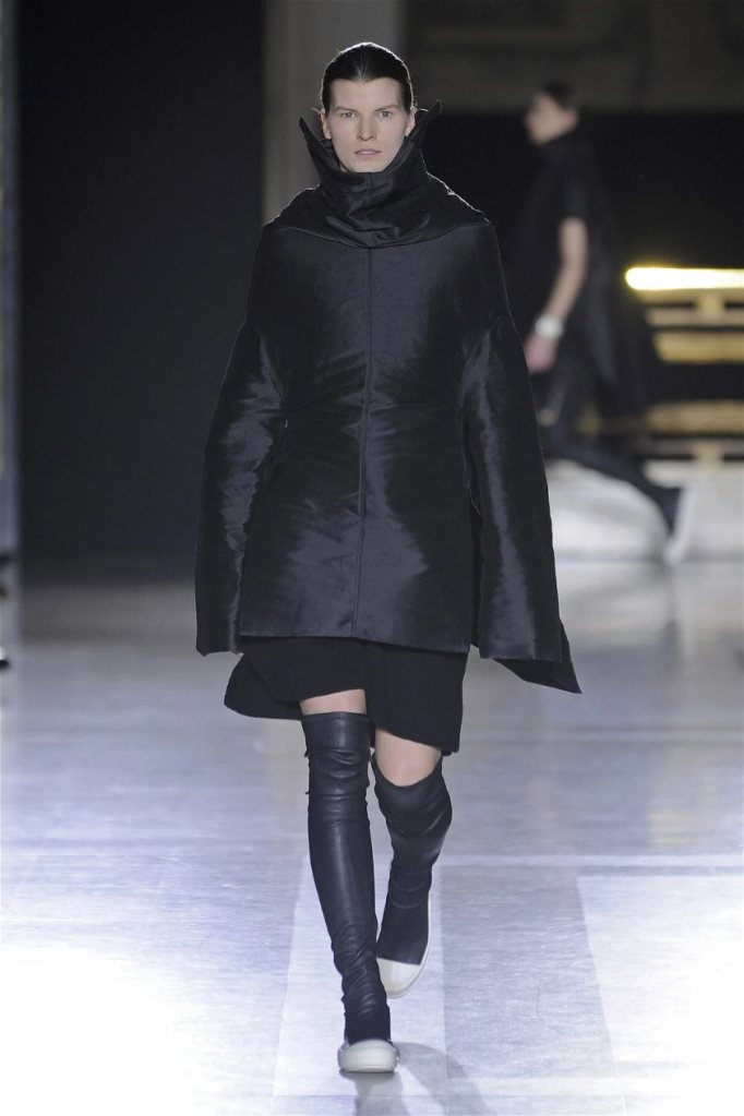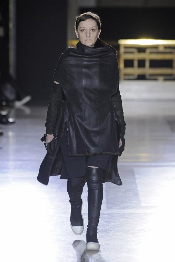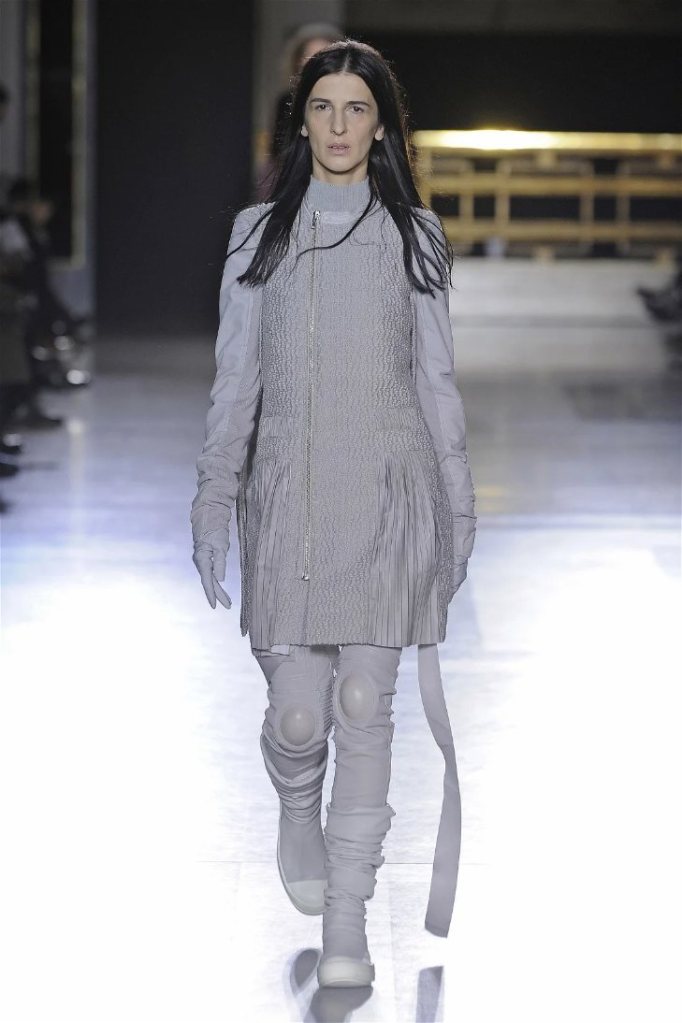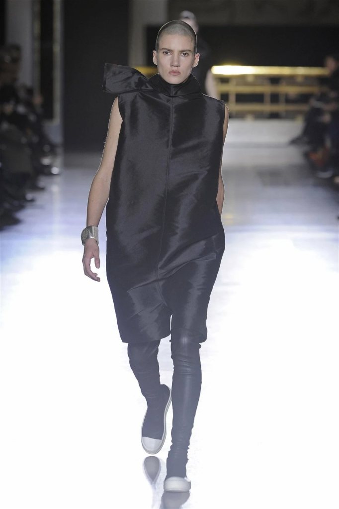 The clothes themselves embraced comfort and warmth—think cocooning capes, soft fabrics, and plush onesies. While Owens’ past shows have been known for their edginess, this collection offered something gentler, with a focus on love, protection, and communication. There was still an element of the warrior in the looks, with bold pieces like croc-printed shifts and motocross leather pants, but they were balanced by an overarching theme of family and unity. This collection is a testament to Owens’ ability to blend darkness with beauty,
