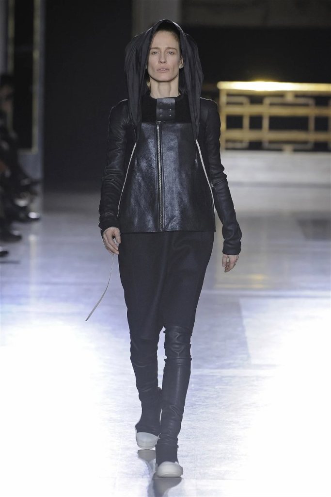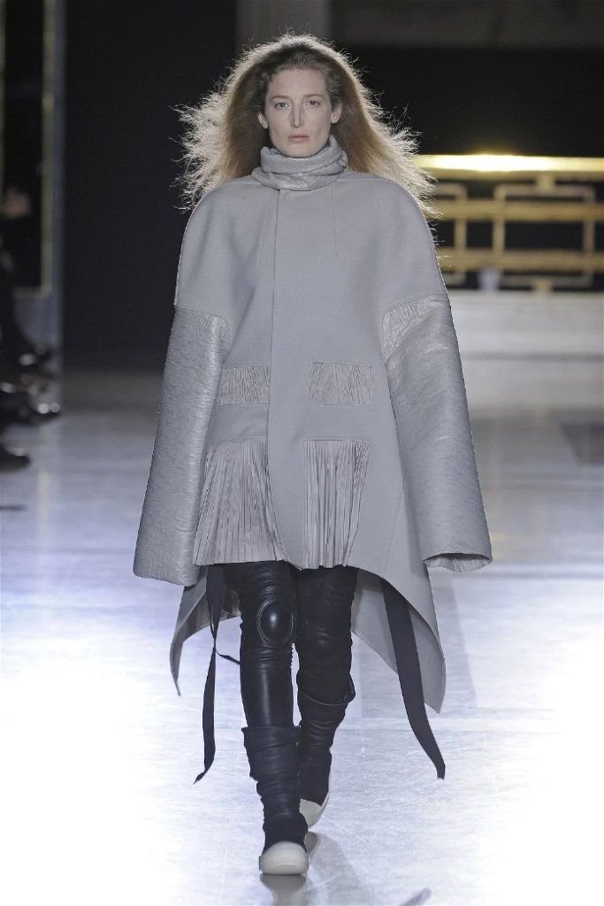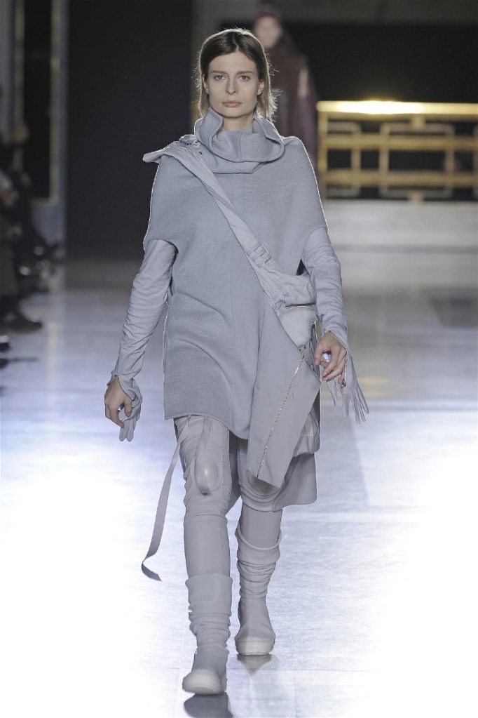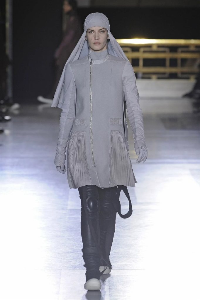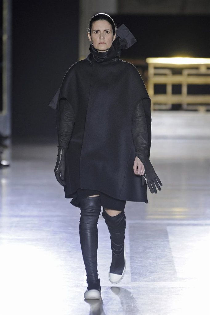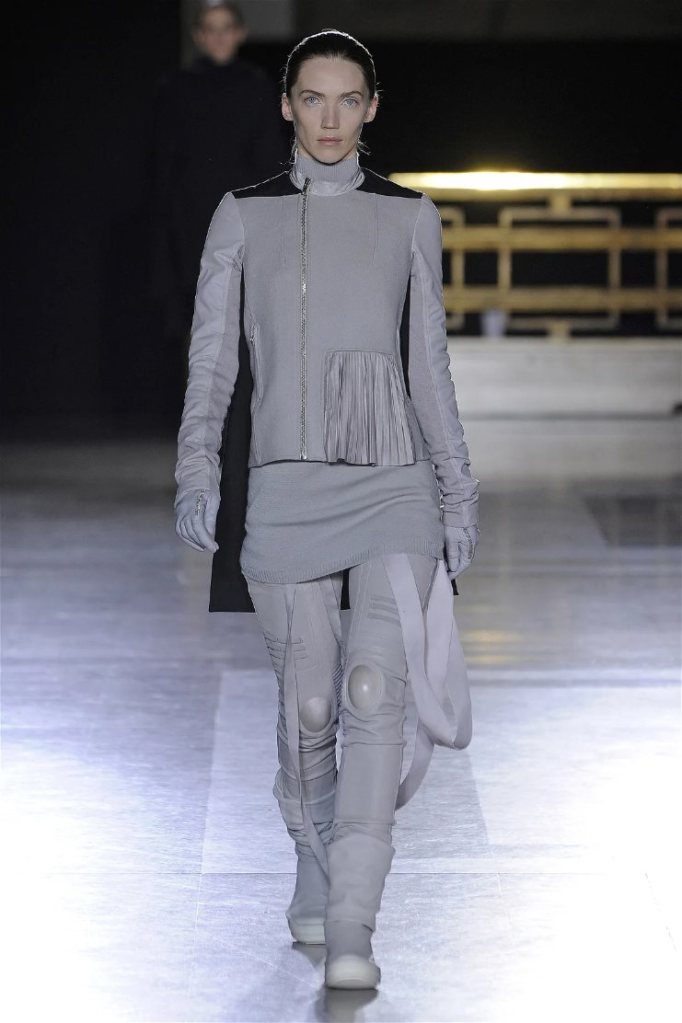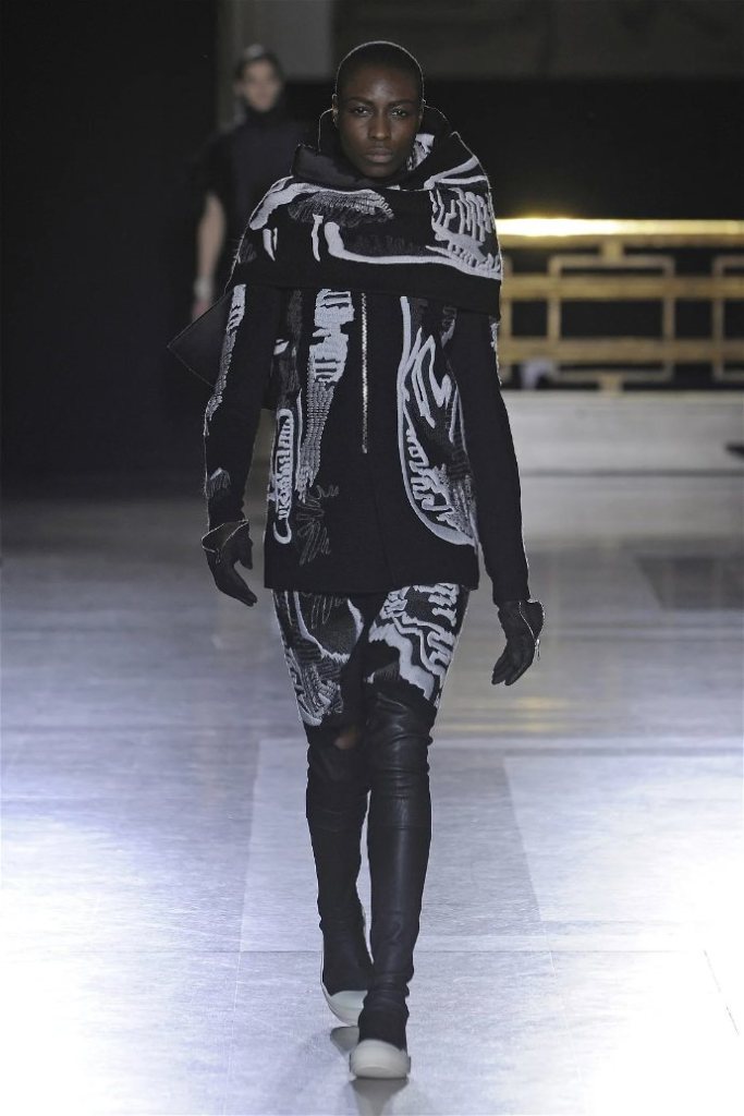 The clothes themselves embraced comfort and warmth—think cocooning capes, soft fabrics, and plush onesies. While Owens’ past shows have been known for their edginess, this collection offered something gentler, with a focus on love, protection, and communication. There was still an element of the warrior in the looks, with bold pieces like croc-printed shifts and motocross leather pants, but they were balanced by an overarching theme of family and unity. This collection is a testament to Owens’ ability to blend darkness with beauty,