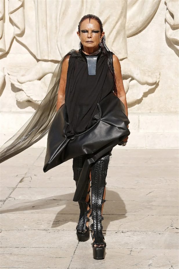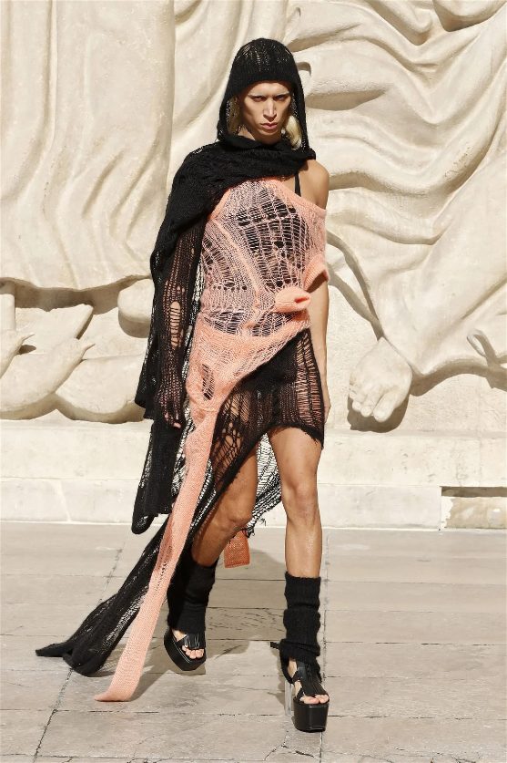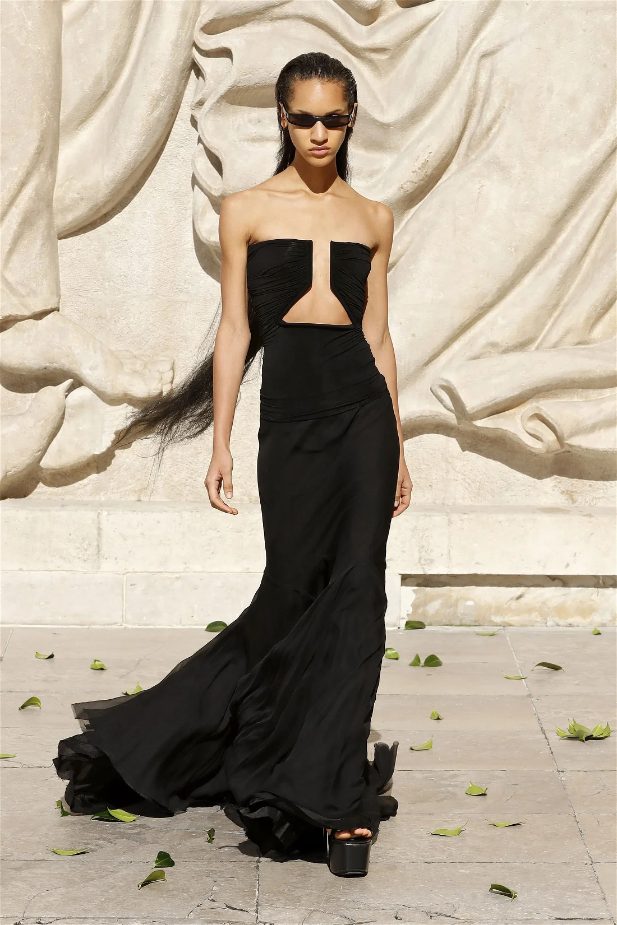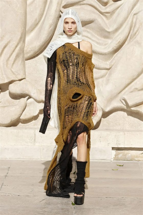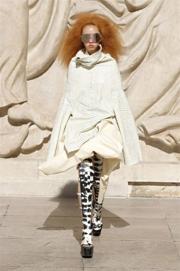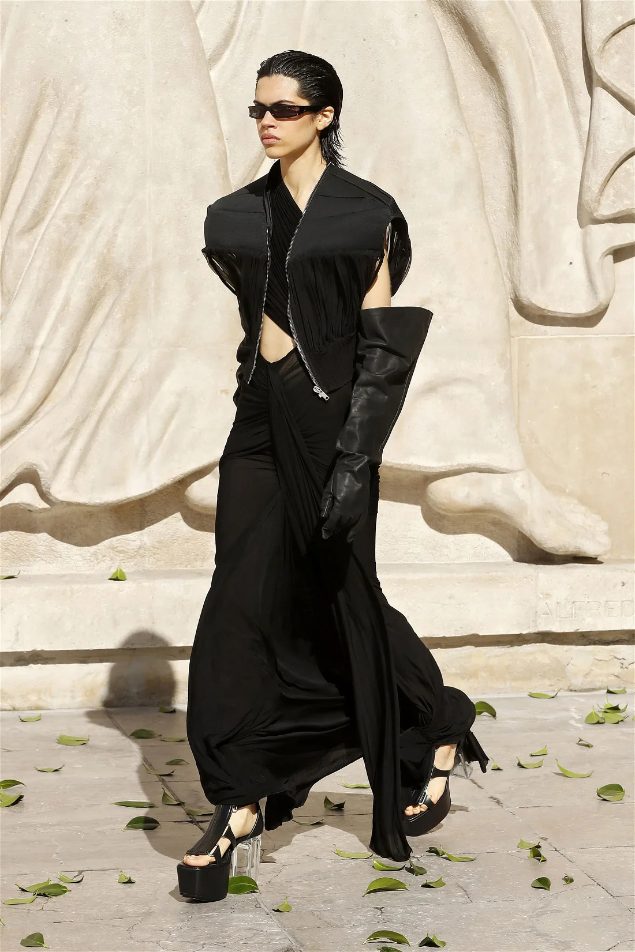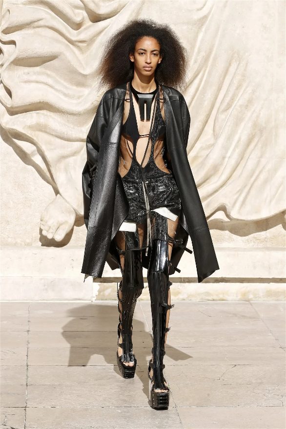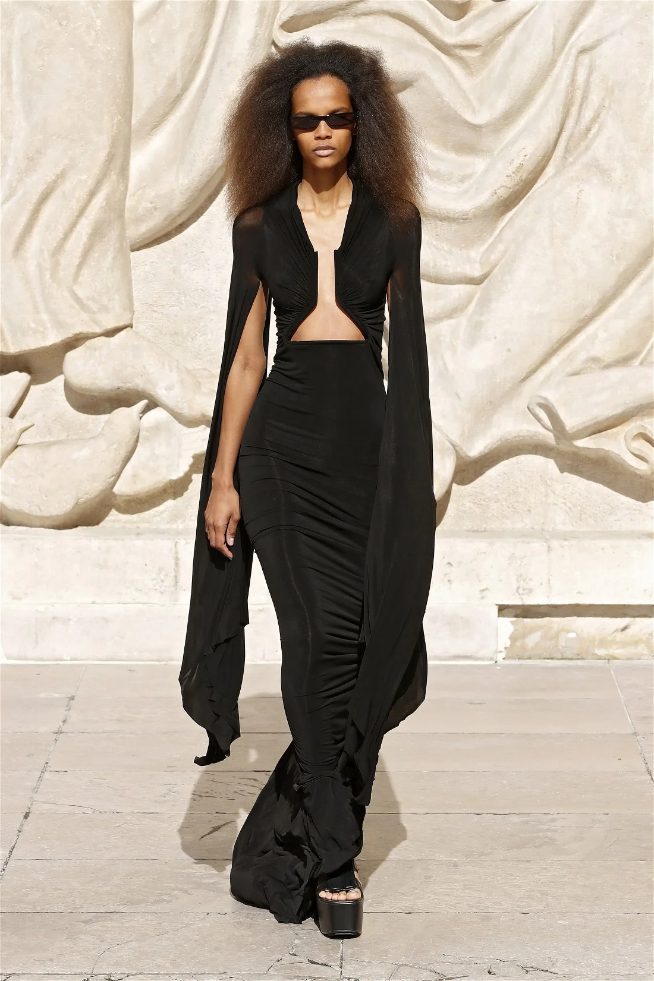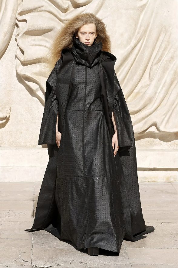 ‘Fogachine’ he called it, A quintessential Owens collection. Opened by his partner Michèle Lamy this collection was already off to a glorious start. Loads of leather, statement shoulders, spiderweb knits, structural skirts were the strong point in this collection along with some rather romantic looks in sunny colors (looks that were classic Rick Owens but also clothes you can dream in). Owen told WWD “I’ve got to make things that people can really appreciate, that are really pretty, really special and uniquely mine that supposedly no one else could come up with.”. A Black impeccably draped jersey gown with a sculptural neckline exemplifies this motive to perfection.