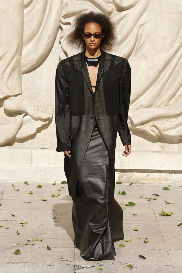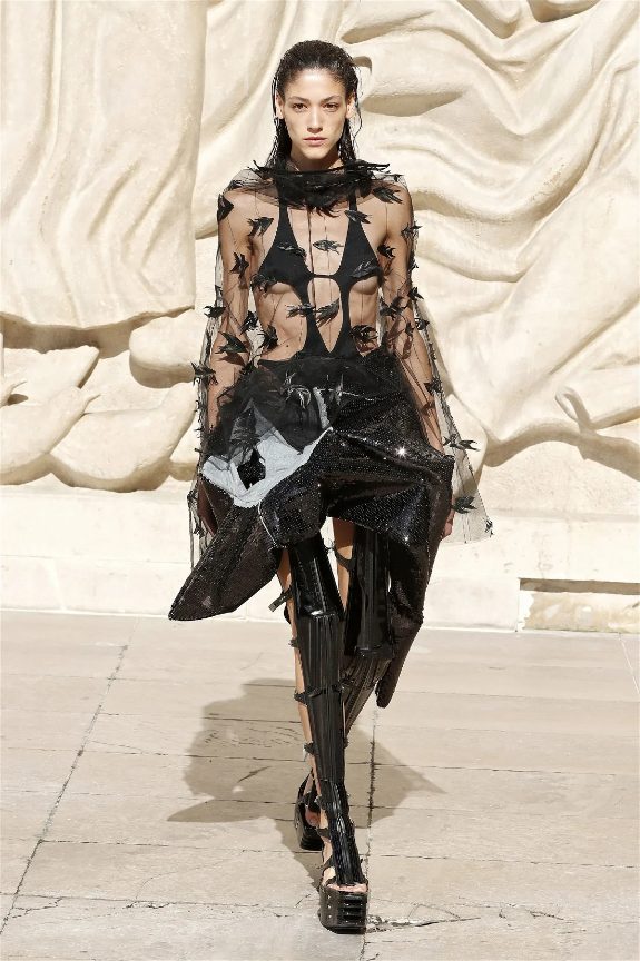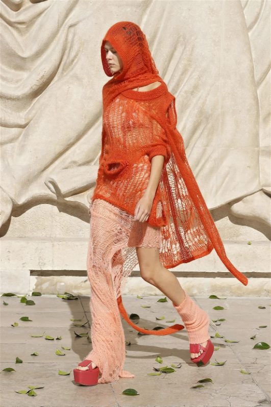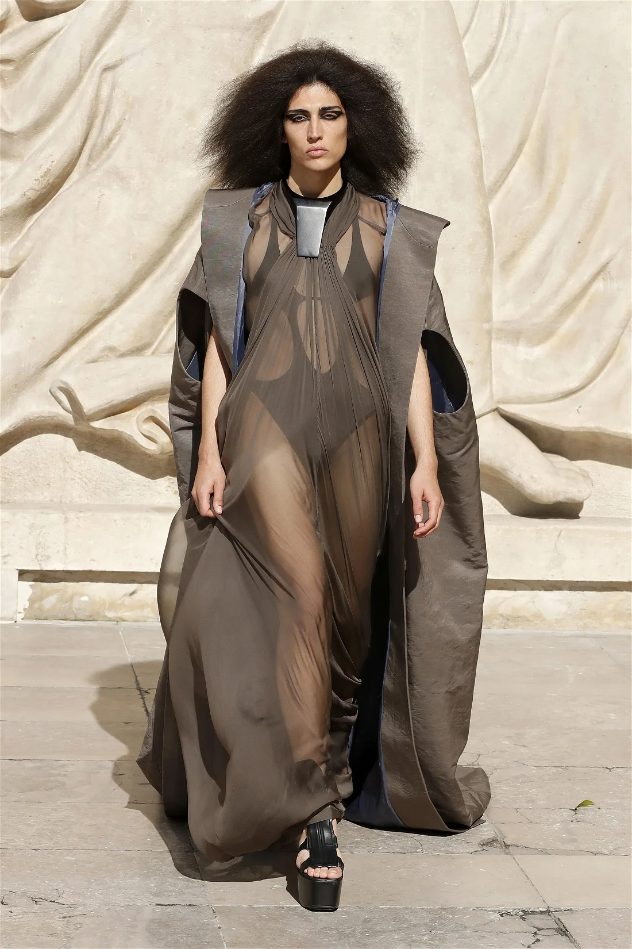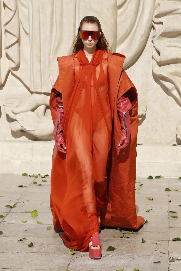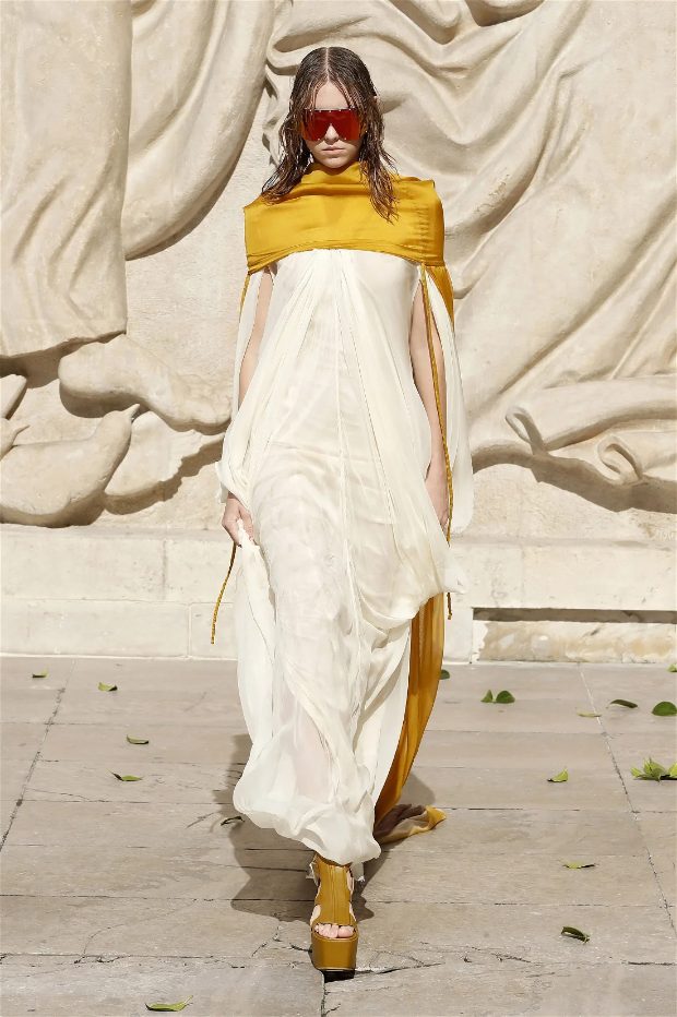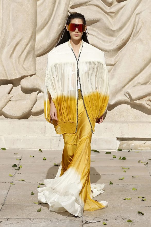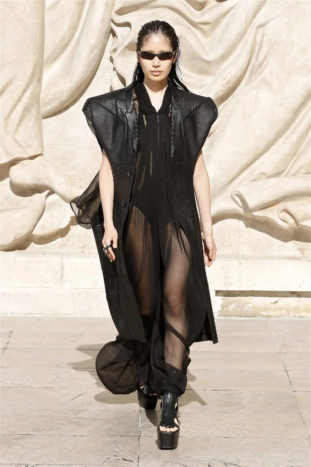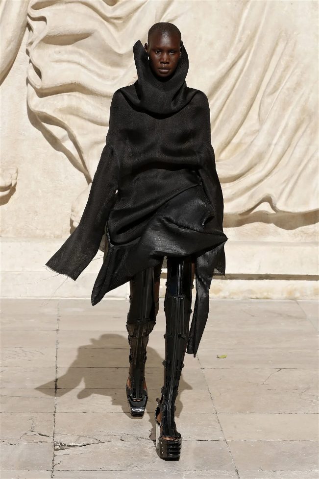 ‘Fogachine’ he called it, A quintessential Owens collection. Opened by his partner Michèle Lamy this collection was already off to a glorious start. Loads of leather, statement shoulders, spiderweb knits, structural skirts were the strong point in this collection along with some rather romantic looks in sunny colors (looks that were classic Rick Owens but also clothes you can dream in). Owen told WWD “I’ve got to make things that people can really appreciate, that are really pretty, really special and uniquely mine that supposedly no one else could come up with.”. A Black impeccably draped jersey gown with a sculptural neckline exemplifies this motive to perfection.
