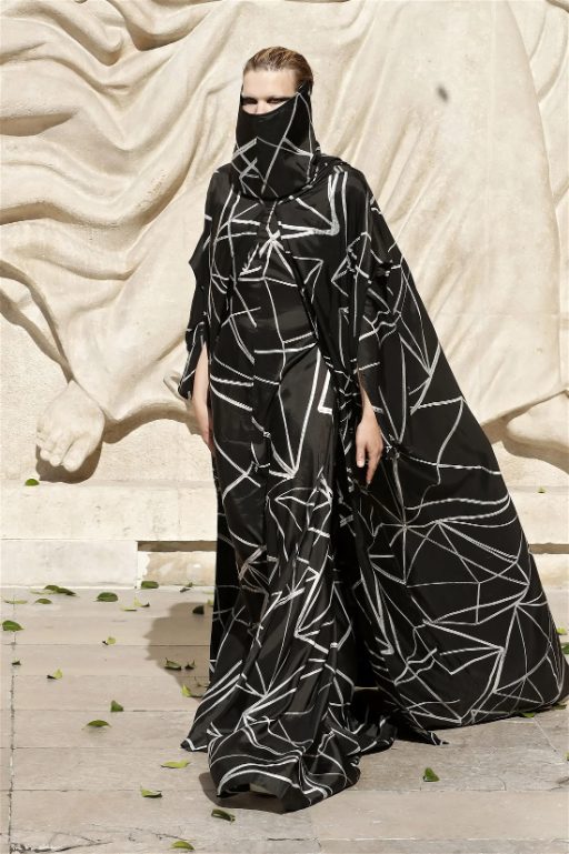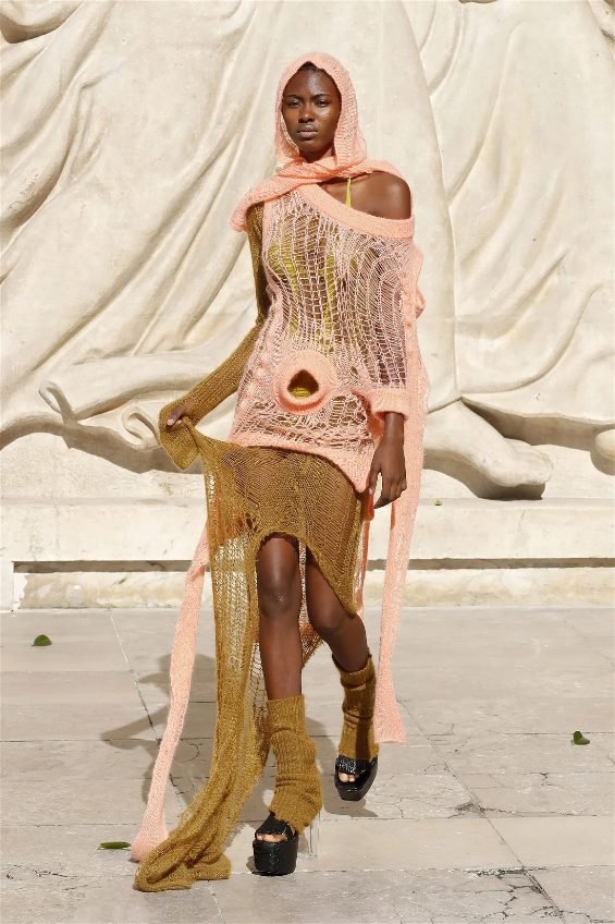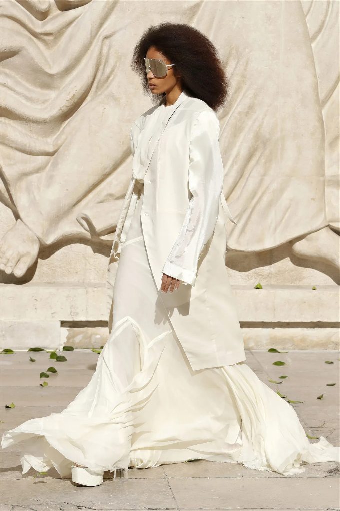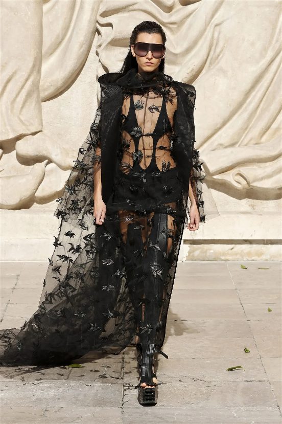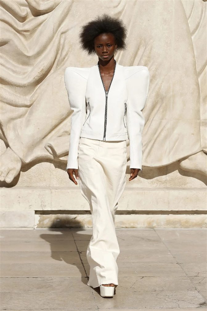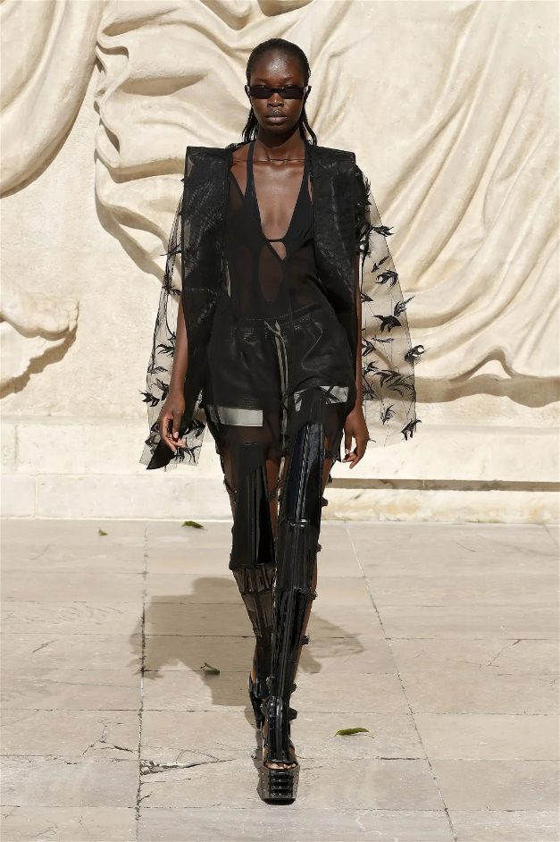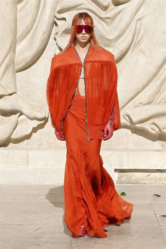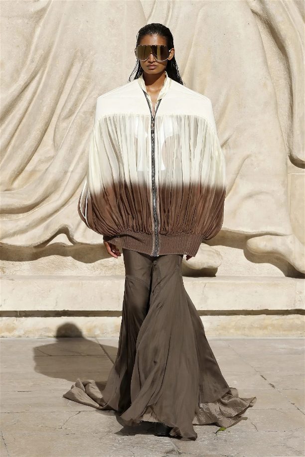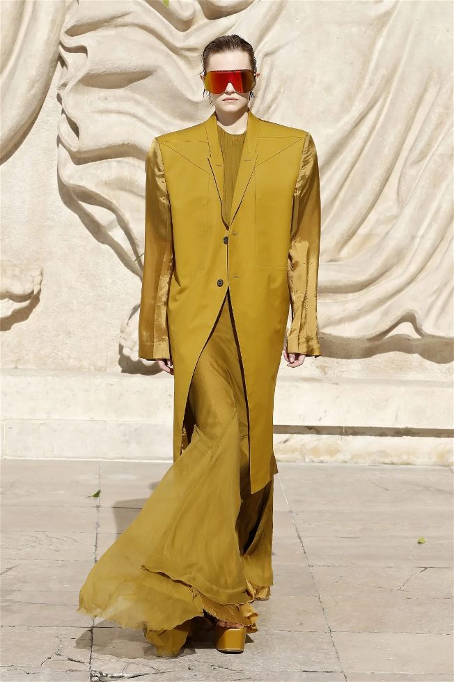 ‘Fogachine’ he called it, A quintessential Owens collection. Opened by his partner Michèle Lamy this collection was already off to a glorious start. Loads of leather, statement shoulders, spiderweb knits, structural skirts were the strong point in this collection along with some rather romantic looks in sunny colors (looks that were classic Rick Owens but also clothes you can dream in). Owen told WWD “I’ve got to make things that people can really appreciate, that are really pretty, really special and uniquely mine that supposedly no one else could come up with.”. A Black impeccably draped jersey gown with a sculptural neckline exemplifies this motive to perfection.