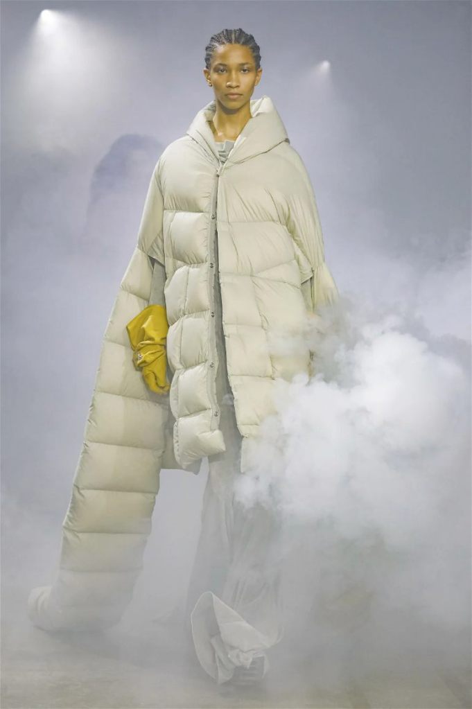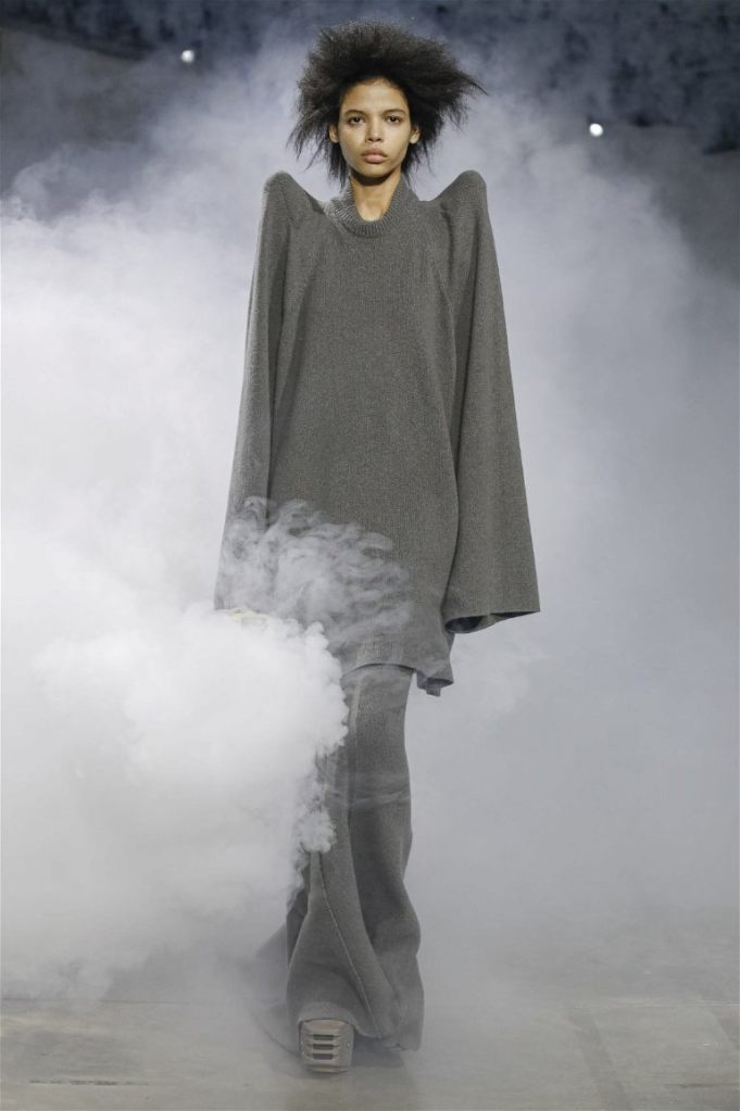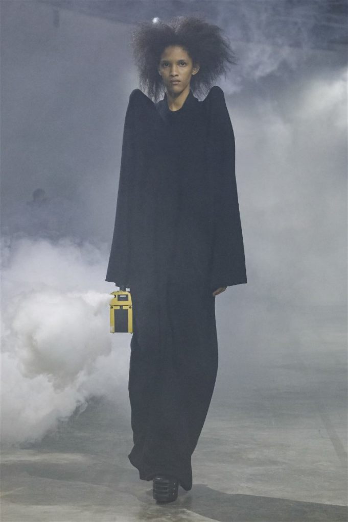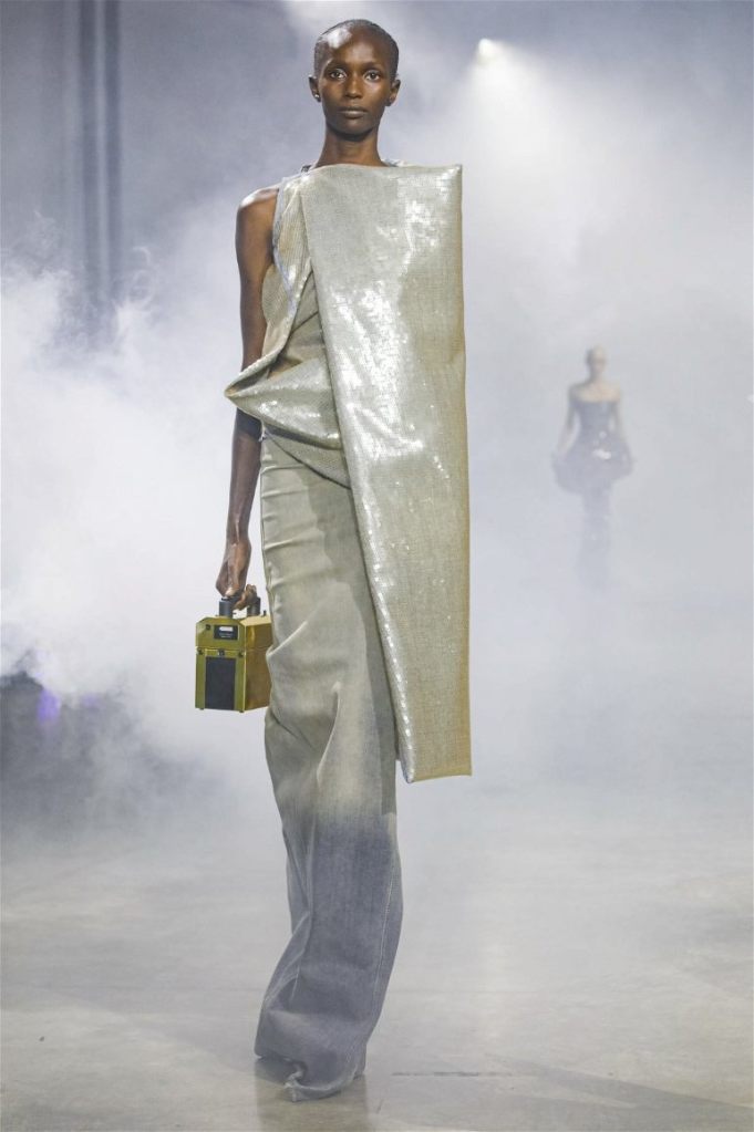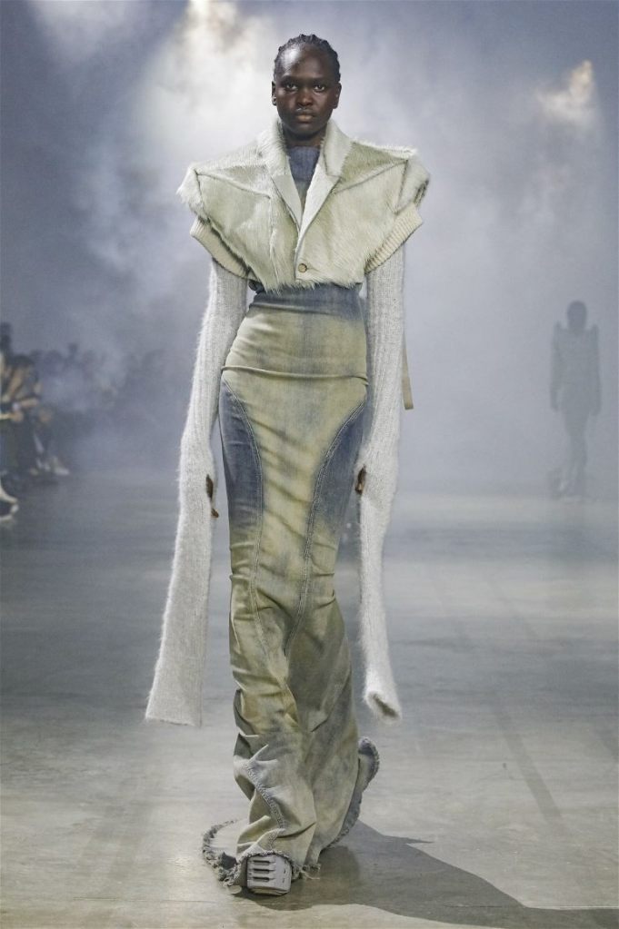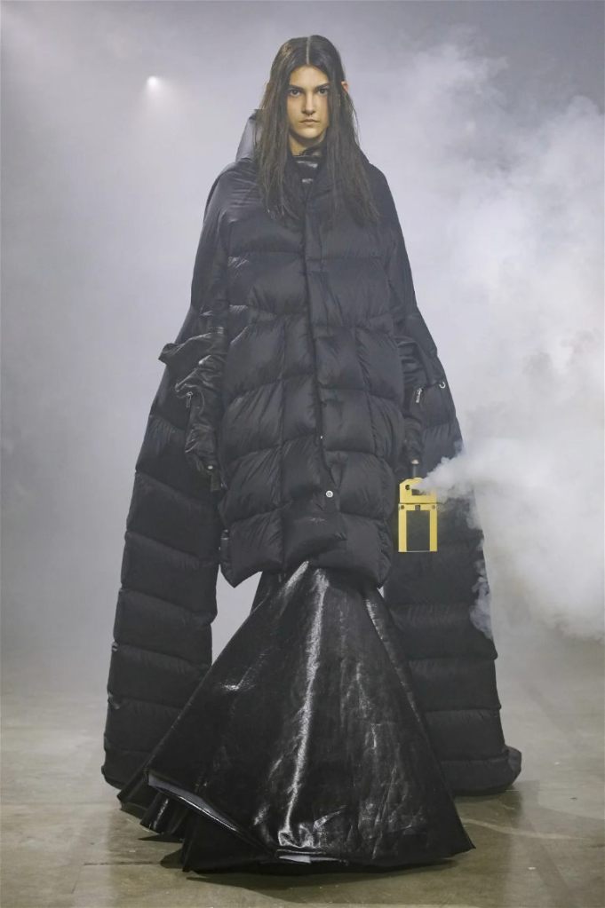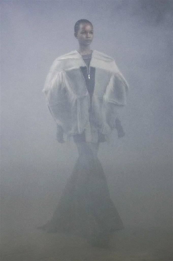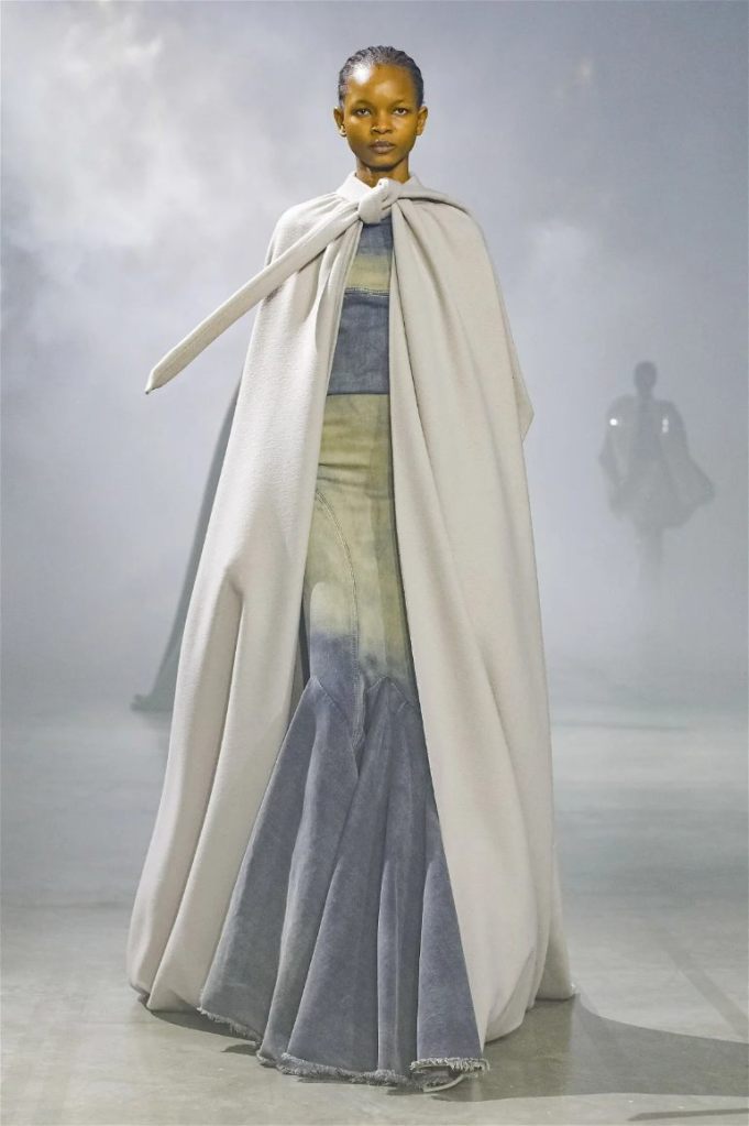 Goth gowns that were elegant, sequins that were not shiny, and colors were not black; a lot is happening in this collection. Anything can happen at Rick Owens something pretty cool did. Sculptural denim and puffer jackets were the biggest takeaway from this collection along with the bias-cut long skirts. The outerwear was simply magnificent; from dramatic capes to structured coats. The models were not just carrying fog machines but a reference to his catholic roots (thurible – an incense burner for religious services). The collection is a master class in restrained drama and glam.