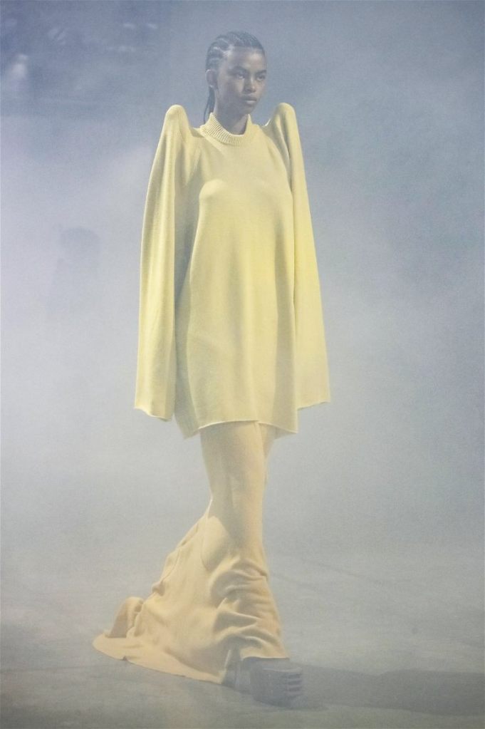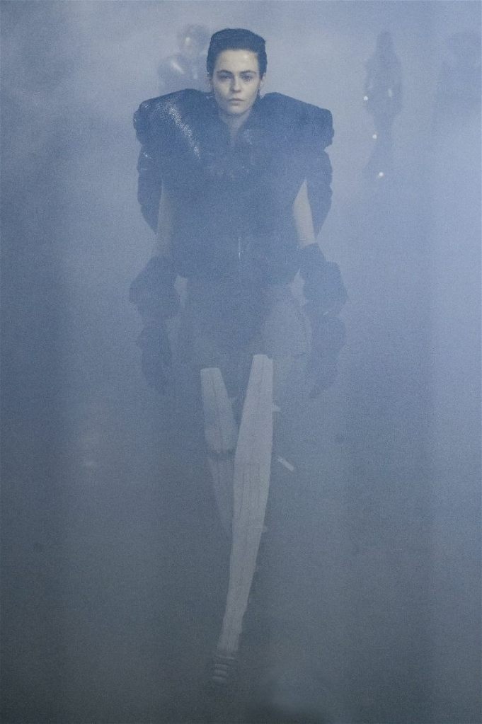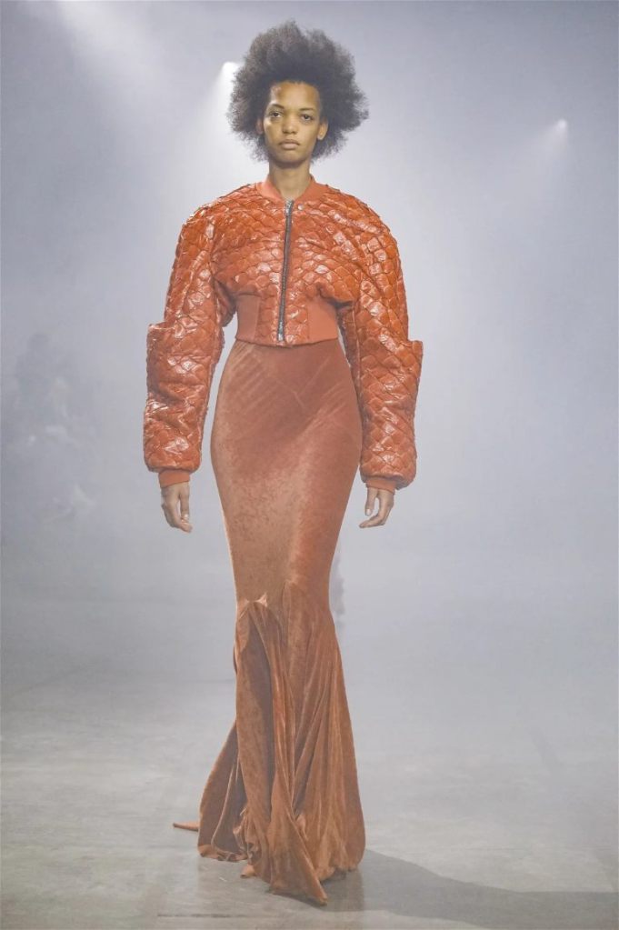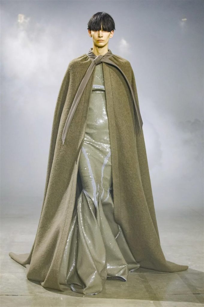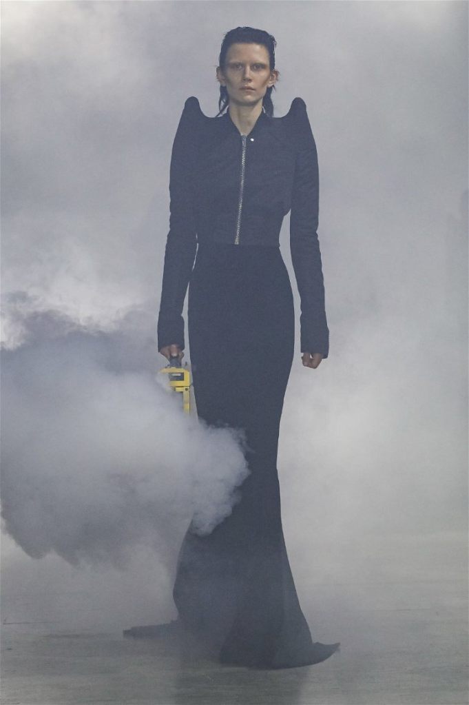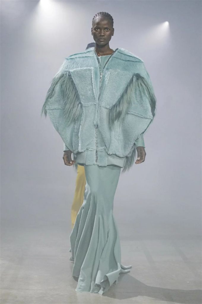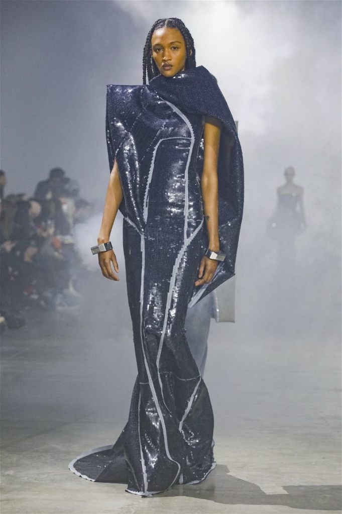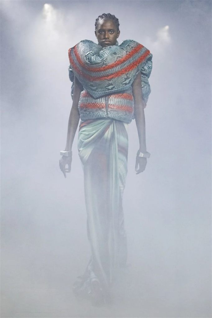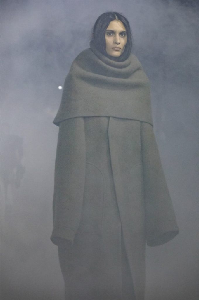 Goth gowns that were elegant, sequins that were not shiny, and colors were not black; a lot is happening in this collection. Anything can happen at Rick Owens something pretty cool did. Sculptural denim and puffer jackets were the biggest takeaway from this collection along with the bias-cut long skirts. The outerwear was simply magnificent; from dramatic capes to structured coats. The models were not just carrying fog machines but a reference to his catholic roots (thurible – an incense burner for religious services). The collection is a master class in restrained drama and glam.