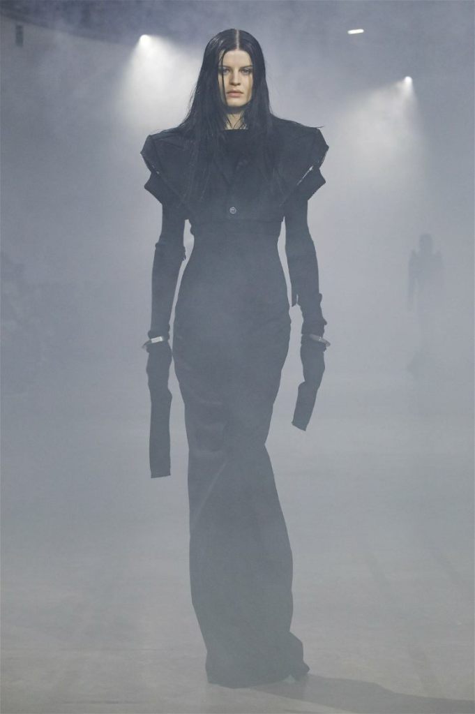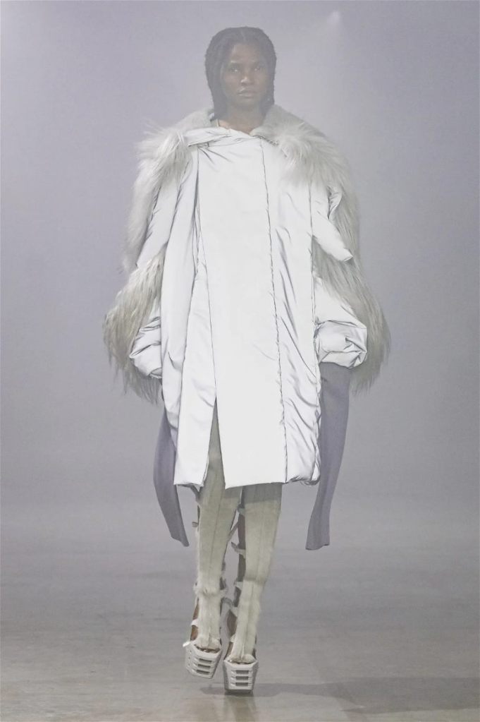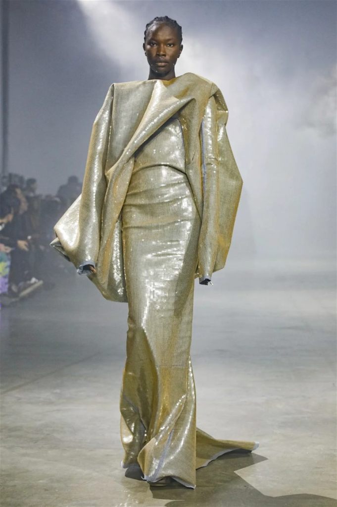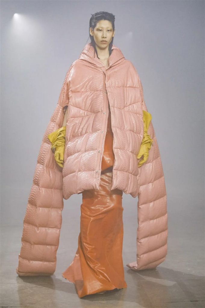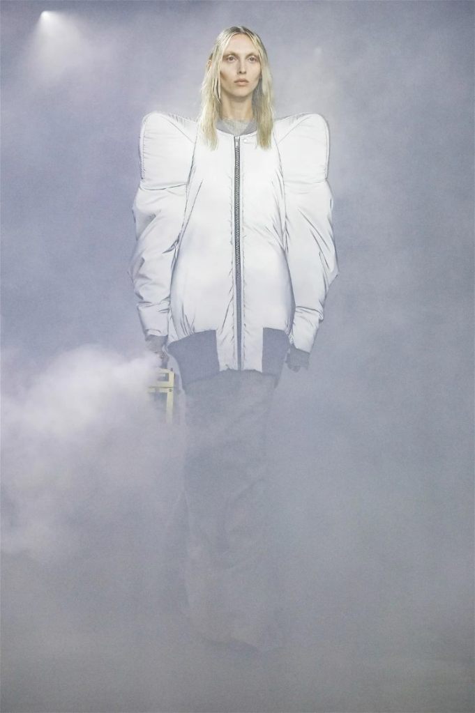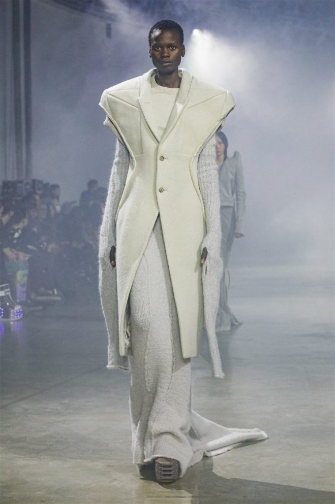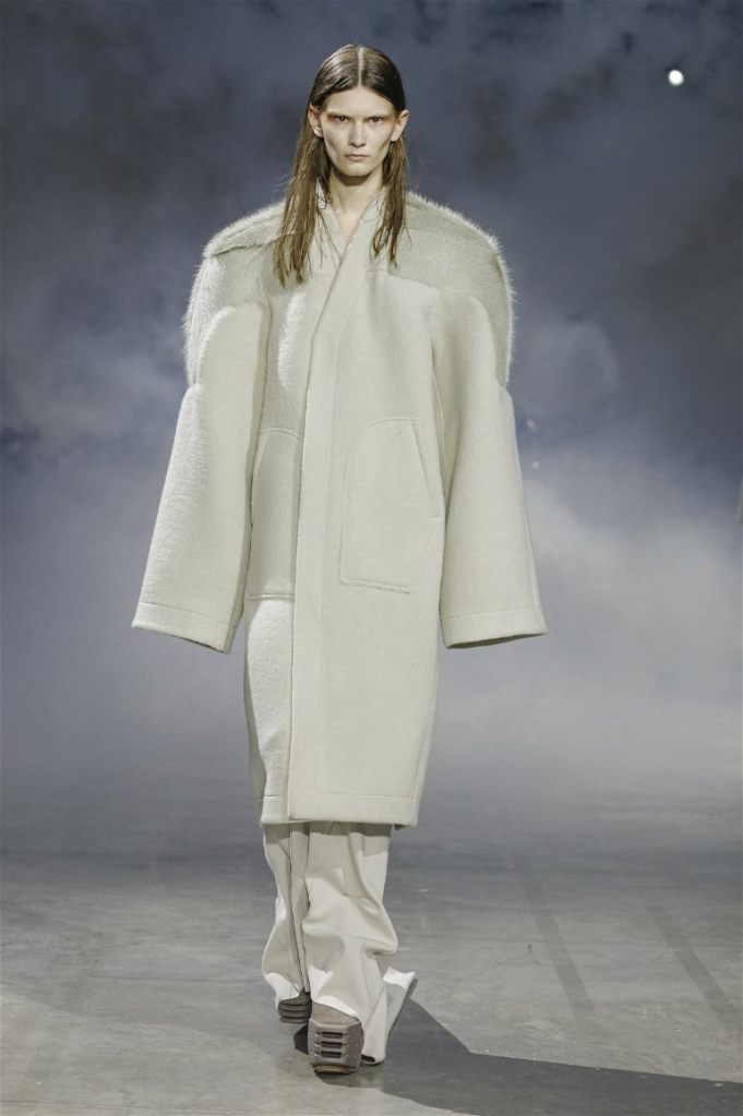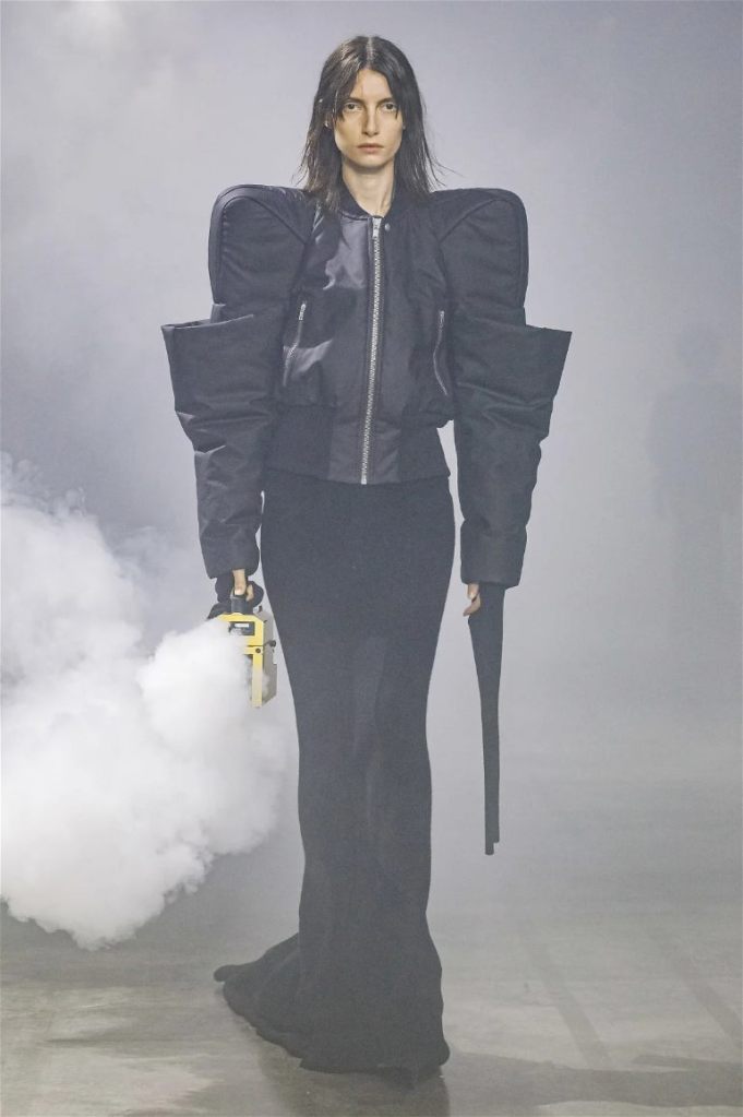 Goth gowns that were elegant, sequins that were not shiny, and colors were not black; a lot is happening in this collection. Anything can happen at Rick Owens something pretty cool did. Sculptural denim and puffer jackets were the biggest takeaway from this collection along with the bias-cut long skirts. The outerwear was simply magnificent; from dramatic capes to structured coats. The models were not just carrying fog machines but a reference to his catholic roots (thurible – an incense burner for religious services). The collection is a master class in restrained drama and glam.