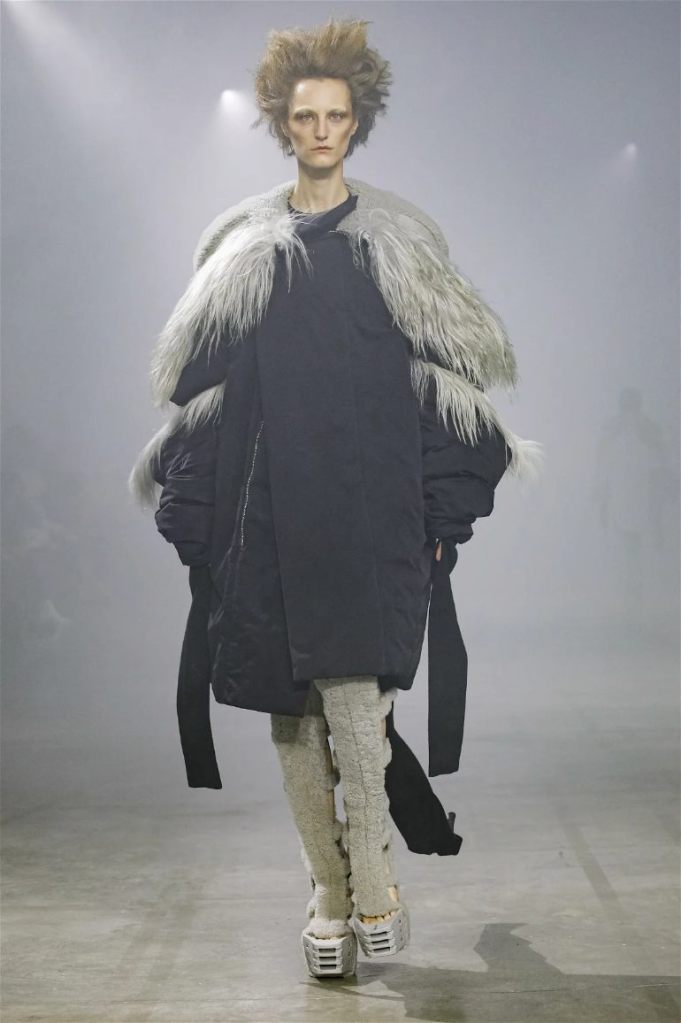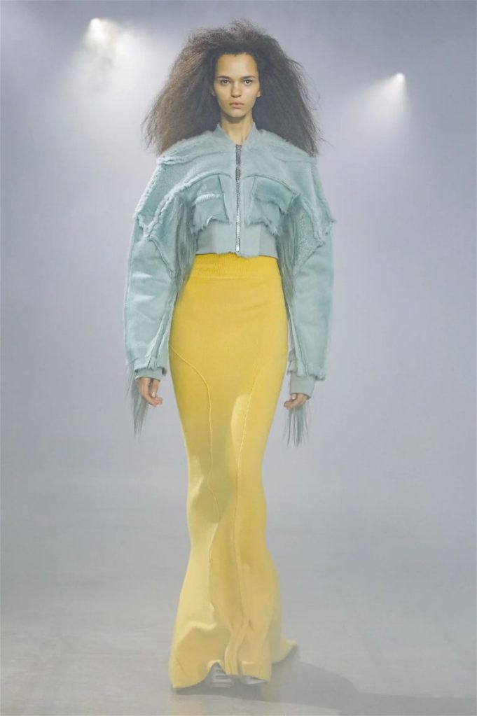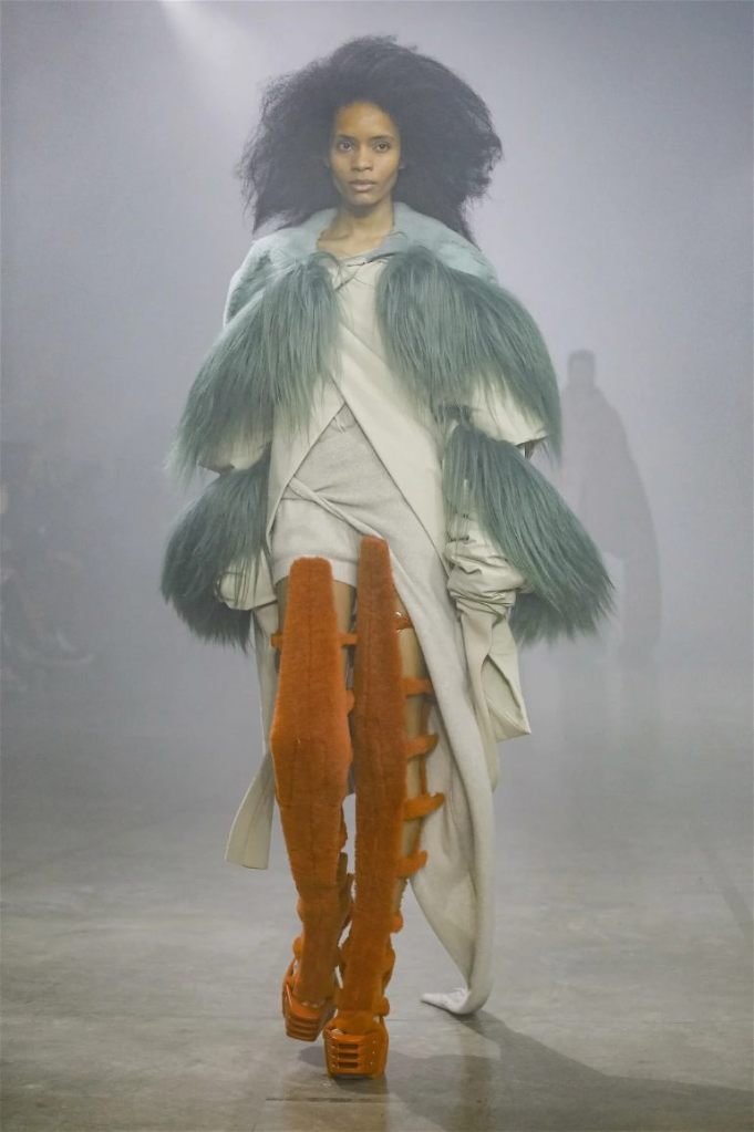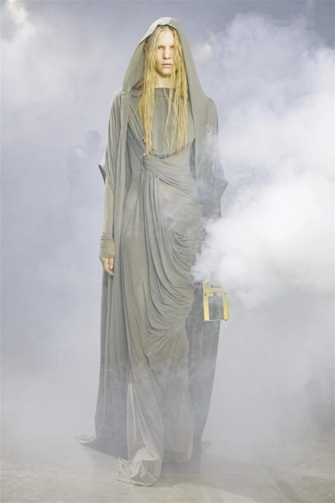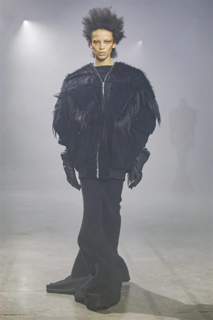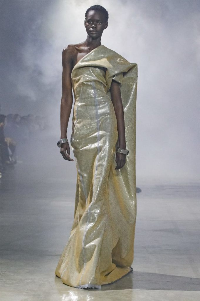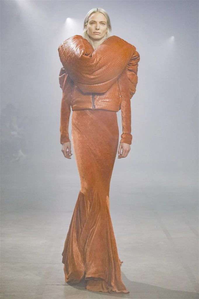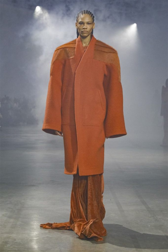 Goth gowns that were elegant, sequins that were not shiny, and colors were not black; a lot is happening in this collection. Anything can happen at Rick Owens something pretty cool did. Sculptural denim and puffer jackets were the biggest takeaway from this collection along with the bias-cut long skirts. The outerwear was simply magnificent; from dramatic capes to structured coats. The models were not just carrying fog machines but a reference to his catholic roots (thurible – an incense burner for religious services). The collection is a master class in restrained drama and glam.