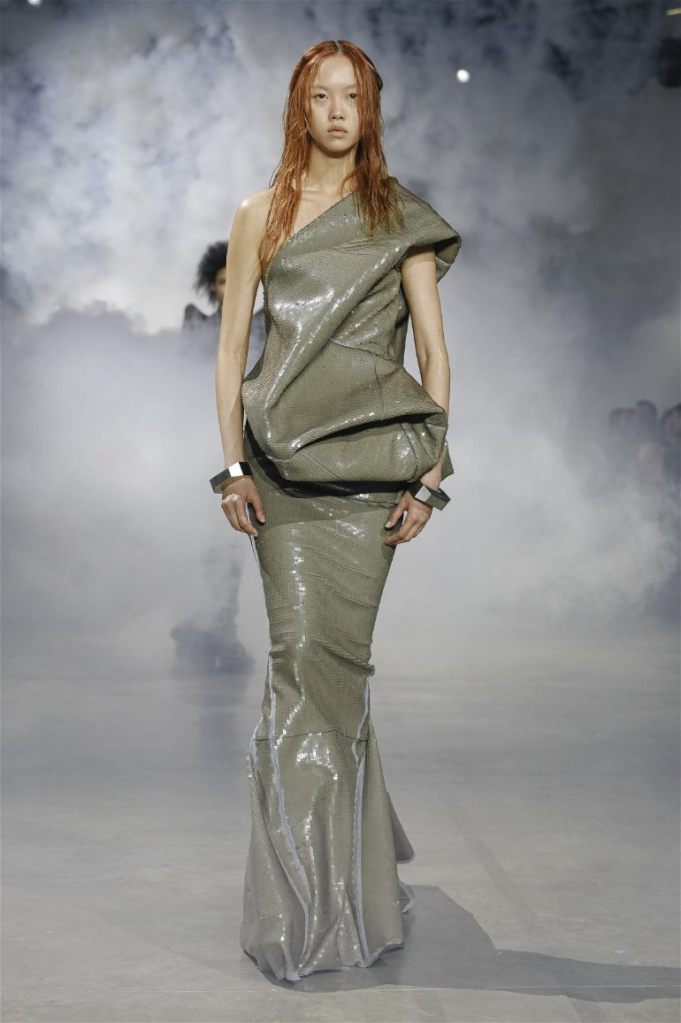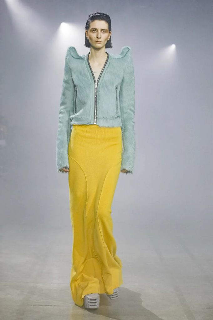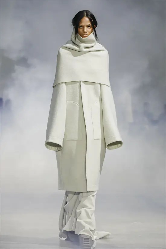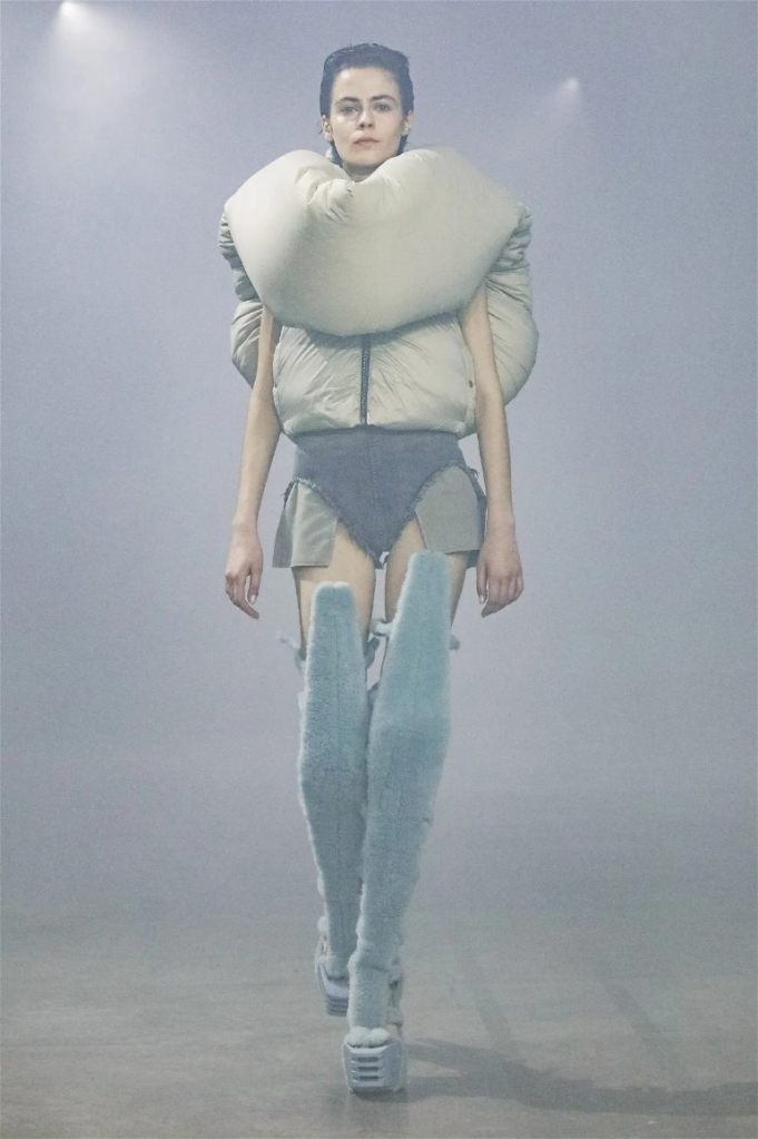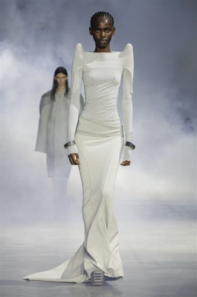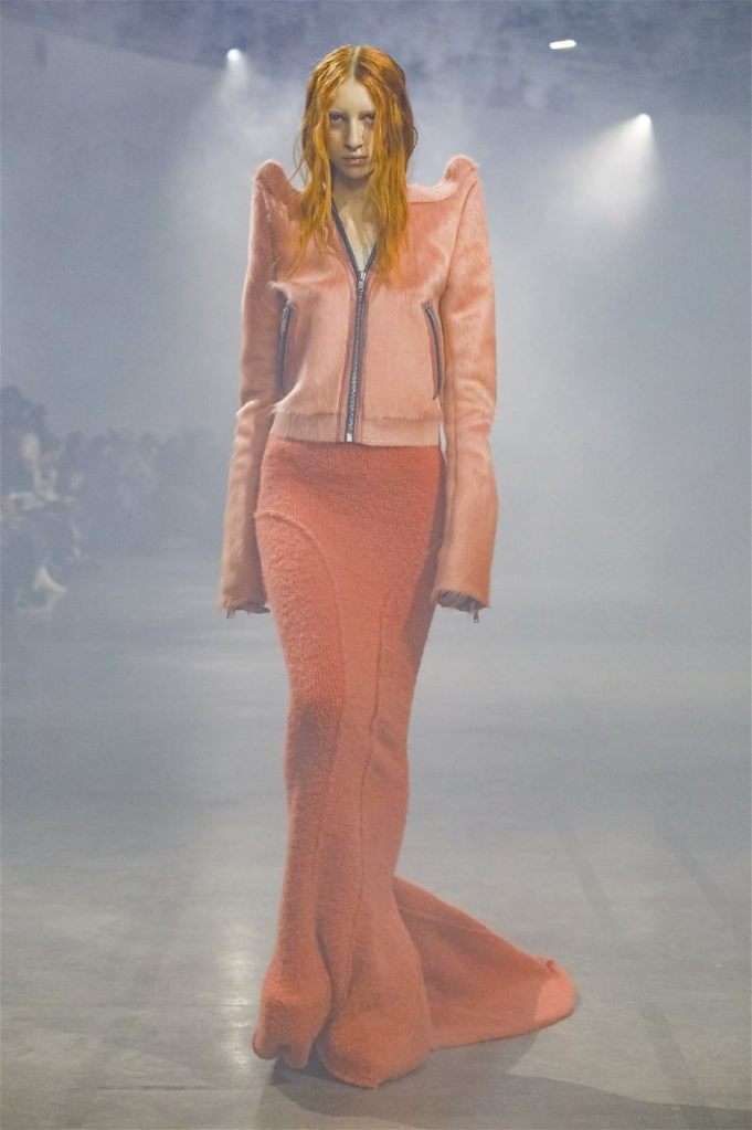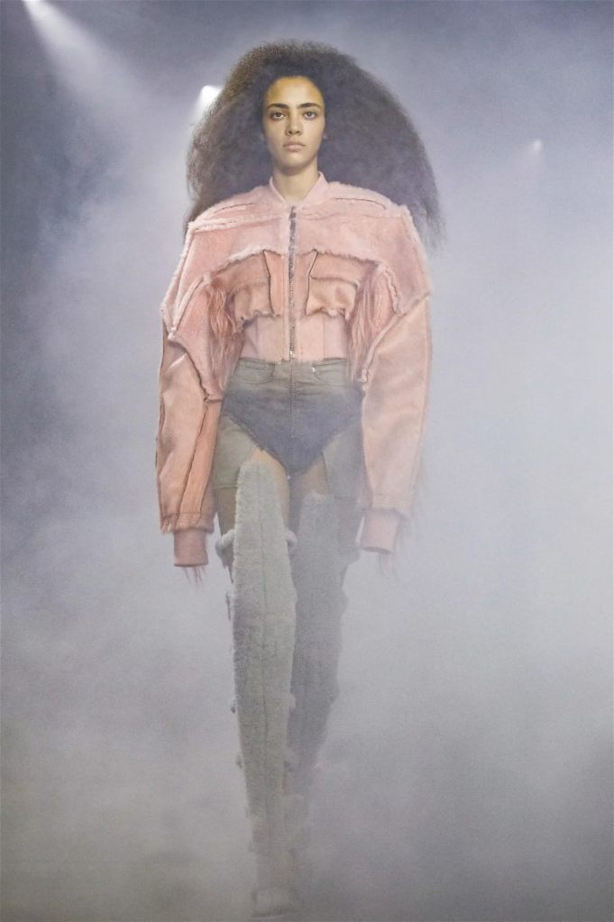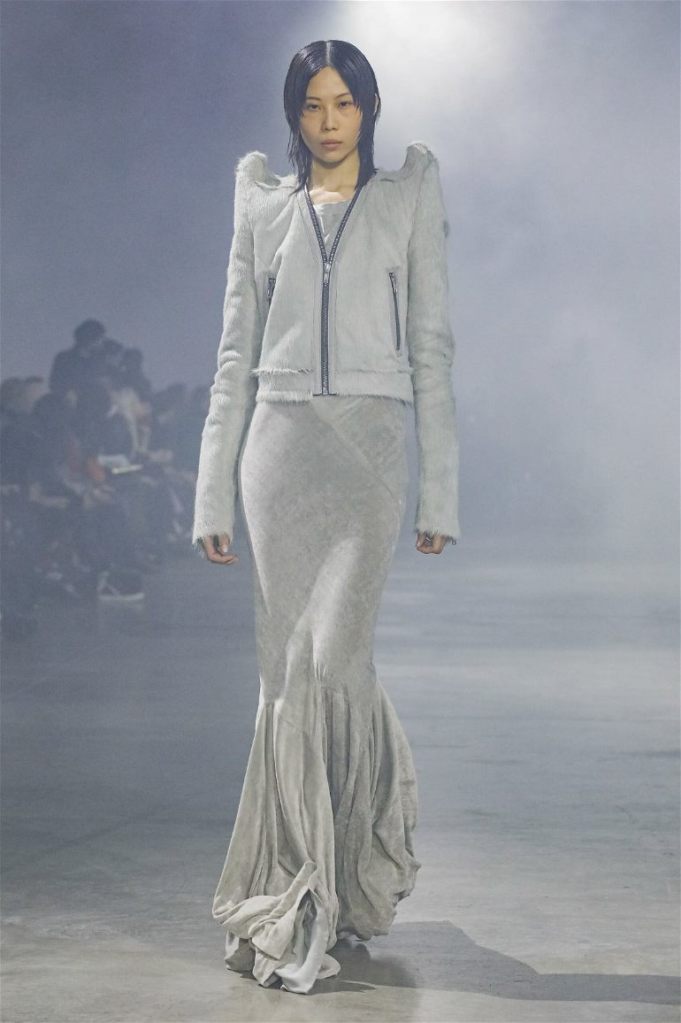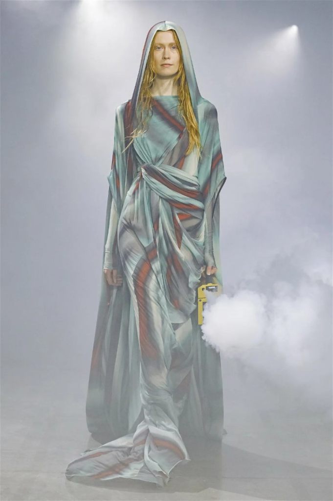 Goth gowns that were elegant, sequins that were not shiny, and colors were not black; a lot is happening in this collection. Anything can happen at Rick Owens something pretty cool did. Sculptural denim and puffer jackets were the biggest takeaway from this collection along with the bias-cut long skirts. The outerwear was simply magnificent; from dramatic capes to structured coats. The models were not just carrying fog machines but a reference to his catholic roots (thurible – an incense burner for religious services). The collection is a master class in restrained drama and glam.
