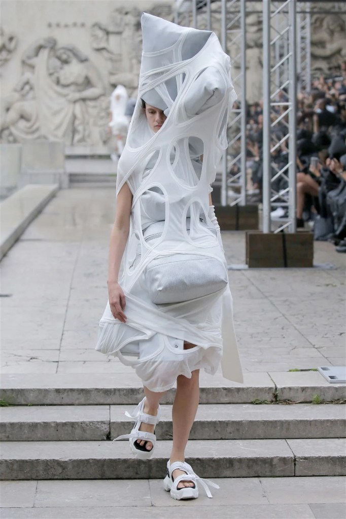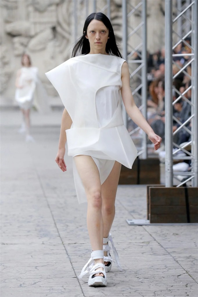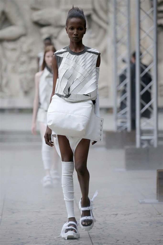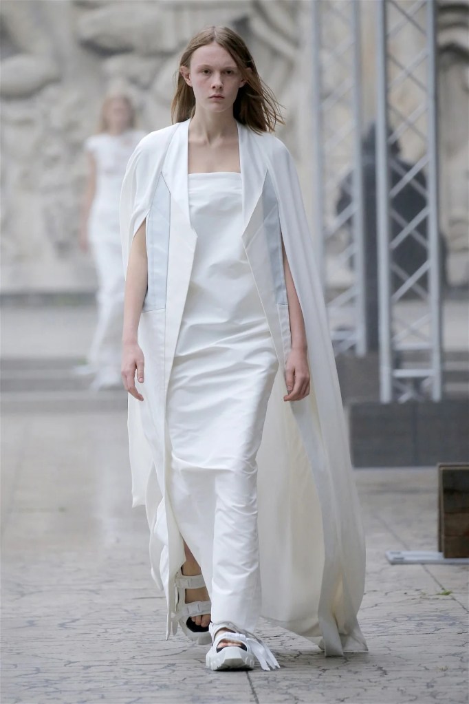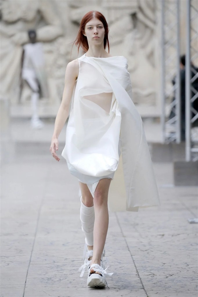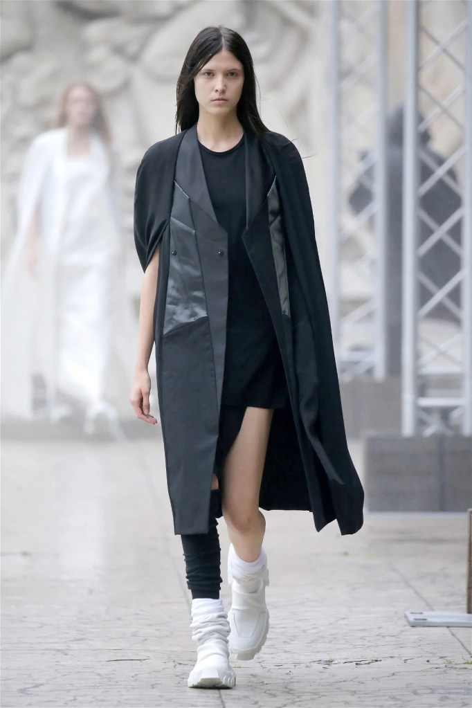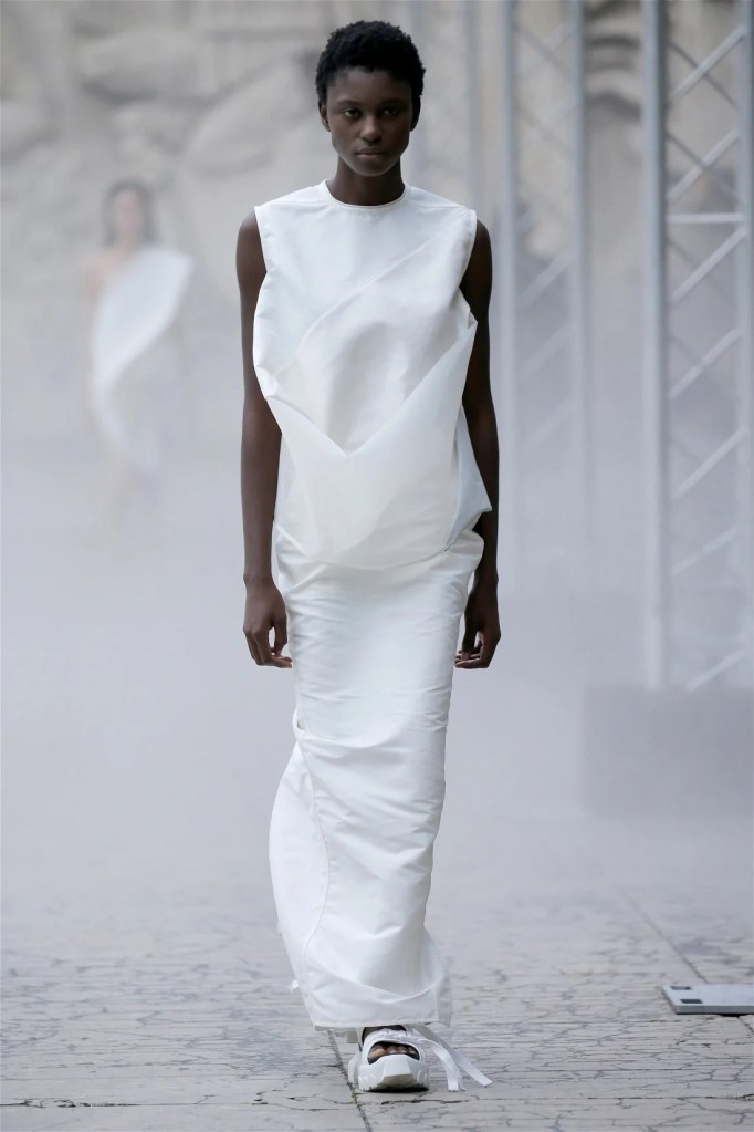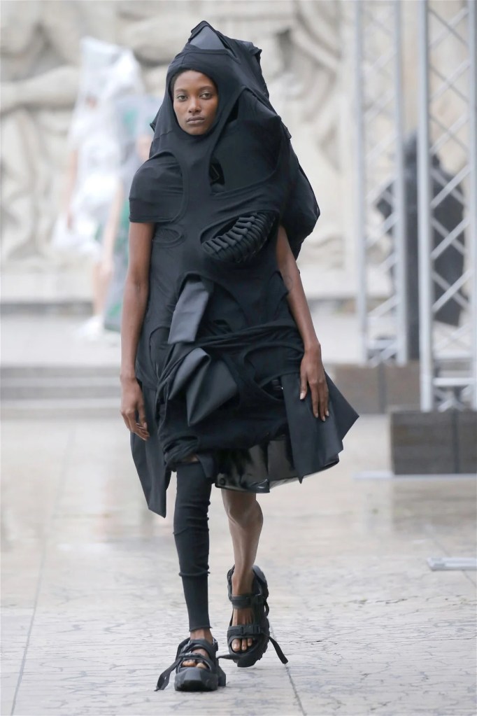 The collection features a mix of flowing silhouettes and structured designs, often playing with proportions. Models walked the runway in layered outfits that combined sheer fabrics with bold shapes, creating an ethereal yet powerful look. The color palette leaned heavily on muted tones, primarily blacks and whites, which is characteristic of Owens’ aesthetic. This choice allows the intricate details of each piece to stand out without overwhelming the viewer.