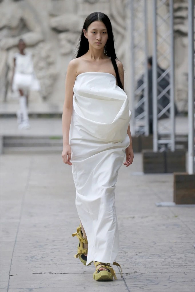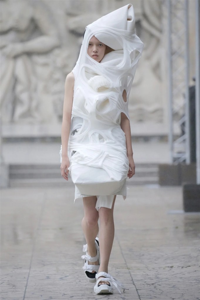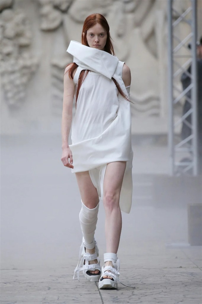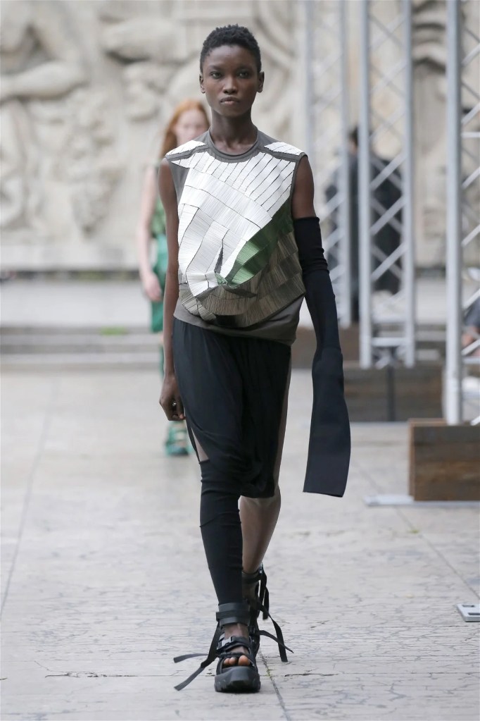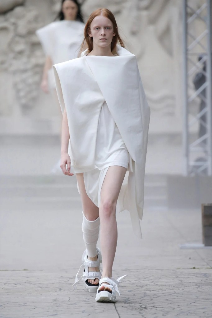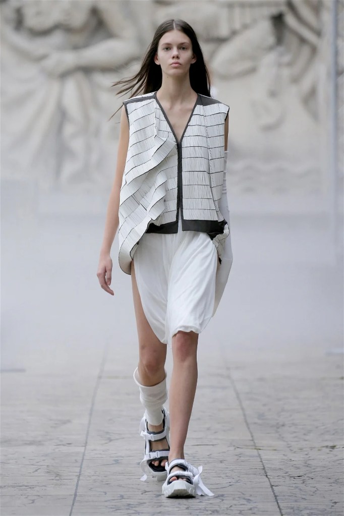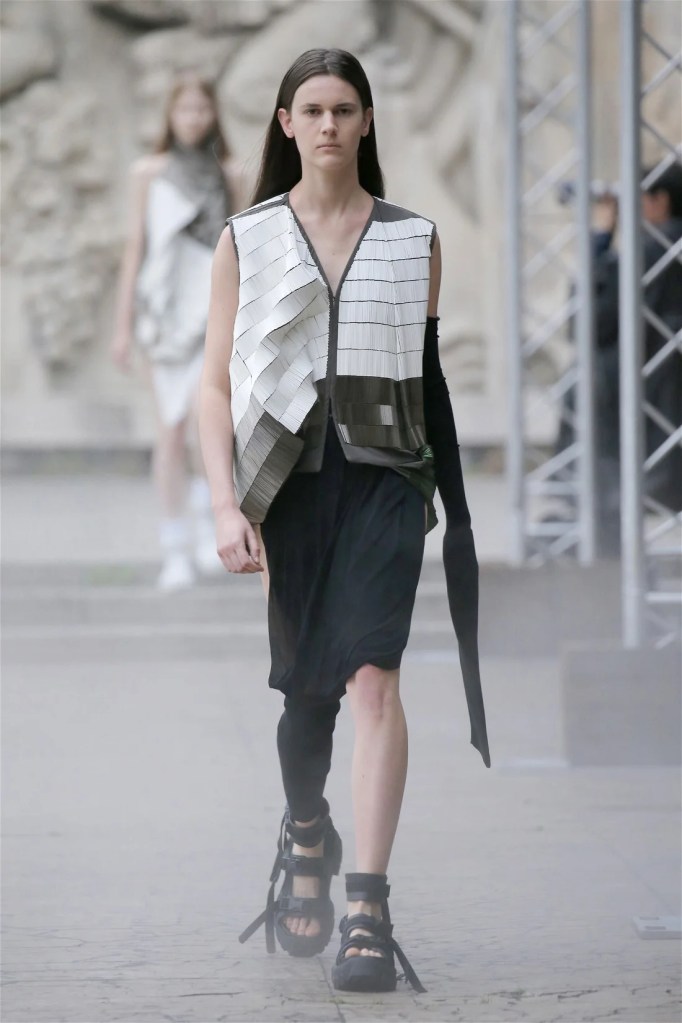 The collection features a mix of flowing silhouettes and structured designs, often playing with proportions. Models walked the runway in layered outfits that combined sheer fabrics with bold shapes, creating an ethereal yet powerful look. The color palette leaned heavily on muted tones, primarily blacks and whites, which is characteristic of Owens’ aesthetic. This choice allows the intricate details of each piece to stand out without overwhelming the viewer.