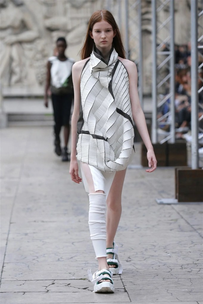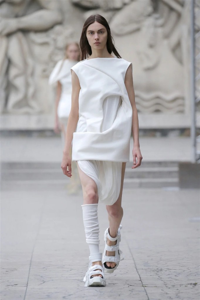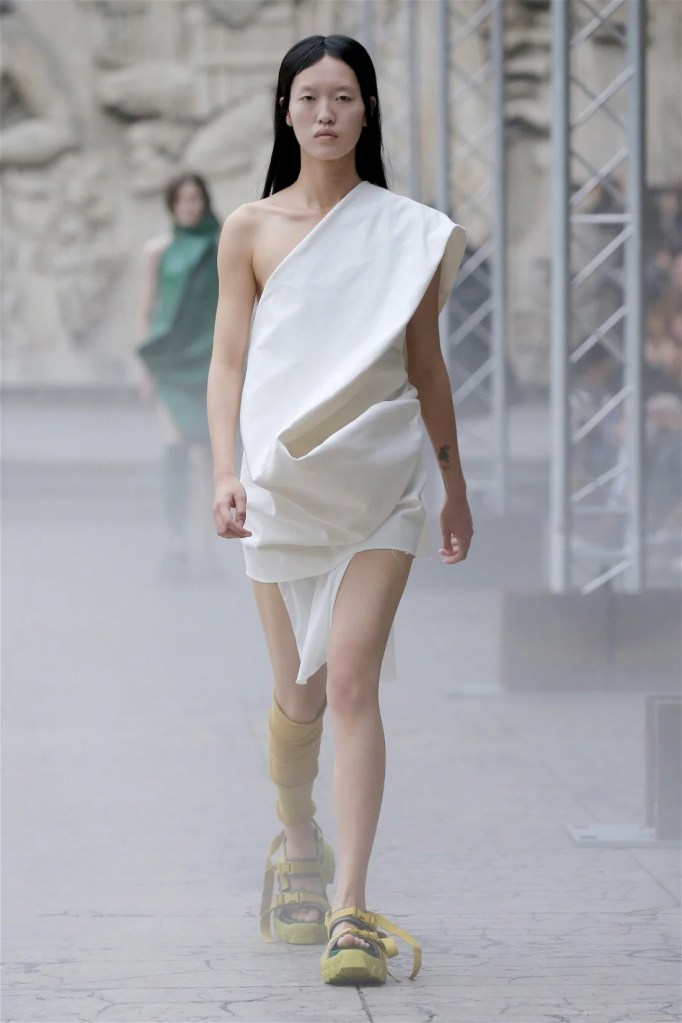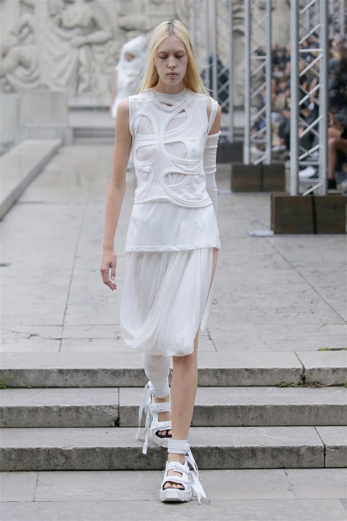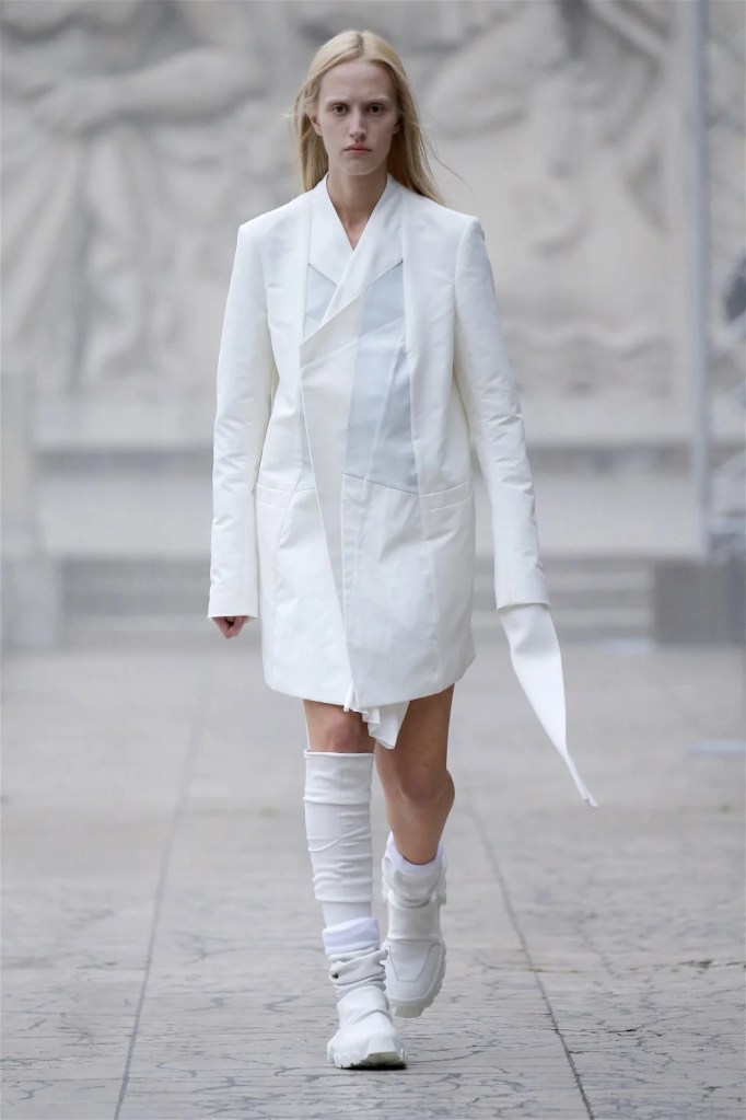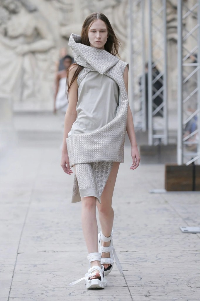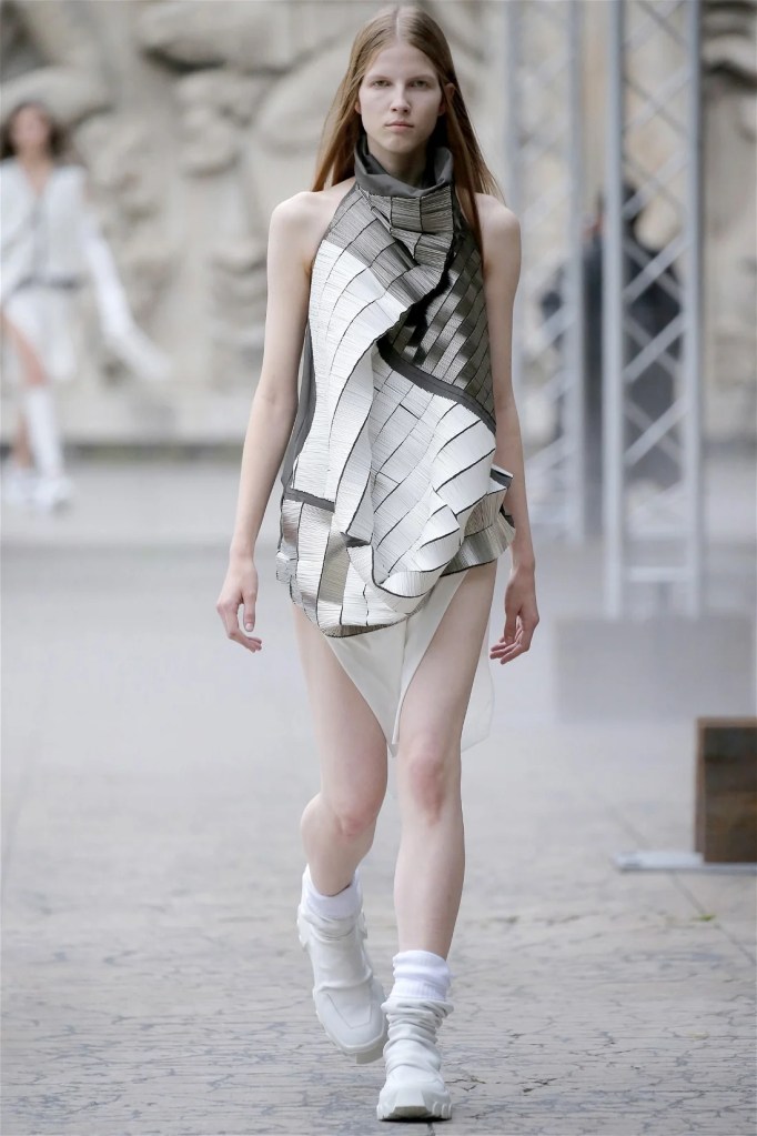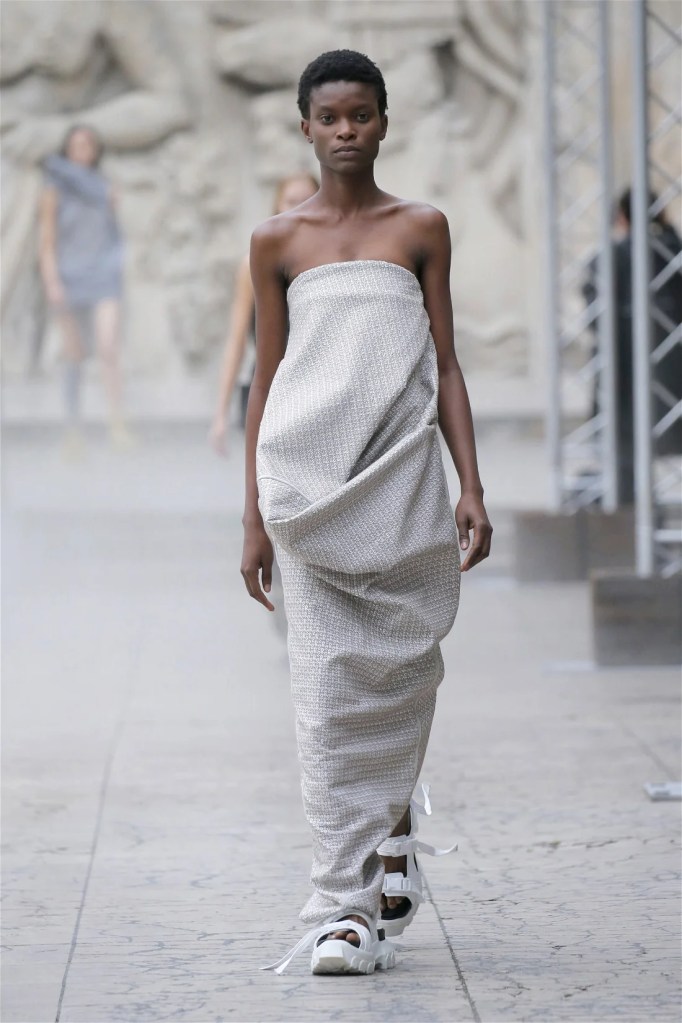The collection features a mix of flowing silhouettes and structured designs, often playing with proportions. Models walked the runway in layered outfits that combined sheer fabrics with bold shapes, creating an ethereal yet powerful look. The color palette leaned heavily on muted tones, primarily blacks and whites, which is characteristic of Owens’ aesthetic. This choice allows the intricate details of each piece to stand out without overwhelming the viewer.